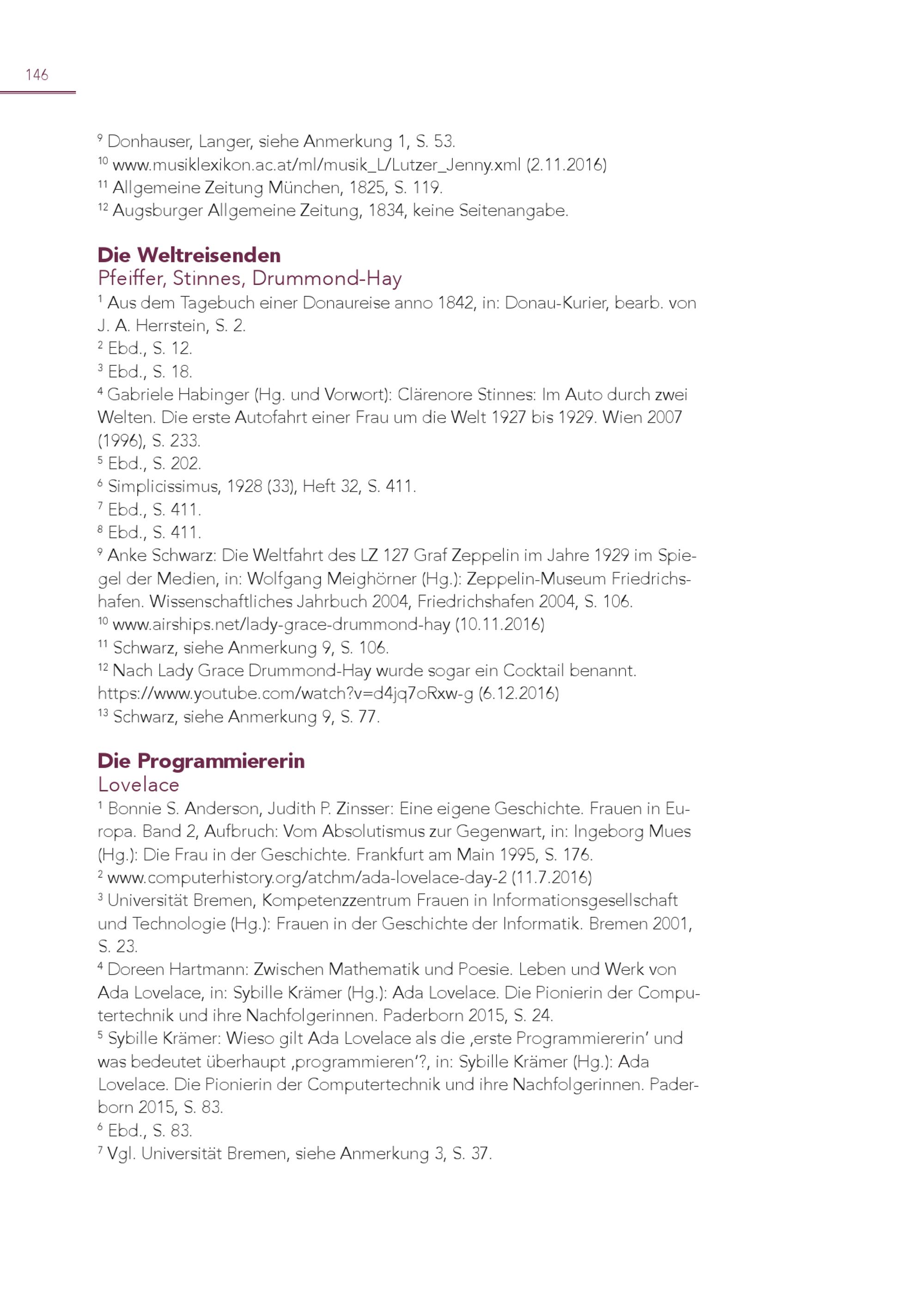 146 9 Donhauser, Langer, siehe Anmerkung 1, S. 53. 10 www.musiklexikon.ac.at/ml/musik_L/Lutzer_Jenny.xml(2.11.2016) 11 Allgemeine Zeitung München, 1825, S. 119. 12 Augsburger Allgemeine Zeitung, 1834, keine Seitenangabe. Die Weltreisenden Pfeiffer, Stinnes, Drummond-Hay 1 Aus dem Tagebuch einer Donaureise anno 1842, in: Donau-Kurier, bearb. von J. A. Herrstein, S. 2. 2 Ebd., S. 12. 3 Ebd., S. 18. 4 Gabriele Habinger(Hg. und Vorwort): Clärenore Stinnes: Im Auto durch zwei Welten. Die erste Autofahrt einer Frau um die Welt 1927 bis 1929. Wien 2007 (1996), S. 233. 5 Ebd., S. 202. 6 Simplicissimus, 1928(33), Heft 32, S. 411. 7 Ebd., S. 411. 8 Ebd., S. 411. 9 Anke Schwarz: Die Weltfahrt des LZ 127 Graf Zeppelin im Jahre 1929 im Spiegel der Medien, in: Wolfgang Meighörner(Hg.): Zeppelin-Museum Friedrichshafen. Wissenschaftliches Jahrbuch 2004, Friedrichshafen 2004, S. 106. 10 www.airships.net/lady-grace-drummond-hay(10.11.2016) 11 Schwarz, siehe Anmerkung 9, S. 106. 12 Nach Lady Grace Drummond-Hay wurde sogar ein Cocktail benannt. https://www.youtube.com/watch?v=d4jq7oRxw-g(6.12.2016) 13 Schwarz, siehe Anmerkung 9, S. 77. Die Programmiererin Lovelace 1 Bonnie S. Anderson, Judith P. Zinsser: Eine eigene Geschichte. Frauen in Europa. Band 2, Aufbruch: Vom Absolutismus zur Gegenwart, in: Ingeborg Mues (Hg.): Die Frau in der Geschichte. Frankfurt am Main 1995, S. 176. 2 www.computerhistory.org/atchm/ada-lovelace-day-2(11.7.2016) 3 Universität Bremen, Kompetenzzentrum Frauen in Informationsgesellschaft und Technologie(Hg.): Frauen in der Geschichte der Informatik. Bremen 2001, S. 23. 4 Doreen Hartmann: Zwischen Mathematik und Poesie. Leben und Werk von Ada Lovelace, in: Sybille Krämer(Hg.): Ada Lovelace. Die Pionierin der Computertechnik und ihre Nachfolgerinnen. Paderborn 2015, S. 24. 5 Sybille Krämer: Wieso gilt Ada Lovelace als die ‚erste Programmiererin’ und was bedeutet überhaupt ‚programmieren‘?, in: Sybille Krämer(Hg.): Ada Lovelace. Die Pionierin der Computertechnik und ihre Nachfolgerinnen. Paderborn 2015, S. 83. 6 Ebd., S. 83. 7 Vgl. Universität Bremen, siehe Anmerkung 3, S. 37.