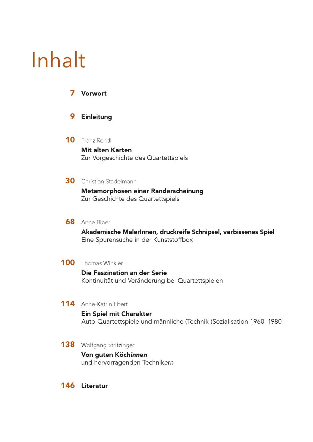 Inhalt 7 Vorwort 9 Einleitung 10 Franz Rendl Mit alten Karten Zur Vorgeschichte des Quartettspiels 30 Christian Stadelmann Metamorphosen einer Randerscheinung Zur Geschichte des Quartettspiels 68 Anne Biber Akademische MalerInnen, druckreife Schnipsel, verbissenes Spiel Eine Spurensuche in der Kunststoffbox 100 Thomas Winkler Die Faszination an der Serie Kontinuität und Veränderung bei Quartettspielen 114 Anne-Katrin Ebert Ein Spiel mit Charakter Auto-Quartettspiele und männliche(Technik-)Sozialisation 1960–1980 138 Wolfgang Stritzinger Von guten Köch innen und hervorragenden Technik ern 146 Literatur