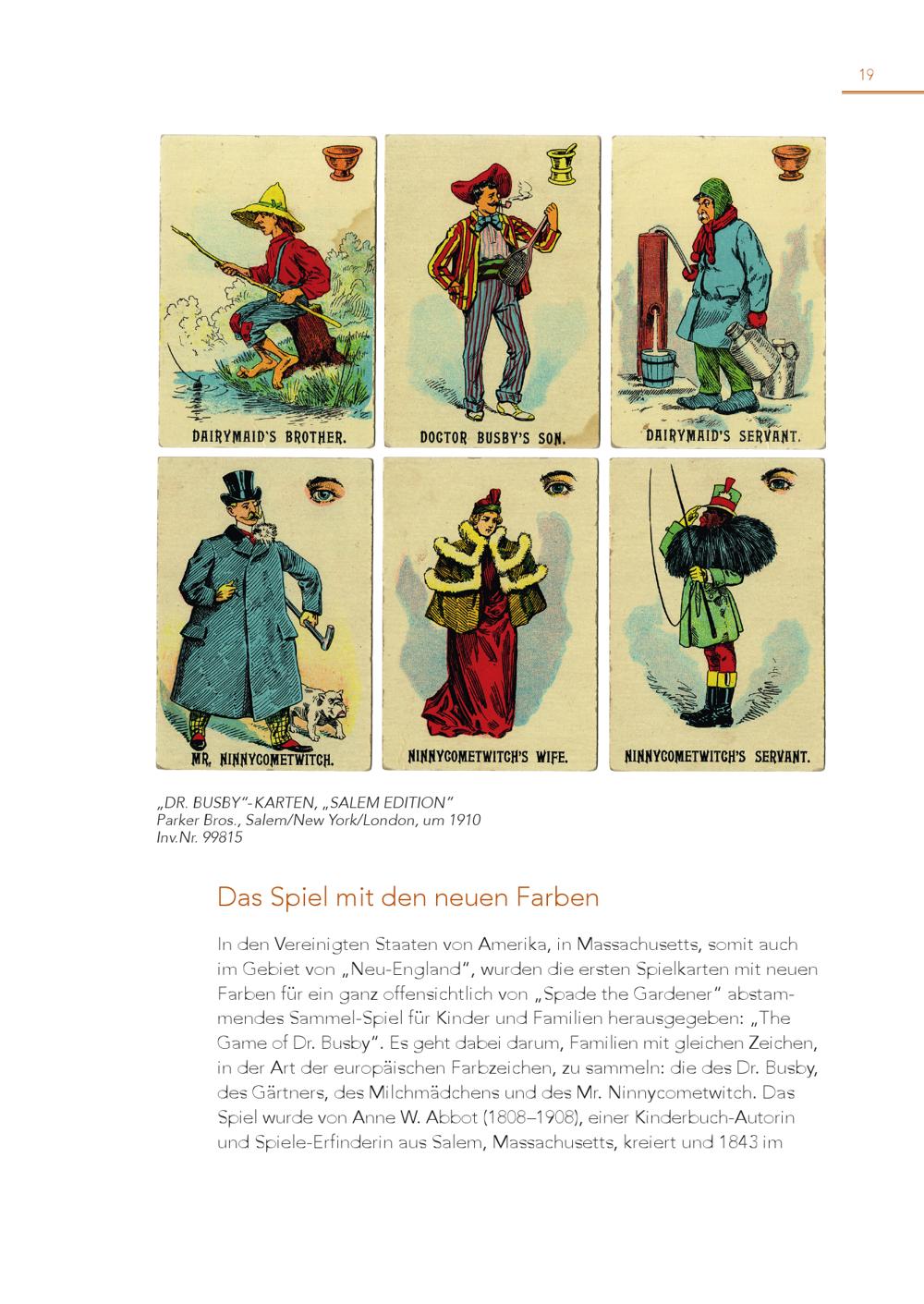 19 „DR. BUSBY“- KARTEN,„ SALEM EDITION” Parker Bros., Salem/New York/London, um 1910 Inv.Nr. 99815 Das Spiel mit den neuen Farben In den Vereinigten Staaten von Amerika, in Massachusetts, somit auch im Gebiet von„Neu-England“, wurden die ersten Spielkarten mit neuen Farben für ein ganz offensichtlich von„Spade the Gardener“ abstammendes Sammel-Spiel für Kinder und Familien herausgegeben:„The Game of Dr. Busby“. Es geht dabei darum, Familien mit gleichen Zeichen, in der Art der europäischen Farbzeichen, zu sammeln: die des Dr. Busby, des Gärtners, des Milchmädchens und des Mr. Ninnycometwitch. Das Spiel wurde von Anne W. Abbot(1808–1908), einer Kinderbuch-Autorin und Spiele-Erfinderin aus Salem, Massachusetts, kreiert und 1843 im
