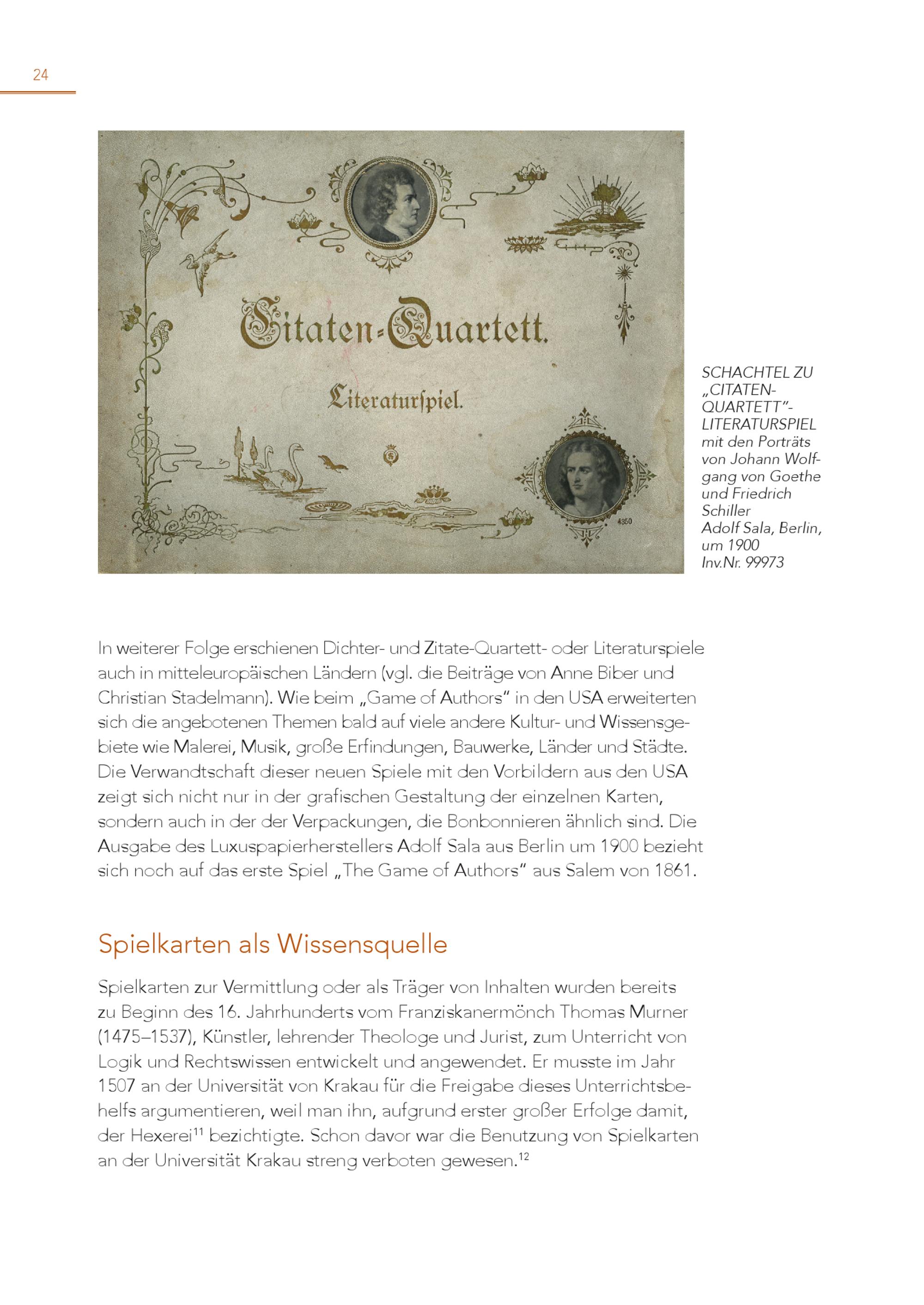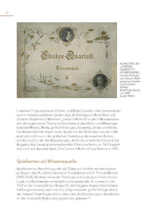 24 SCHACHTEL ZU „CITATENQUARTETT”LITERATURSPIEL mit den Porträts von Johann Wolfgang von Goethe und Friedrich Schiller Adolf Sala, Berlin, um 1900 Inv.Nr. 99973 In weiterer Folge erschienen Dichter- und Zitate-Quartett- oder Literaturspiele auch in mitteleuropäischen Ländern(vgl. die Beiträge von Anne Biber und Christian Stadelmann). Wie beim„Game of Authors“ in den USA erweiterten sich die angebotenen Themen bald auf viele andere Kultur- und Wissensgebiete wie Malerei, Musik, große Erfindungen, Bauwerke, Länder und Städte. Die Verwandtschaft dieser neuen Spiele mit den Vorbildern aus den USA zeigt sich nicht nur in der grafischen Gestaltung der einzelnen Karten, sondern auch in der der Verpackungen, die Bonbonnieren ähnlich sind. Die Ausgabe des Luxuspapierherstellers Adolf Sala aus Berlin um 1900 bezieht sich noch auf das erste Spiel„The Game of Authors“ aus Salem von 1861. Spielkarten als Wissensquelle Spielkarten zur Vermittlung oder als Träger von Inhalten wurden bereits zu Beginn des 16. Jahrhunderts vom Franziskanermönch Thomas Murner (1475–1537), Künstler, lehrender Theologe und Jurist, zum Unterricht von Logik und Rechtswissen entwickelt und angewendet. Er musste im Jahr 1507 an der Universität von Krakau für die Freigabe dieses Unterrichtsbehelfs argumentieren, weil man ihn, aufgrund erster großer Erfolge damit, der Hexerei 11 bezichtigte. Schon davor war die Benutzung von Spielkarten an der Universität Krakau streng verboten gewesen. 12
