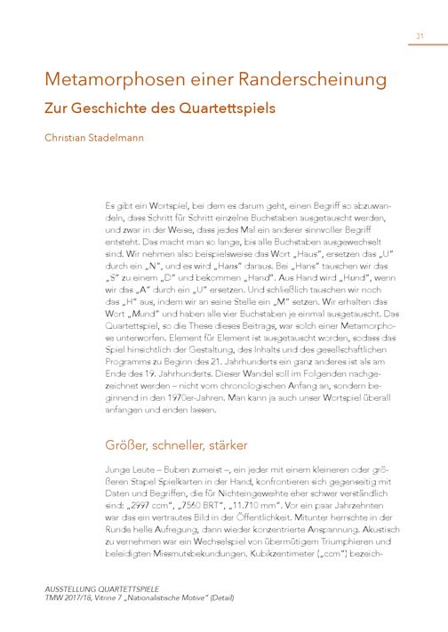 31 Metamorphosen einer Randerscheinung Zur Geschichte des Quartettspiels Christian Stadelmann Es gibt ein Wortspiel, bei dem es darum geht, einen Begriff so abzuwandeln, dass Schritt für Schritt einzelne Buchstaben ausgetauscht werden, und zwar in der Weise, dass jedes Mal ein anderer sinnvoller Begriff entsteht. Das macht man so lange, bis alle Buchstaben ausgewechselt sind. Wir nehmen also beispielsweise das Wort„Haus“, ersetzen das„U“ durch ein„N“, und es wird„H ans“ daraus. Bei„Hans“ tauschen wir das „S“ zu einem„D“ und bekommen„Han d“. Aus Hand wird„H u nd“, wenn wir das„A“ durch ein„U“ ersetzen. Und schließlich tauschen wir noch das„H“ aus, indem wir an seine Stelle ein„M“ setzen. Wir erhalten das Wort„ M und“ und haben alle vier Buchstaben je einmal ausgetauscht. Das Quartettspiel, so die These dieses Beitrags, war solch einer Metamorphose unterworfen. Element für Element ist ausgetauscht worden, sodass das Spiel hinsichtlich der Gestaltung, des Inhalts und des gesellschaftlichen Programms zu Beginn des 21. Jahrhunderts ein ganz anderes ist als am Ende des 19. Jahrhunderts. Dieser Wandel soll im Folgenden nachgezeichnet werden – nicht vom chronologischen Anfang an, sondern beginnend in den 1970er-Jahren. Man kann ja auch unser Wortspiel überall anfangen und enden lassen. Größer, schneller, stärker Junge Leute – Buben zumeist –, ein jeder mit einem kleineren oder größeren Stapel Spielkarten in der Hand, konfrontieren sich gegenseitig mit Daten und Begriffen, die für Nichteingeweihte eher schwer verständlich sind:„2997 ccm“,„7560 BRT“,„11.710 mm“. Vor ein paar Jahrzehnten war das ein vertrautes Bild in der Öffentlichkeit. Mitunter herrschte in der Runde helle Aufregung, dann wieder konzentrierte Anspannung. Akustisch zu vernehmen war ein Wechselspiel von übermütigem Triumphieren und beleidigten Missmutsbekundungen. Kubikzentimeter(„ccm“) bezeichAUSSTELLUNG QUARTETTSPIELE TMW 2017/18, Vitrine 7„Nationalistische Motive“(Detail)