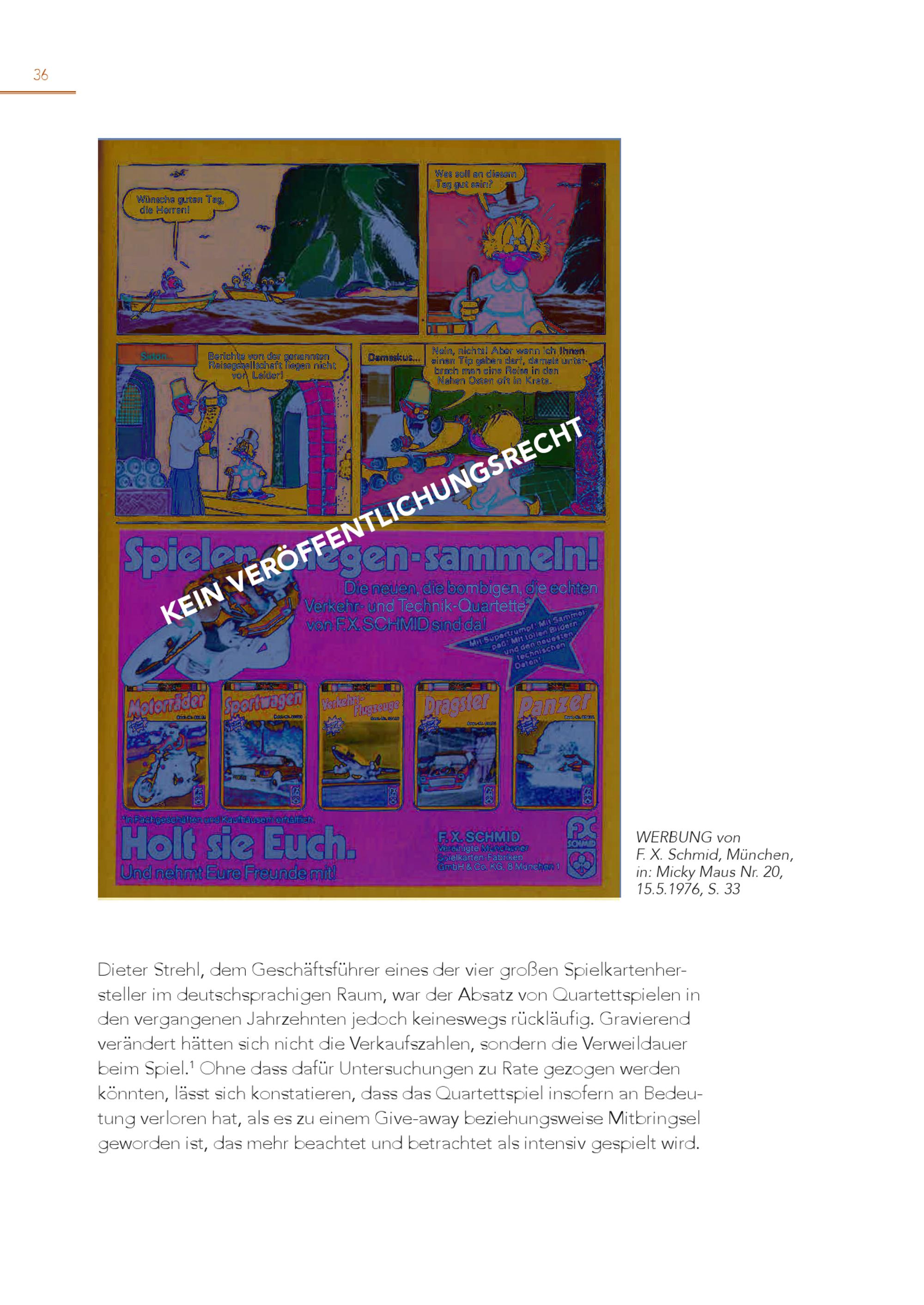 36 KEIN VERÖFFENTLICHUNGSRECHT WERBUNG von F. X. Schmid, München, in: Micky Maus Nr. 20, 15.5.1976, S. 33 Dieter Strehl, dem Geschäftsführer eines der vier großen Spielkartenhersteller im deutschsprachigen Raum, war der Absatz von Quartettspielen in den vergangenen Jahrzehnten jedoch keineswegs rückläufig. Gravierend verändert hätten sich nicht die Verkaufszahlen, sondern die Verweildauer beim Spiel. 1 Ohne dass dafür Untersuchungen zu Rate gezogen werden könnten, lässt sich konstatieren, dass das Quartettspiel insofern an Bedeutung verloren hat, als es zu einem Give-away beziehungsweise Mitbringsel geworden ist, das mehr beachtet und betrachtet als intensiv gespielt wird.
