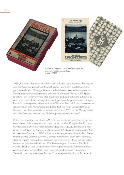 42 QUARTETTSPIEL„DURCH ÖSTERREICH“ Joseph Scholz, Mainz, 1927 Inv.Nr. 99050 1938„Rennen – Rennfahrer – Rekorde“ auf, das Leistungen im Rennsport und der Sportwagentechnik thematisierte – vor allem deutsche Leistungen, versteht sich. 8 Einzige Ausnahme bei diesem Wetteifern um nationalsozialistische Ideologietreue war der Nürnberger Verlag J. W. Spear & Söhne, ein Unternehmen, das stets sehr gediegene Spiele auflegte. Er war bezeichnenderweise in jüdischem Eigentum. Abgesehen von einigen Reise-Quartettspielen, die er sich zum Teil vom Reichsluftfahrtsministerium genehmigen ließ, hatte Spear zu dieser Zeit nur noch„unverdächtige“ Blumen- und Tierquartette in seinem Sortiment. 1938 ist der Verlag arisiert und die Quartett-Herstellung überhaupt eingestellt worden. 9 Unter den jeweiligen politischen Vorzeichen dienten Quartettspiele schon zwischen und dann wieder nach den beiden großen Kriegen des 20. Jahrhunderts einer Art nationaler Selbstvergewisserung(vgl. den Beitrag von Anne Biber). Aus der Kategorie„Reisequartett“, die wohl im Zuge des Ansichtskarten-Booms um 1900 aufgekommen war, entstand nach dem Ersten Weltkrieg das„Heimatquartett“, dessen Attraktivität auch darin bestand, dass es implizit dazu aufrief, sich nach dem verlorenen Krieg auf die Schönheiten des Landes zu besinnen. Die Karten zeigten Fotos von Baudenkmälern, Städten und Landschaften, die mit pathetischen Texten unterlegt waren und von wirtschaftlich und historisch Bedeutsamem kündeten. 10 Österreich wurde, was diese Art der Quartettspiele betrifft, zunächst auch