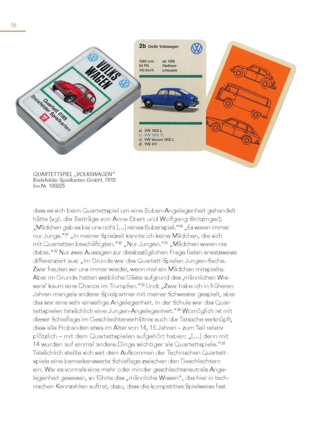 56 QUARTETTSPIEL„VOLKSWAGEN“ Bielefelder Spielkarten GmbH, 1970 Inv.Nr. 100225 dass es sich beim Quartettspiel um eine Buben-Angelegenheit gehandelt hätte(vgl. die Beiträge von Anne Ebert und Wolfgang Stritzinger): „Mädchen gab es bei uns nicht[…] reines Bubenspiel.“ 28 „Es waren immer nur Jungs.“ 29 „In meiner Spielzeit kannte ich keine Mädchen, die sich mit Quartetten beschäftigten.“ 30 „Nur Jungen.“ 31 „Mädchen waren nie dabei.“ 32 Nur zwei Aussagen zur diesbezüglichen Frage fielen ansatzweise differenziert aus:„Im Grunde war das Quartett-Spielen Jungen-Sache. Zwar freuten wir uns immer wieder, wenn mal ein Mädchen mitspielte. Aber im Grunde hatten weibliche Gäste aufgrund des ‚männlichen Wissens‘ kaum eine Chance im Trumpfen.“ 33 Und:„Zwar habe ich in früheren Jahren mangels anderer Spielpartner mit meiner Schwester gespielt, aber das war eine sehr einseitige Angelegenheit. In der Schule war das Quartettspielen tatsächlich eine Jungen-Angelegenheit.“ 34 Womöglich ist mit dieser Schieflage im Geschlechterverhältnis auch die Tatsache verknüpft, dass alle Probanden etwa im Alter von 14, 15 Jahren – zum Teil relativ plötzlich – mit dem Quartettspielen aufgehört haben:„[…] denn mit 14 wurden auf einmal andere Dinge wichtiger als Quartettspiele.“ 35 Tatsächlich stellte sich seit dem Aufkommen der Technischen Quartettspiele eine bemerkenswerte Schieflage zwischen den Geschlechtern ein. War es vormals eine mehr oder minder geschlechtsneutrale Angelegenheit gewesen, so führte das„männliche Wissen“, das hier in technischen Kennzahlen auftrat, dazu, dass die kompetitive Spielweise fast