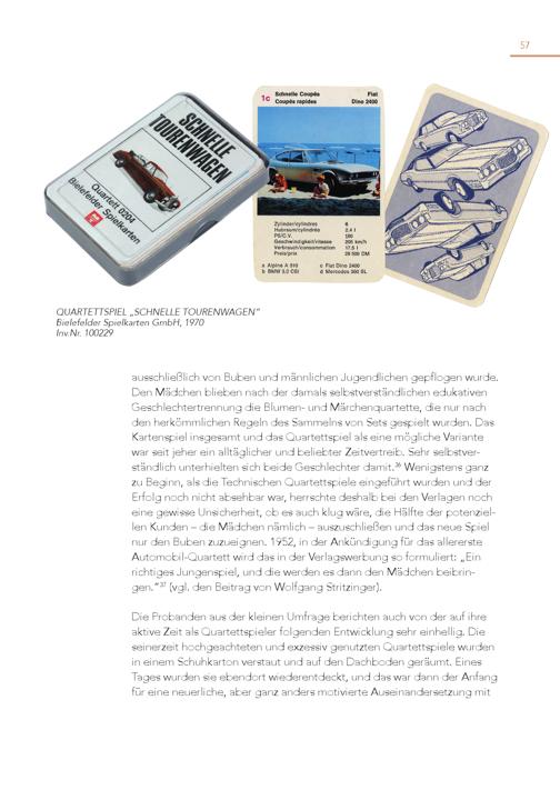 57 QUARTETTSPIEL„SCHNELLE TOURENWAGEN“ Bielefelder Spielkarten GmbH, 1970 Inv.Nr. 100229 ausschließlich von Buben und männlichen Jugendlichen gepflogen wurde. Den Mädchen blieben nach der damals selbstverständlichen edukativen Geschlechtertrennung die Blumen- und Märchenquartette, die nur nach den herkömmlichen Regeln des Sammelns von Sets gespielt wurden. Das Kartenspiel insgesamt und das Quartettspiel als eine mögliche Variante war seit jeher ein alltäglicher und beliebter Zeitvertreib. Sehr selbstverständlich unterhielten sich beide Geschlechter damit. 36 Wenigstens ganz zu Beginn, als die Technischen Quartettspiele eingeführt wurden und der Erfolg noch nicht absehbar war, herrschte deshalb bei den Verlagen noch eine gewisse Unsicherheit, ob es auch klug wäre, die Hälfte der potenziellen Kunden – die Mädchen nämlich – auszuschließen und das neue Spiel nur den Buben zuzueignen. 1952, in der Ankündigung für das allererste Automobil-Quartett wird das in der Verlagswerbung so formuliert:„Ein richtiges Jungenspiel, und die werden es dann den Mädchen beibringen.“ 37 (vgl. den Beitrag von Wolfgang Stritzinger). Die Probanden aus der kleinen Umfrage berichten auch von der auf ihre aktive Zeit als Quartettspieler folgenden Entwicklung sehr einhellig. Die seinerzeit hochgeachteten und exzessiv genutzten Quartettspiele wurden in einem Schuhkarton verstaut und auf den Dachboden geräumt. Eines Tages wurden sie ebendort wiederentdeckt, und das war dann der Anfang für eine neuerliche, aber ganz anders motivierte Auseinandersetzung mit