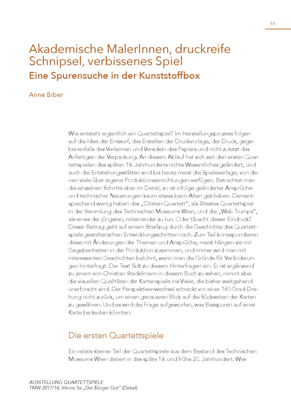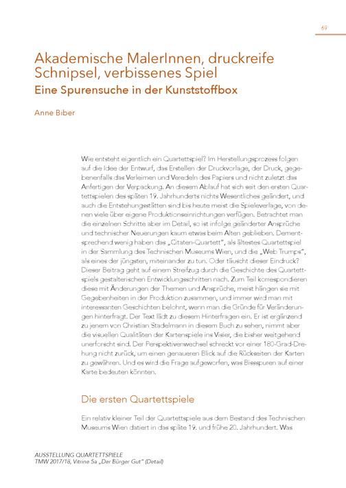 Akademische MalerInnen, druckreife Schnipsel, verbissenes Spiel Eine Spurensuche in der Kunststoffbox Anne Biber 69 Wie entsteht eigentlich ein Quartettspiel? Im Herstellungsprozess folgen auf die Idee der Entwurf, das Erstellen der Druckvorlage, der Druck, gegebenenfalls das Verleimen und Veredeln des Papiers und nicht zuletzt das Anfertigen der Verpackung. An diesem Ablauf hat sich seit den ersten Quartettspielen des späten 19. Jahrhunderts nichts Wesentliches geändert, und auch die Entstehungsstätten sind bis heute meist die Spieleverlage, von denen viele über eigene Produktionseinrichtungen verfügen. Betrachtet man die einzelnen Schritte aber im Detail, so ist infolge geänderter Ansprüche und technischer Neuerungen kaum etwas beim Alten geblieben. Dementsprechend wenig haben das„Citaten-Quartett“, als ältestes Quartettspiel in der Sammlung des Technischen Museums Wien, und die„Web Trumps“, als eines der jüngsten, miteinander zu tun. Oder täuscht dieser Eindruck? Dieser Beitrag geht auf einem Streifzug durch die Geschichte des Quartettspiels gestalterischen Entwicklungsschritten nach. Zum Teil korrespondieren diese mit Änderungen der Themen und Ansprüche, meist hängen sie mit Gegebenheiten in der Produktion zusammen, und immer wird man mit interessanten Geschichten belohnt, wenn man die Gründe für Veränderungen hinterfragt. Der Text lädt zu diesem Hinterfragen ein. Er ist ergänzend zu jenem von Christian Stadelmann in diesem Buch zu sehen, nimmt aber die visuellen Qualitäten der Kartenspiele ins Visier, die bisher weitgehend unerforscht sind. Der Perspektivenwechsel schreckt vor einer 180-Grad-Drehung nicht zurück, um einen genaueren Blick auf die Rückseiten der Karten zu gewähren. Und es wird die Frage aufgeworfen, was Bissspuren auf einer Karte bedeuten könnten. Die ersten Quartettspiele Ein relativ kleiner Teil der Quartettspiele aus dem Bestand des Technischen Museums Wien datiert in das späte 19. und frühe 20. Jahrhundert. Was AUSSTELLUNG QUARTETTSPIELE TMW 2017/18, Vitrine 5a„Der Bürger Gut“(Detail)