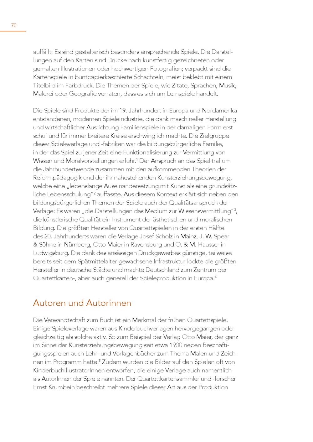 70 auffällt: Es sind gestalterisch besonders ansprechende Spiele. Die Darstellungen auf den Karten sind Drucke nach kunstfertig gezeichneten oder gemalten Illustrationen oder hochwertigen Fotografien; verpackt sind die Kartenspiele in buntpapierkaschierte Schachteln, meist beklebt mit einem Titelbild im Farbdruck. Die Themen der Spiele, wie Zitate, Sprachen, Musik, Malerei oder Geografie verraten, dass es sich um Lernspiele handelt. Die Spiele sind Produkte der im 19. Jahrhundert in Europa und Nordamerika entstandenen, modernen Spieleindustrie, die dank maschineller Herstellung und wirtschaftlicher Ausrichtung Familienspiele in der damaligen Form erst schuf und für immer breitere Kreise erschwinglich machte. Die Zielgruppe dieser Spieleverlage und-fabriken war die bildungsbürgerliche Familie, in der das Spiel zu jener Zeit eine Funktionalisierung zur Vermittlung von Wissen und Moralvorstellungen erfuhr. 1 Der Anspruch an das Spiel traf um die Jahrhundertwende zusammen mit den aufkommenden Theorien der Reformpädagogik und der ihr nahestehenden Kunsterziehungsbewegung, welche eine„lebenslange Auseinandersetzung mit Kunst als eine grundsätzliche Lebensschulung“ 2 auffasste. Aus diesem Kontext erklärt sich neben den bildungsbürgerlichen Themen der Spiele auch der Qualitätsanspruch der Verlage: Es waren„die Darstellungen das Medium zur Wissensvermittlung“ 3 , die künstlerische Qualität ein Instrument der ästhetischen und moralischen Bildung. Die größten Hersteller von Quartettspielen in der ersten Hälfte des 20. Jahrhunderts waren die Verlage Josef Scholz in Mainz, J. W. Spear & Söhne in Nürnberg, Otto Maier in Ravensburg und O.& M. Hausser in Ludwigsburg. Die dank des ansässigen Druckgewerbes günstige, teilweise bereits seit dem Spätmittelalter gewachsene Infrastruktur lockte die größten Hersteller in deutsche Städte und machte Deutschland zum Zentrum der Quartettkarten-, aber auch generell der Spieleproduktion in Europa. 4 Autoren und Autorinnen Die Verwandtschaft zum Buch ist ein Merkmal der frühen Quartettspiele. Einige Spieleverlage waren aus Kinderbuchverlagen hervorgegangen oder gleichzeitig als solche aktiv. So zum Beispiel der Verlag Otto Maier, der ganz im Sinne der Kunsterziehungsbewegung seit etwa 1900 neben Beschäftigungsspielen auch Lehr- und Vorlagenbücher zum Thema Malen und Zeich nen im Programm hatte. 5 Zudem wurden die Bilder auf den Spielen oft von KinderbuchillustratorInnen entworfen, die einige Verlage auch namentlich als AutorInnen der Spiele nannten. Der Quartettkartensammler und-forscher Ernst Krumbein beschreibt mehrere Spiele dieser Art aus der Produktion