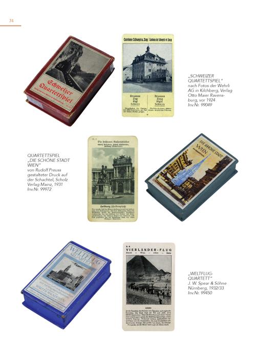 74 QUARTETTSPIEL „DIE SCHÖNE STADT WIEN“ von Rudolf Preuss gestalteter Druck auf der Schachtel, Scholz Verlag Mainz, 1931 Inv.Nr. 99972 „SCHWEIZER QUARTETTSPIEL“ nach Fotos der Wehrli AG in Kilchberg, Verlag Otto Maier Ravensburg, vor 1924 Inv.Nr. 99049 „WELTFLUGQUARTETT“ J. W. Spear& Söhne Nürnberg, 1932/33 Inv.Nr. 99450