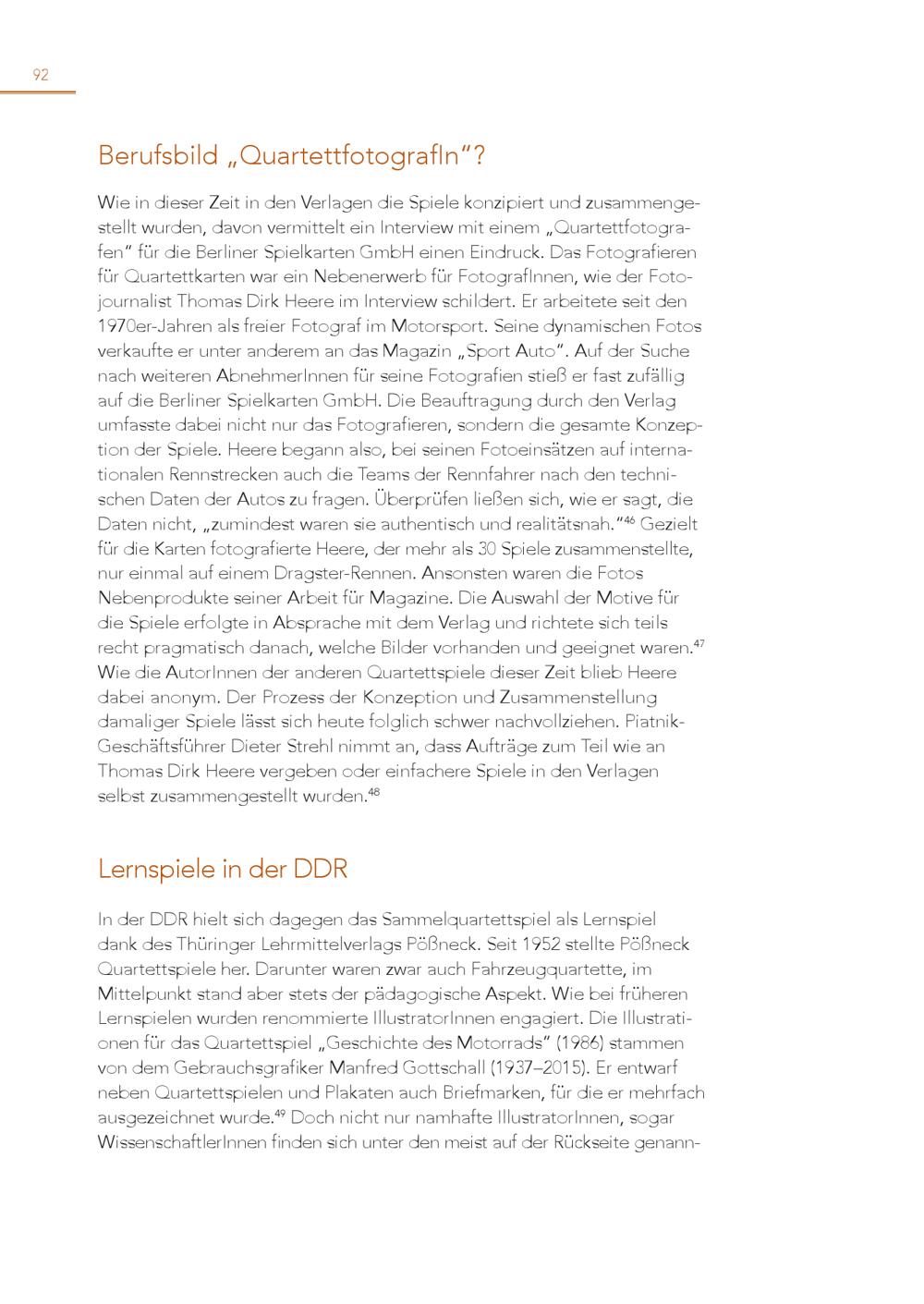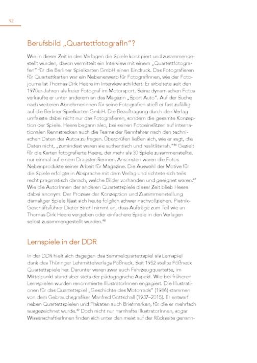 92 Berufsbild„QuartettfotografIn“? Wie in dieser Zeit in den Verlagen die Spiele konzipiert und zusammengestellt wurden, davon vermittelt ein Interview mit einem„Quartettfotografen“ für die Berliner Spielkarten GmbH einen Eindruck. Das Fotografieren für Quartettkarten war ein Nebenerwerb für FotografInnen, wie der Fotojournalist Thomas Dirk Heere im Interview schildert. Er arbeitete seit den 1970er-Jahren als freier Fotograf im Motorsport. Seine dynamischen Fotos verkaufte er unter anderem an das Magazin„Sport Auto“. Auf der Suche nach weiteren AbnehmerInnen für seine Fotografien stieß er fast zufällig auf die Berliner Spielkarten GmbH. Die Beauftragung durch den Verlag umfasste dabei nicht nur das Fotografieren, sondern die gesamte Konzep tion der Spiele. Heere begann also, bei seinen Fotoeinsätzen auf internationalen Rennstrecken auch die Teams der Rennfahrer nach den technischen Daten der Autos zu fragen. Überprüfen ließen sich, wie er sagt, die Daten nicht,„zumindest waren sie authentisch und realitätsnah.“ 46 Gezielt für die Karten fotografierte Heere, der mehr als 30 Spiele zusammenstellte, nur einmal auf einem Dragster-Rennen. Ansonsten waren die Fotos Nebenprodukte seiner Arbeit für Magazine. Die Auswahl der Motive für die Spiele erfolgte in Absprache mit dem Verlag und richtete sich teils recht pragmatisch danach, welche Bilder vorhanden und geeignet waren. 47 Wie die AutorInnen der anderen Quartettspiele dieser Zeit blieb Heere dabei anonym. Der Prozess der Konzeption und Zusammenstellung damaliger Spiele lässt sich heute folglich schwer nachvollziehen. PiatnikGeschäftsführer Dieter Strehl nimmt an, dass Aufträge zum Teil wie an Thomas Dirk Heere vergeben oder einfachere Spiele in den Verlagen selbst zusammengestellt wurden. 48 Lernspiele in der DDR In der DDR hielt sich dagegen das Sammelquartettspiel als Lernspiel dank des Thüringer Lehrmittelverlags Pößneck. Seit 1952 stellte Pößneck Quartettspiele her. Darunter waren zwar auch Fahrzeugquartette, im Mittelpunkt stand aber stets der pädagogische Aspekt. Wie bei früheren Lernspielen wurden renommierte IllustratorInnen engagiert. Die Illustrati onen für das Quartettspiel„Geschichte des Motorrads”(1986) stammen von dem Gebrauchsgrafiker Manfred Gottschall(1937–2015). Er entwarf neben Quartettspielen und Plakaten auch Briefmarken, für die er mehrfach ausgezeichnet wurde. 49 Doch nicht nur namhafte IllustratorInnen, sogar WissenschaftlerInnen finden sich unter den meist auf der Rückseite genann -