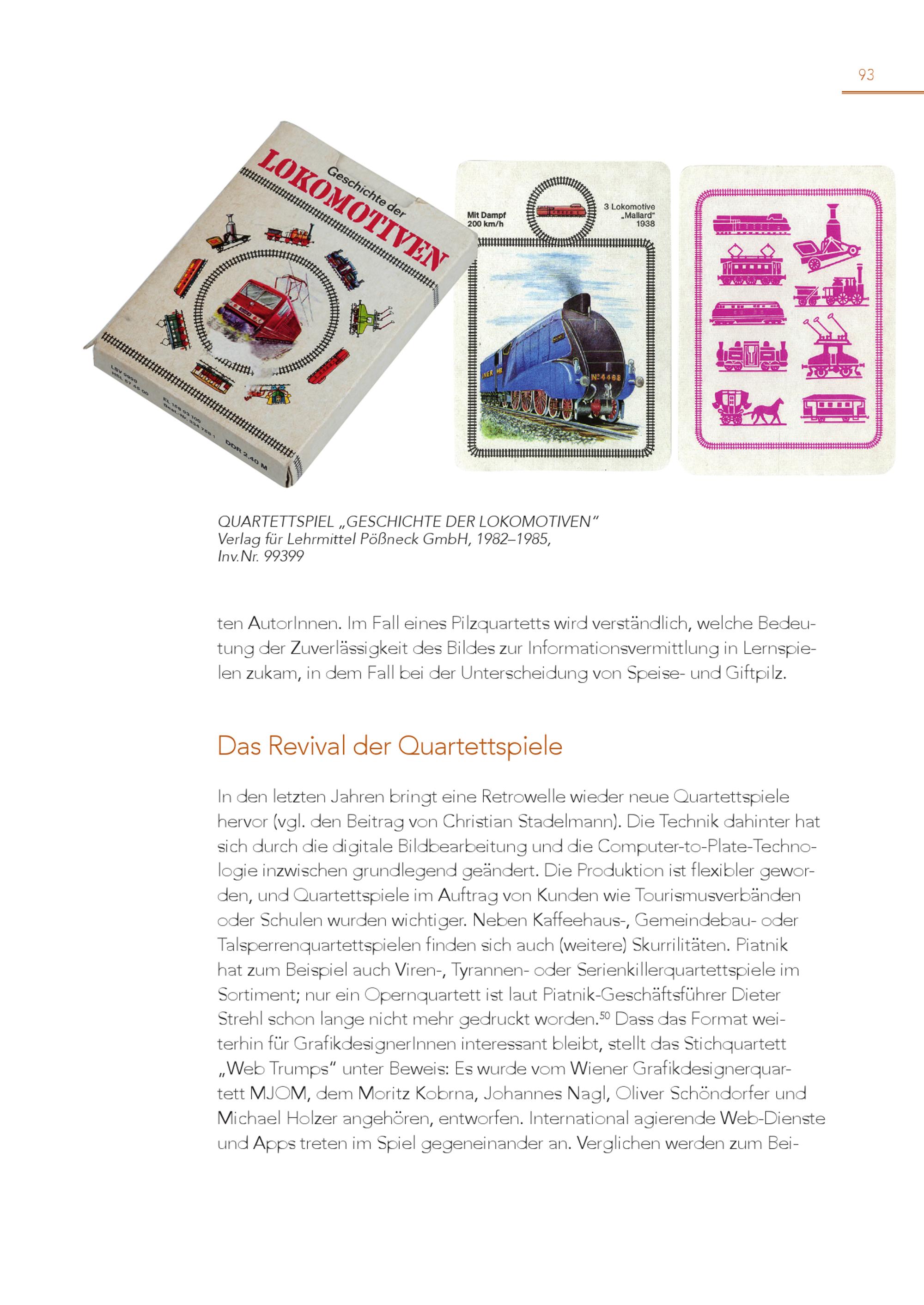 93 QUARTETTSPIEL„GESCHICHTE DER LOKOMOTIVEN“ Verlag für Lehrmittel Pößneck GmbH, 1982–1985, Inv.Nr. 99399 ten AutorInnen. Im Fall eines Pilzquartetts wird verständlich, welche Bedeutung der Zuverlässigkeit des Bildes zur Informationsvermittlung in Lernspie len zukam, in dem Fall bei der Unterscheidung von Speise- und Giftpilz. Das Revival der Quartettspiele In den letzten Jahren bringt eine Retrowelle wieder neue Quartettspiele hervor(vgl. den Beitrag von Christian Stadelmann). Die Technik dahinter hat sich durch die digitale Bildbearbeitung und die Computer-to-Plate-Technologie inzwischen grundlegend geändert. Die Produktion ist flexibler gewor den, und Quartettspiele im Auftrag von Kunden wie Tourismusverbänden oder Schulen wurden wichtiger. Neben Kaffeehaus-, Gemeindebau- oder Talsperrenquartettspielen finden sich auch(weitere) Skurrilitäten. Piatnik hat zum Beispiel auch Viren-, Tyrannen- oder Serienkillerquartettspiele im Sortiment; nur ein Opernquartett ist laut Piatnik-Geschäftsführer Dieter Strehl schon lange nicht mehr gedruckt worden. 50 Dass das Format weiterhin für GrafikdesignerInnen interessant bleibt, stellt das Stichquartett „Web Trumps“ unter Beweis: Es wurde vom Wiener Grafikdesignerquar tett MJOM, dem Moritz Kobrna, Johannes Nagl, Oliver Schöndorfer und Michael Holzer angehören, entworfen. International agierende Web-Dienste und Apps treten im Spiel gegeneinander an. Verglichen werden zum Bei-