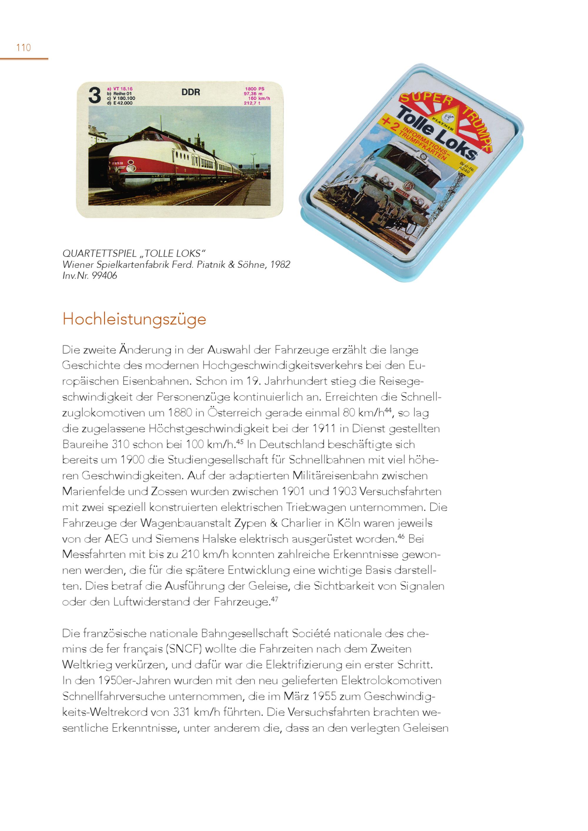 110 QUARTETTSPIEL„TOLLE LOKS“ Wiener Spielkartenfabrik Ferd. Piatnik& Söhne, 1982 Inv.Nr. 99406 Hochleistungszüge Die zweite Änderung in der Auswahl der Fahrzeuge erzählt die lange Geschichte des modernen Hochgeschwindigkeitsverkehrs bei den Europäischen Eisenbahnen. Schon im 19. Jahrhundert stieg die Reisegeschwindigkeit der Personenzüge kontinuierlich an. Erreichten die Schnell zuglokomotiven um 1880 in Österreich gerade einmal 80 km/h 44 , so lag die zugelassene Höchstgeschwindigkeit bei der 1911 in Dienst gestellten Baureihe 310 schon bei 100 km/h. 45 In Deutschland beschäftigte sich bereits um 1900 die Studiengesellschaft für Schnellbahnen mit viel höhe ren Geschwindigkeiten. Auf der adaptierten Militäreisenbahn zwischen Marienfelde und Zossen wurden zwischen 1901 und 1903 Versuchsfahrten mit zwei speziell konstruierten elektrischen Triebwagen unternommen. Die Fahrzeuge der Wagenbauanstalt Zypen& Charlier in Köln waren jeweils von der AEG und Siemens Halske elektrisch ausgerüstet worden. 46 Bei Messfahrten mit bis zu 210 km/h konnten zahlreiche Erkenntnisse gewonnen werden, die für die spätere Entwicklung eine wichtige Basis darstell ten. Dies betraf die Ausführung der Geleise, die Sichtbarkeit von Signalen oder den Luftwiderstand der Fahrzeuge. 47 Die französische nationale Bahngesellschaft Société nationale des chemins de fer français(SNCF) wollte die Fahrzeiten nach dem Zweiten Weltkrieg verkürzen, und dafür war die Elektrifizierung ein erster Schritt. In den 1950er-Jahren wurden mit den neu gelieferten Elektrolokomotiven Schnellfahrversuche unternommen, die im März 1955 zum Geschwindigkeits-Weltrekord von 331 km/h führten. Die Versuchsfahrten brachten we sentliche Erkenntnisse, unter anderem die, dass an den verlegten Geleisen