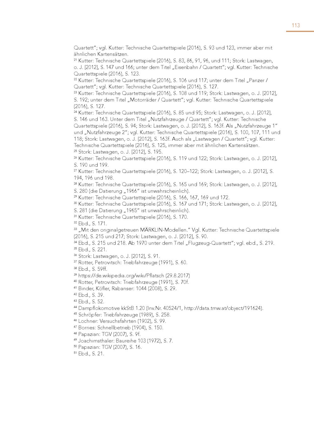 113 Quartett“; vgl. Kutter: Technische Quartettspiele(2016), S. 93 und 123, immer aber mit ähnlichen Kartensätzen. 21 Kutter: Technische Quartettspiele(2016), S. 83, 86, 91, 96, und 111; Stork: Lastwagen, o. J.[2012], S. 147 und 166; unter dem Titel„Eisenbahn/ Quartett“; vgl. Kutter: Technische Quartettspiele(2016), S. 123. 22 Kutter: Technische Quartettspiele(2016), S. 106 und 117; unter dem Titel„Panzer/ Quartett“; vgl. Kutter: Technische Quartettspiele(2016), S. 127. 23 Kutter: Technische Quartettspiele(2016), S. 108 und 119; Stork: Lastwagen, o. J.[2012], S. 192; unter dem Titel„Motorräder/ Quartett“; vgl. Kutter: Technische Quartettspiele (2016), S. 127. 24 Kutter: Technische Quartettspiele(2016), S. 85 und 95; Stork: Lastwagen, o. J.[2012], S. 146 und 163. Unter dem Titel„Nutzfahrzeuge/ Quartett“; vgl. Kutter: Technische Quartettspiele(2016), S. 94; Stork: Lastwagen, o. J.[2012], S. 163f. Als„Nutzfahrzeuge 1“ und„Nutzfahrzeuge 2“; vgl. Kutter: Technische Quartettspiele(2016), S. 100, 107, 111 und 118; Stork: Lastwagen, o. J.[2012], S. 163f. Auch als„Lastwagen/ Quartett“; vgl. Kutter: Technische Quartettspiele(2016), S. 125, immer aber mit ähnlichen Kartensätzen. 25 Stork: Lastwagen, o. J.[2012], S. 195. 26 Kutter: Technische Quartettspiele(2016), S. 119 und 122; Stork: Lastwagen, o. J.[2012], S. 190 und 199. 27 Kutter: Technische Quartettspiele(2016), S. 120–122; Stork: Lastwagen, o. J.[2012], S. 194, 196 und 198. 28 Kutter: Technische Quartettspiele(2016), S. 165 und 169; Stork: Lastwagen, o. J.[2012], S. 280(die Datierung„1966“ ist unwahrscheinlich). 29 Kutter: Technische Quartettspiele(2016), S. 166, 167, 169 und 172. 30 Kutter: Technische Quartettspiele(2016), S. 167 und 171; Stork: Lastwagen, o. J.[2012], S. 281(die Datierung„1965“ ist unwahrscheinlich). 31 Kutter: Technische Quartettspiele(2016), S. 170. 32 Ebd., S. 171. 33 „Mit den originalgetreuen MÄRKLIN-Modellen.“ Vgl. Kutter: Technische Quartettspiele (2016), S. 215 und 217; Stork: Lastwagen, o. J.[2012], S. 90. 34 Ebd., S. 215 und 218. Ab 1970 unter dem Titel„Flugzeug-Quartett“; vgl. ebd., S. 219. 35 Ebd., S. 221. 36 Stork: Lastwagen, o. J.[2012], S. 91. 37 Rotter, Petrovitsch: Triebfahrzeuge(1991), S. 60. 38 Ebd., S. 59ff. 39 https://de.wikipedia.org/wiki/Pflatsch(29.8.2017) 40 Rotter, Petrovitsch: Triebfahrzeuge(1991), S. 70f. 41 Binder, Köfler, Rabanser: 1044(2008), S. 29. 42 Ebd., S. 39. 43 Ebd., S. 52. 44 Dampflokomotive kkStB 1.20(Inv.Nr. 40524/1, http://data.tmw.at/object/191624). 45 Schröpfer: Triebfahrzeuge(1989), S. 258. 46 Lochner: Versuchsfahrten(1902), S. 99. 47 Borries: Schnellbetrieb(1904), S. 150. 48 Papazian: TGV(2007), S. 9f. 49 Joachimsthaler: Baureihe 103(1972), S. 7. 50 Papazian: TGV(2007), S. 16. 51 Ebd., S. 21.