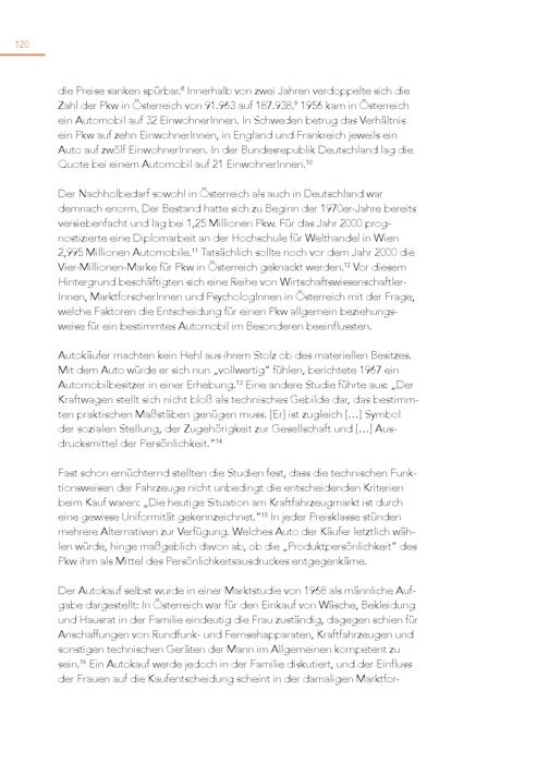120 die Preise sanken spürbar. 8 Innerhalb von zwei Jahren verdoppelte sich die Zahl der Pkw in Österreich von 91.963 auf 187.938. 9 1956 kam in Österreich ein Automobil auf 32 EinwohnerInnen. In Schweden betrug das Verhältnis ein Pkw auf zehn EinwohnerInnen, in England und Frankreich jeweils ein Auto auf zwölf EinwohnerInnen. In der Bundesrepublik Deutschland lag die Quote bei einem Automobil auf 21 EinwohnerInnen. 10 Der Nachholbedarf sowohl in Österreich als auch in Deutschland war demnach enorm. Der Bestand hatte sich zu Beginn der 1970er-Jahre bereits versiebenfacht und lag bei 1,25 Millionen Pkw. Für das Jahr 2000 prognostizierte eine Diplomarbeit an der Hochschule für Welthandel in Wien 2,995 Millionen Automobile. 11 Tatsächlich sollte noch vor dem Jahr 2000 die Vier-Millionen-Marke für Pkw in Österreich geknackt werden. 12 Vor diesem Hintergrund beschäftigten sich eine Reihe von WirtschaftswissenschaftlerInnen, MarktforscherInnen und PsychologInnen in Österreich mit der Frage, welche Faktoren die Entscheidung für einen Pkw allgemein beziehungsweise für ein bestimmtes Automobil im Besonderen beeinflussten. Autokäufer machten kein Hehl aus ihrem Stolz ob des materiellen Besitzes. Mit dem Auto würde er sich nun„vollwertig“ fühlen, berichtete 1967 ein Automobilbesitzer in einer Erhebung. 13 Eine andere Studie führte aus:„Der Kraftwagen stellt sich nicht bloß als technisches Gebilde dar, das bestimm ten praktischen Maßstäben genügen muss.[Er] ist zugleich[…] Symbol der sozialen Stellung, der Zugehörigkeit zur Gesellschaft und[…] Aus drucksmittel der Persönlichkeit.“ 14 Fast schon ernüchternd stellten die Studien fest, dass die technischen Funktionsweisen der Fahrzeuge nicht unbedingt die entscheidenden Kriterien beim Kauf waren:„Die heutige Situation am Kraftfahrzeugmarkt ist durch eine gewisse Uniformität gekennzeichnet.“ 15 In jeder Preisklasse stünden mehrere Alternativen zur Verfügung. Welches Auto der Käufer letztlich wählen würde, hinge maßgeblich davon ab, ob die„Produktpersönlichkeit“ des Pkw ihm als Mittel des Persönlichkeitsausdruckes entgegenkäme. Der Autokauf selbst wurde in einer Marktstudie von 1968 als männliche Aufgabe dargestellt: In Österreich war für den Einkauf von Wäsche, Bekleidung und Hausrat in der Familie eindeutig die Frau zuständig, dagegen schien für Anschaffungen von Rundfunk- und Fernsehapparaten, Kraftfahrzeugen und sonstigen technischen Geräten der Mann im Allgemeinen kompetent zu sein. 16 Ein Autokauf werde jedoch in der Familie diskutiert, und der Einfluss der Frauen auf die Kaufentscheidung scheint in der damaligen Marktfor-