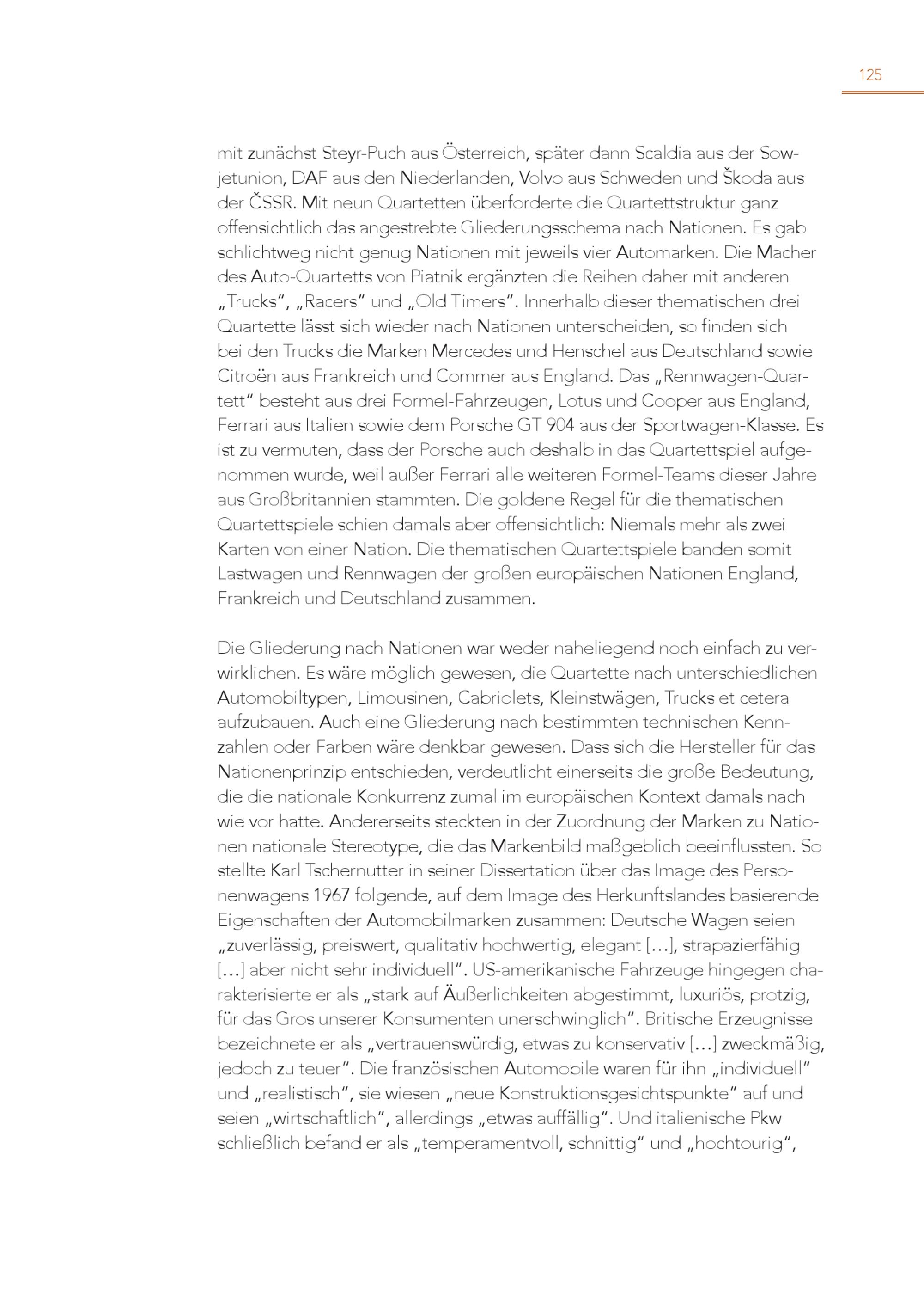 125 mit zunächst Steyr-Puch aus Österreich, später dann Scaldia aus der Sowjetunion, DAF aus den Niederlanden, Volvo aus Schweden und Škoda aus der ČSSR. Mit neun Quartetten überforderte die Quartettstruktur ganz offensichtlich das angestrebte Gliederungsschema nach Nationen. Es gab schlichtweg nicht genug Nationen mit jeweils vier Automarken. Die Macher des Auto-Quartetts von Piatnik ergänzten die Reihen daher mit anderen „Trucks“,„Racers“ und„Old Timers“. Innerhalb dieser thematischen drei Quartette lässt sich wieder nach Nationen unterscheiden, so finden sich bei den Trucks die Marken Mercedes und Henschel aus Deutschland sowie Citroën aus Frankreich und Commer aus England. Das„Rennwagen-Quartett“ besteht aus drei Formel-Fahrzeugen, Lotus und Cooper aus England, Ferrari aus Italien sowie dem Porsche GT 904 aus der Sportwagen-Klasse. Es ist zu vermuten, dass der Porsche auch deshalb in das Quartettspiel aufgenommen wurde, weil außer Ferrari alle weiteren Formel-Teams dieser Jahre aus Großbritannien stammten. Die goldene Regel für die thematischen Quartettspiele schien damals aber offensichtlich: Niemals mehr als zwei Karten von einer Nation. Die thematischen Quartettspiele banden somit Lastwagen und Rennwagen der großen europäischen Nationen England, Frankreich und Deutschland zusammen. Die Gliederung nach Nationen war weder naheliegend noch einfach zu ver wirklichen. Es wäre möglich gewesen, die Quartette nach unterschiedlichen Automobiltypen, Limousinen, Cabriolets, Kleinstwägen, Trucks et cetera aufzubauen. Auch eine Gliederung nach bestimmten technischen Kenn zahlen oder Farben wäre denkbar gewesen. Dass sich die Hersteller für das Nationenprinzip entschieden, verdeutlicht einerseits die große Bedeutung, die die nationale Konkurrenz zumal im europäischen Kontext damals nach wie vor hatte. Andererseits steckten in der Zuordnung der Marken zu Nationen nationale Stereotype, die das Markenbild maßgeblich beeinflussten. So stellte Karl Tschernutter in seiner Dissertation über das Image des Personenwagens 1967 folgende, auf dem Image des Herkunftslandes basierende Eigenschaften der Automobilmarken zusammen: Deutsche Wagen seien „zuverlässig, preiswert, qualitativ hochwertig, elegant[…], strapazierfähig […] aber nicht sehr individuell“. US-amerikanische Fahrzeuge hingegen charakterisierte er als„stark auf Äußerlichkeiten abgestimmt, luxuriös, protzig, für das Gros unserer Konsumenten unerschwinglich“. Britische Erzeugnisse bezeichnete er als„vertrauenswürdig, etwas zu konservativ[…] zweckmäßig, jedoch zu teuer“. Die französischen Automobile waren für ihn„individuell“ und„realistisch“, sie wiesen„neue Konstruktionsgesichtspunkte“ auf und seien„wirtschaftlich“, allerdings„etwas auffällig“. Und italienische Pkw schließlich befand er als„temperamentvoll, schnittig“ und„hochtourig“,