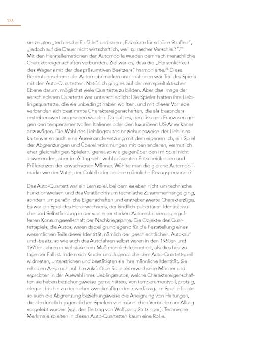 126 sie zeigten„technische Einfälle“ und seien„Fabrikate für schöne Straßen“, „jedoch auf die Dauer nicht wirtschaftlich, weil zu rascher Verschleiß“. 23 Mit den Herstellernationen der Automobile wurden demnach menschliche Charaktereigenschaften verbunden. Ziel war es, dass die„Persönlichkeit des Wagens mit der des präsumtiven Besitzers“ harmonierte. 24 Diese Bedeutungsebene der Automobilmarken und-nationen war Teil des Spiels mit den Auto-Quartetten: Natürlich ging es auf der rein spieltaktischen Ebene darum, möglichst viele Quartette zu bilden. Aber das Image der verschiedenen Quartette war unterschiedlich: Die Spieler hatten ihre Lieblingsquartette, die sie unbedingt haben wollten, und mit dieser Vorliebe verbanden sich bestimmte Charaktereigenschaften, die als besonders erstrebenswert angesehen wurden. Da galt es, den lässigen Franzosen gegen den temperamentvollen Italiener oder den luxuriösen US-Amerikaner abzuwägen. Die Wahl des Lieblingsautos beziehungsweise der Lieblingskarte war so auch eine Auseinandersetzung mit dem eigenen Ich, ein Spiel der Abgrenzungen und Übereinstimmungen mit den anderen, vermutlich eher gleichaltrigen Spielern, genauso wie gegenüber den im Spiel nicht anwesenden, aber im Alltag sehr wohl präsenten Entscheidungen und Präferenzen der erwachsenen Männer. Wählte man die gleiche Automobilmarke wie der Vater, der Onkel oder andere männliche Bezugspersonen? Das Auto-Quartett war ein Lernspiel, bei dem es eben nicht um technische Funktionsweisen und das Verständnis um technische Zusammenhänge ging, sondern um persönliche Eigenschaften und erstrebenswerte Charakterzüge. Es war ein Spiel des Heranwachsens, der kindlich-pubertären Identitätssuche und Selbstfindung in der von einer starken Automobilisierung ergrif fenen Konsumgesellschaft der Nachkriegsjahre. Die Objekte des Quartettspiels, die Autos, waren dabei grundlegend für die Feststellung eines wesentlichen Teils dieser Identität, nämlich der geschlechtlichen. Autokauf und-besitz, so wie auch das Autofahren selbst waren in den 1960er- und 1970er-Jahren in viel stärkerem Maß männlich konnotiert, als dies heutzutage der Fall ist. Indem sich Kinder und Jugendliche dem Auto-Quartettspiel widmeten, unterstrichen und bestätigten sie ihre männliche Identität. Sie erhoben Anspruch auf ihre zukünftige Rolle als erwachsene Männer und erprobten in der Auswahl ihres Lieblingsautos, welche Charaktereigenschaften sie haben beziehungsweise gerne hätten, von temperamentvoll, protzig, elegant bis hin zu doch eher zweckmäßig oder zuverlässig. Im Spiel erfolgte so auch die Abgrenzung beziehungsweise die Aneignung von Haltungen, die den kindlich-jugendlichen Spielern von männlichen Vorbildern im Alltag vorgelebt wurden(vgl. den Beitrag von Wolfgang Stritzinger). Technische Merkmale spielten in diesen Auto-Quartetten kaum eine Rolle.