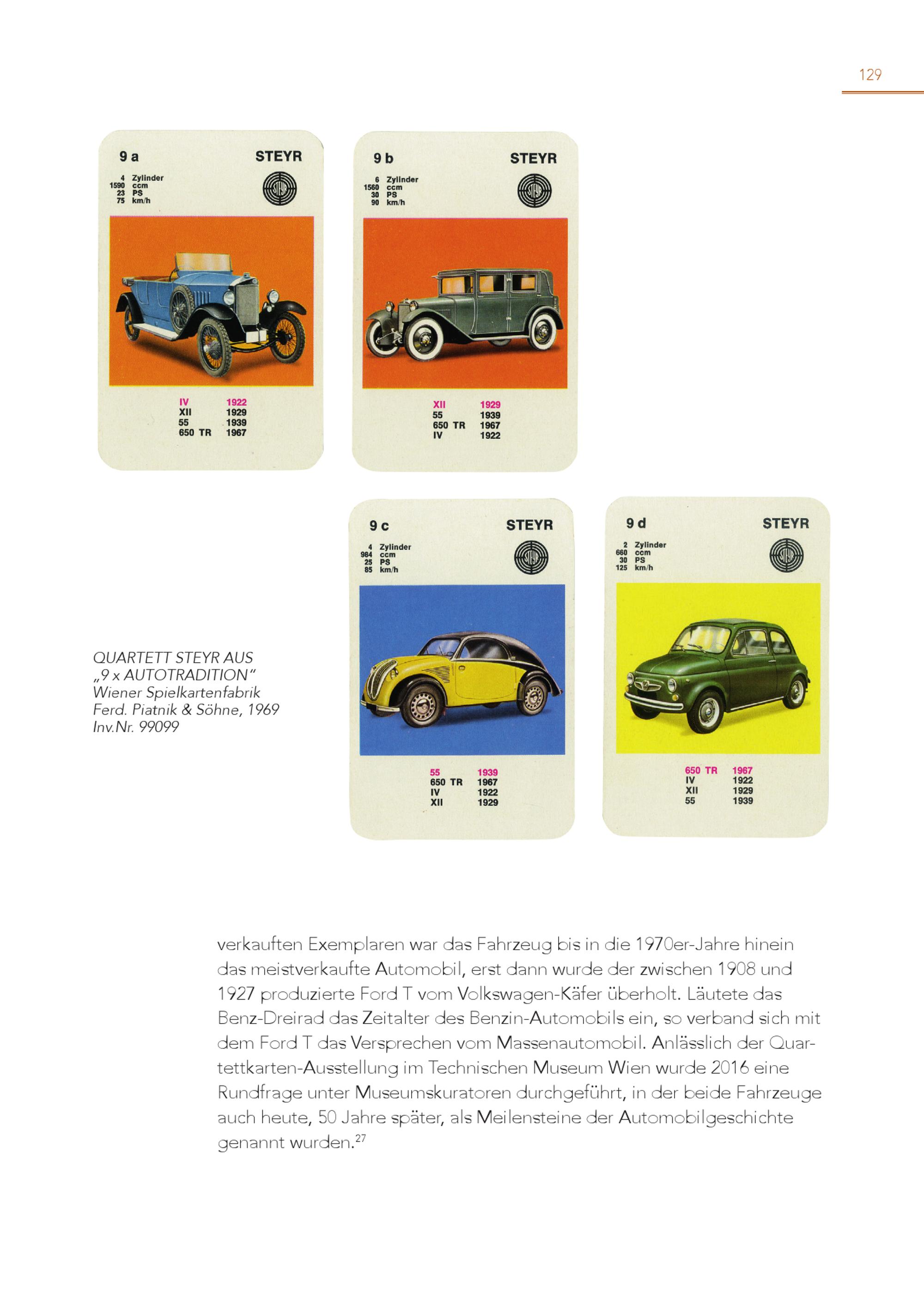 129 QUARTETT STEYR AUS „9 x AUTOTRADITION“ Wiener Spielkartenfabrik Ferd. Piatnik& Söhne, 1969 Inv.Nr. 99099 verkauften Exemplaren war das Fahrzeug bis in die 1970er-Jahre hinein das meistverkaufte Automobil, erst dann wurde der zwischen 1908 und 1927 produzierte Ford T vom Volkswagen-Käfer überholt. Läutete das Benz-Dreirad das Zeitalter des Benzin-Automobils ein, so verband sich mit dem Ford T das Versprechen vom Massenautomobil. Anlässlich der Quartettkarten-Ausstellung im Technischen Museum Wien wurde 2016 eine Rundfrage unter Museumskuratoren durchgeführt, in der beide Fahrzeuge auch heute, 50 Jahre später, als Meilensteine der Automobilgeschichte genannt wurden. 27