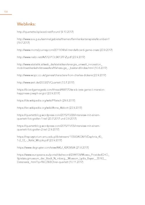 154 Weblinks: http://quartette.bplaced.net/forum/(9.10.2017) http://www.e-s-g.eu/sammelgebiete/themen/familienkartenspiele/krumbein1 (19.7.2017) http://www.mortaljourney.com/2011/04/all-trends/board-game-craze(23.9.2017) http://www.naibi.net/A/512-POLSK1377-Z.pdf(23.9.2017) http://www.statistik.at/web_de/statistiken/energie_umwelt_innovation_ mobilitaet/verkehr/strasse/kraftfahrzeuge_-_bestand/index.html(10.8.2017) http://www.wopc.co.uk/games/characters-from-charles-dickens(23.9.2017) http://www.zeit.de/2003/21/Quartett(13.7.2017) https://boardgamegeek.com/thread/688170/w-s-b-ives-game-ii-mansionhappiness-joseph-angiol(23.9.2017) https://de.wikipedia.org/wiki/Pflatsch(29.8.2017) https://en.wikipedia.org/wiki/Anne_Abbott(23.9.2017) https://quartettblog.wordpress.com/2015/10/28/interview-mit-einemquartett-fotografen-1-teil(20.7.2017 und 3.9.2017) https://quartettblog.wordpress.com/2015/11/05/interview-mit-einemquartett-fotografen-2-teil(3.9.2017) https://repozytorium.amu.edu.pl/bitstream/ 10593/6036/1/Daphnis_40_ 1-2_03_-_Rafal_Wojcik.pdf(23.9.2017) https://www.degruyter.com/view/AKL/_42439586(21.8.2017) https://www.europeana.eu/portal/de/record/2064109/Museu_ProvidedCHO_ Spielzeugmuseum_der_Stadt_N_rnberg__Museum_Lydia_Bayer__35183__ Datensatz_.html?q=f%C3%BChrer-quartett(10.11.2017)