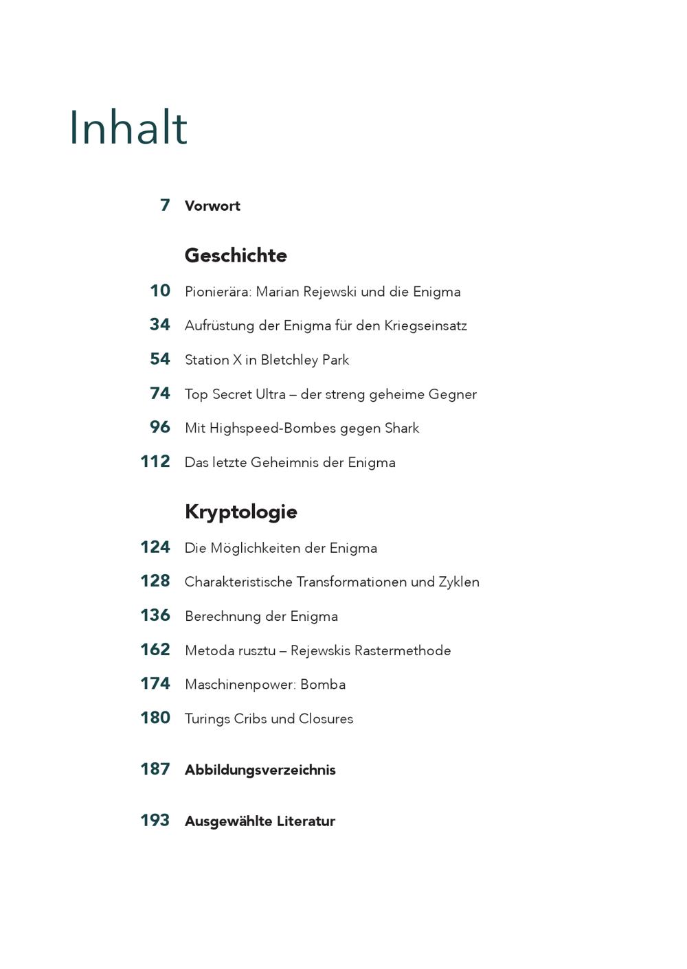 Inhalt 7 Vorwort Geschichte 10 Pionierära: Marian Rejewski und die Enigma 34 Aufrüstung der Enigma für den Kriegseinsatz 54 Station X in Bletchley Park 74 Top Secret Ultra – der streng geheime Gegner 96 Mit Highspeed-Bombes gegen Shark 112 Das letzte Geheimnis der Enigma Kryptologie 124 Die Möglichkeiten der Enigma 128 Charakteristische Transformationen und Zyklen 136 Berechnung der Enigma 162 Metoda rusztu – Rejewskis Rastermethode 174 Maschinenpower: Bomba 180 Turings Cribs und Closures 187 Abbildungsverzeichnis 193 Ausgewählte Literatur