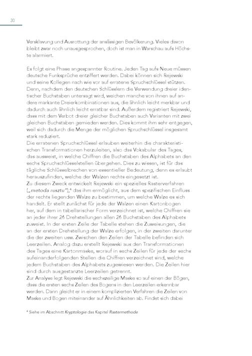 30 Versklavung und Ausrottung der ansässigen Bevölkerung. Vieles davon bleibt zwar noch unausgesprochen, doch ist man in Warschau aufs Höchste alarmiert. Es folgt eine Phase angespannter Routine. Jeden Tag aufs Neue müssen deutsche Funksprüche entziffert werden. Dabei können sich Rejewski und seine Kollegen nach wie vor auf erratene Spruchschlüssel stützen. Denn, nachdem den deutschen Schlüsslern die Verwendung dreier identischer Buchstaben untersagt wird, weichen manche von ihnen auf andere markante Dreierkombinationen aus, die ähnlich leicht merkbar und dadurch auch ähnlich leicht erratbar sind. Außerdem registriert Rejewski, dass mit dem Verbot dreier gleicher Buchstaben auch Varianten mit zwei gleichen Buchstaben gemieden werden. Dies kommt ihm sehr entgegen, weil sich dadurch die Menge der möglichen Spruchschlüssel insgesamt stark reduziert. Die erratenen Spruchschlüssel erlauben weiterhin die charakteristischen Transformationen herzuleiten, also das Vokabular des Tages, das ausweist, in welche Chiffren die Buchstaben des Alphabets an den sechs Spruchschlüsselstellen übergehen. Dies zu wissen, ist für das tägliche Schlüsselbrechen von essentieller Bedeutung, denn es erlaubt herauszufinden, welche der Walzen rechts eingesetzt ist. Zu diesem Zweck entwickelt Rejewski ein spezielles Rasterverfahren („metoda rusztu“), 4 das ihm ermöglicht, aus dem spezifischen Einfluss der rechts liegenden Walze zu bestimmen, um welche Walze es sich handelt. Er stellt zunächst für jede der Walzen einen Kartonbogen her, auf dem in tabellarischer Form verzeichnet ist, welche Chiffren sie an jeder ihrer 26 Drehstellungen allen 26 Buchstaben des Alphabets zuweist. In der ersten Zeile der Tabelle stehen die Zuweisungen, die an der ersten Drehstellung der Walze erfolgen, in der zweiten darunter die der zweiten usw. Zwischen den Zeilen der Tabelle befinden sich Leerzeilen. Analog dazu erstellt Rejewski aus den Transformationen des Tages eine Kartonmaske, worauf in sechs Zeilen für jede der sechs aufeinanderfolgenden Stellen die Chiffren verzeichnet sind, welche jedem Buchstaben des Alphabets zugewiesen werden. Die Zeilen hier sind durch ausgestanzte Leerzeilen getrennt. Zur Analyse legt Rejewski die sechszeilige Maske so auf einen der Bögen, dass die ersten sechs Zeilen des Bogens in den Leerzeilen erkennbar werden. Dann gleicht er in einem komplizierten Verfahren die Zeilen von Maske und Bogen miteinander auf Ähnlichkeiten ab. Findet sich dabei 4 Siehe im Abschnitt Kryptologie das Kapitel Rastermethode