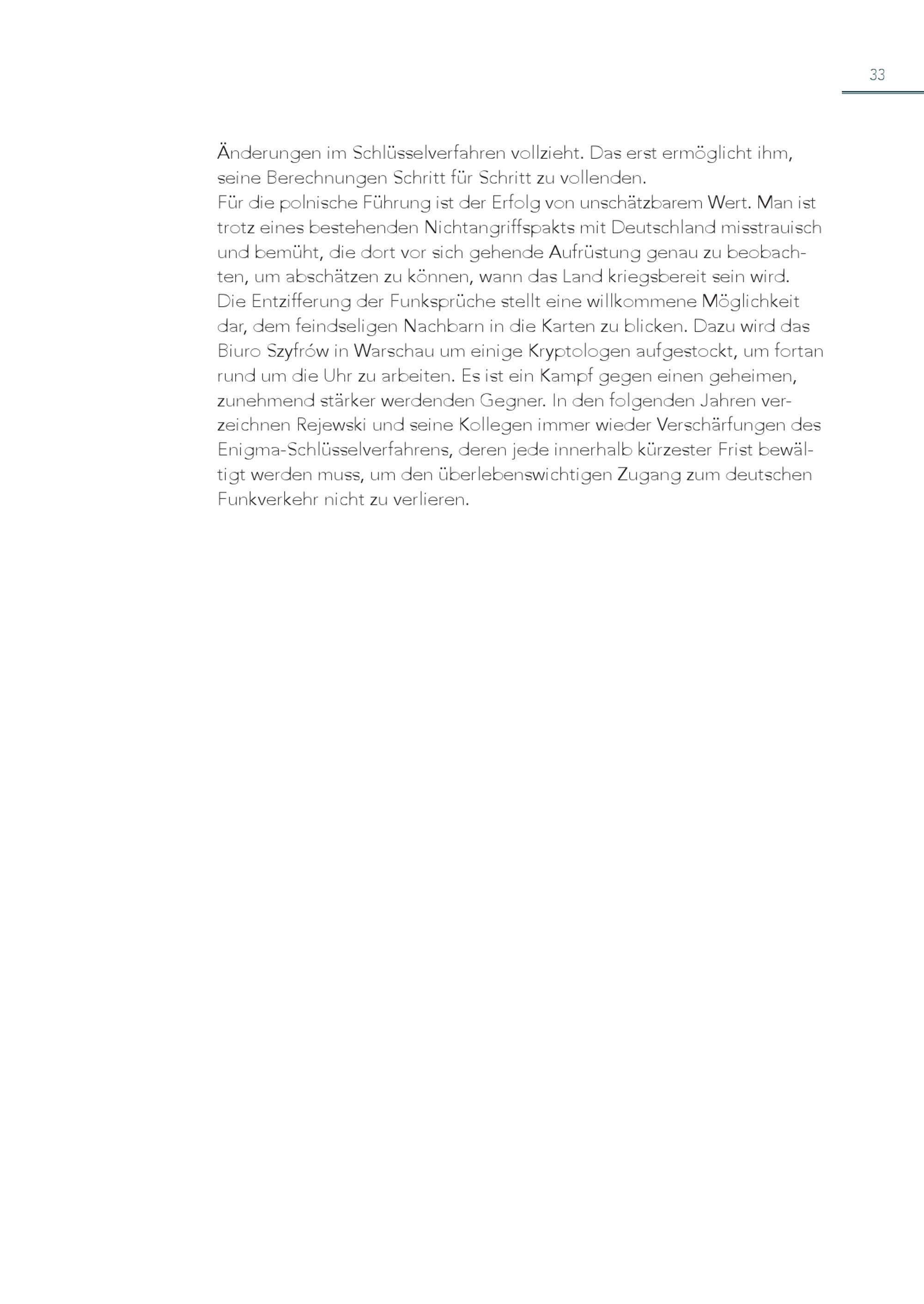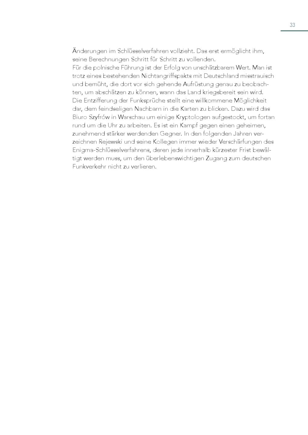 33 Änderungen im Schlüsselverfahren vollzieht. Das erst ermöglicht ihm, seine Berechnungen Schritt für Schritt zu vollenden. Für die polnische Führung ist der Erfolg von unschätzbarem Wert. Man ist trotz eines bestehenden Nichtangriffspakts mit Deutschland misstrauisch und bemüht, die dort vor sich gehende Aufrüstung genau zu beobachten, um abschätzen zu können, wann das Land kriegsbereit sein wird. Die Entzifferung der Funksprüche stellt eine willkommene Möglichkeit dar, dem feindseligen Nachbarn in die Karten zu blicken. Dazu wird das Biuro Szyfrów in Warschau um einige Kryptologen aufgestockt, um fortan rund um die Uhr zu arbeiten. Es ist ein Kampf gegen einen geheimen, zunehmend stärker werdenden Gegner. In den folgenden Jahren verzeichnen Rejewski und seine Kollegen immer wieder Verschärfungen des Enigma-Schlüsselverfahrens, deren jede innerhalb kürzester Frist bewältigt werden muss, um den überlebenswichtigen Zugang zum deutschen Funkverkehr nicht zu verlieren.
