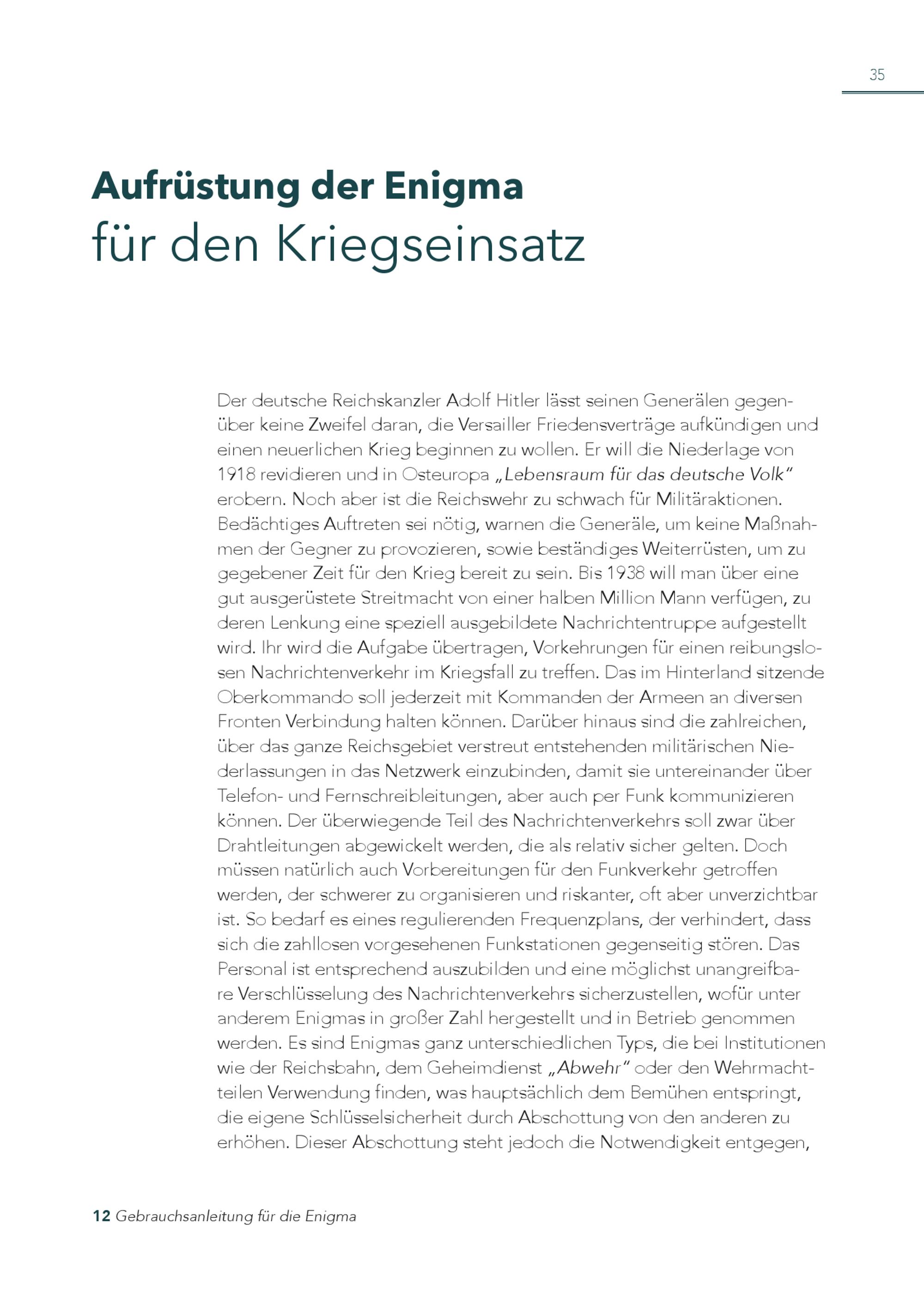 Aufrüstung der Enigma für den Kriegseinsatz 35 Der deutsche Reichskanzler Adolf Hitler lässt seinen Generälen gegenüber keine Zweifel daran, die Versailler Friedensverträge aufkündigen und einen neuerlichen Krieg beginnen zu wollen. Er will die Niederlage von 1918 revidieren und in Osteuropa„Lebensraum für das deutsche Volk“ erobern. Noch aber ist die Reichswehr zu schwach für Militäraktionen. Bedächtiges Auftreten sei nötig, warnen die Generäle, um keine Maßnahmen der Gegner zu provozieren, sowie beständiges Weiterrüsten, um zu gegebener Zeit für den Krieg bereit zu sein. Bis 1938 will man über eine gut ausgerüstete Streitmacht von einer halben Million Mann verfügen, zu deren Lenkung eine speziell ausgebildete Nachrichtentruppe aufgestellt wird. Ihr wird die Aufgabe übertragen, Vorkehrungen für einen reibungslosen Nachrichtenverkehr im Kriegsfall zu treffen. Das im Hinterland sitzende Oberkommando soll jederzeit mit Kommanden der Armeen an diversen Fronten Verbindung halten können. Darüber hinaus sind die zahlreichen, über das ganze Reichsgebiet verstreut entstehenden militärischen Niederlassungen in das Netzwerk einzubinden, damit sie untereinander über Telefon- und Fernschreibleitungen, aber auch per Funk kommunizieren können. Der überwiegende Teil des Nachrichtenverkehrs soll zwar über Drahtleitungen abgewickelt werden, die als relativ sicher gelten. Doch müssen natürlich auch Vorbereitungen für den Funkverkehr getroffen werden, der schwerer zu organisieren und riskanter, oft aber unverzichtbar ist. So bedarf es eines regulierenden Frequenzplans, der verhindert, dass sich die zahllosen vorgesehenen Funkstationen gegenseitig stören. Das Personal ist entsprechend auszubilden und eine möglichst unangreifbare Verschlüsselung des Nachrichtenverkehrs sicherzustellen, wofür unter anderem Enigmas in großer Zahl hergestellt und in Betrieb genommen werden. Es sind Enigmas ganz unterschiedlichen Typs, die bei Institutionen wie der Reichsbahn, dem Geheimdienst„Abwehr“ oder den Wehrmachtteilen Verwendung finden, was hauptsächlich dem Bemühen entspringt, die eigene Schlüsselsicherheit durch Abschottung von den anderen zu erhöhen. Dieser Abschottung steht jedoch die Notwendigkeit entgegen, 12 Gebrauchsanleitung für die Enigma