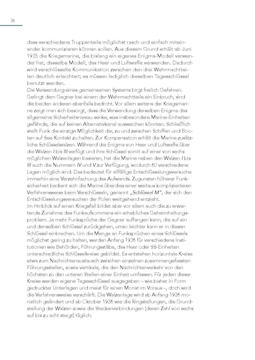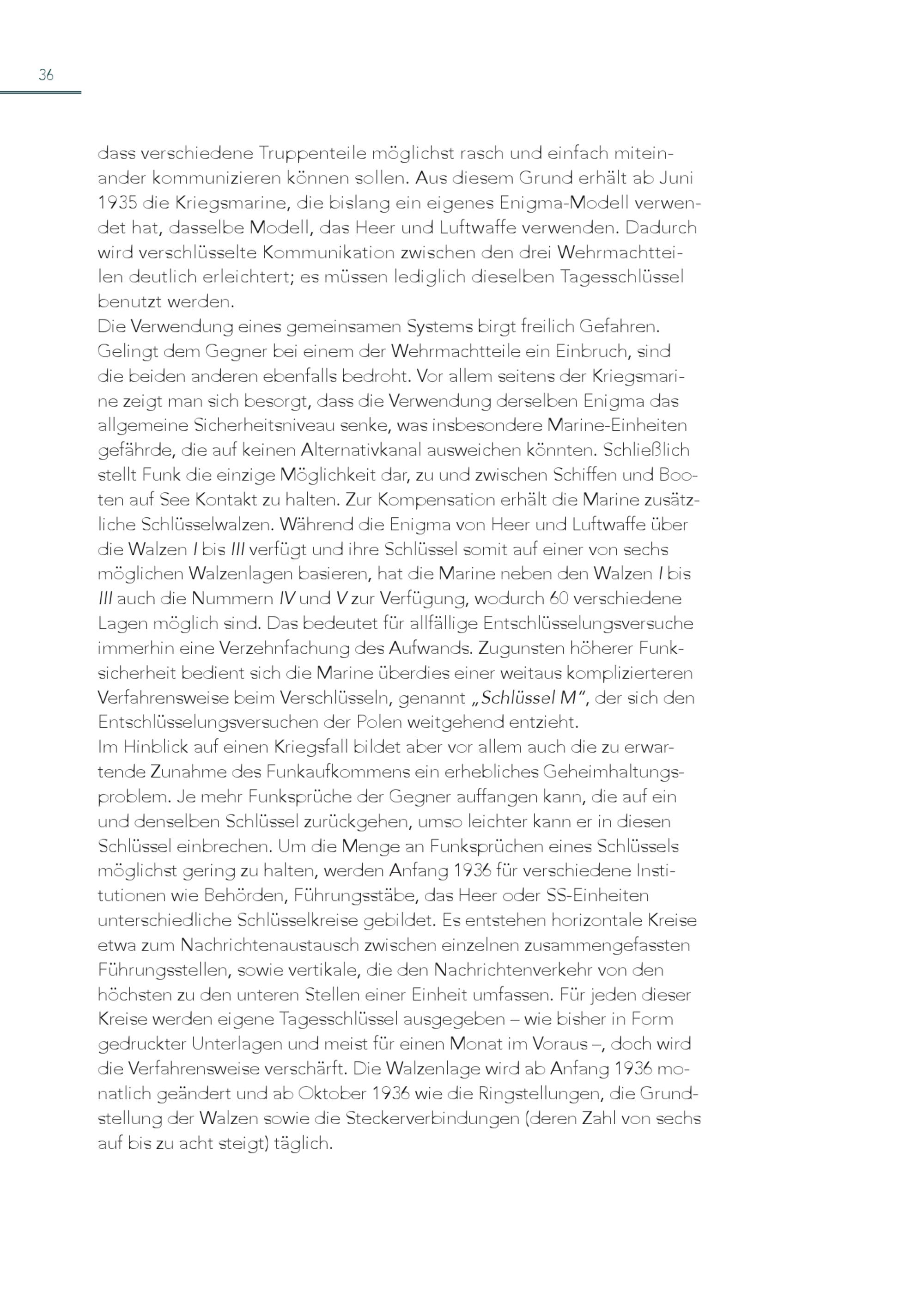 36 dass verschiedene Truppenteile möglichst rasch und einfach miteinander kommunizieren können sollen. Aus diesem Grund erhält ab Juni 1935 die Kriegsmarine, die bislang ein eigenes Enigma-Modell verwendet hat, dasselbe Modell, das Heer und Luftwaffe verwenden. Dadurch wird verschlüsselte Kommunikation zwischen den drei Wehrmachtteilen deutlich erleichtert; es müssen lediglich dieselben Tagesschlüssel benutzt werden. Die Verwendung eines gemeinsamen Systems birgt freilich Gefahren. Gelingt dem Gegner bei einem der Wehrmachtteile ein Einbruch, sind die beiden anderen ebenfalls bedroht. Vor allem seitens der Kriegsmarine zeigt man sich besorgt, dass die Verwendung derselben Enigma das allgemeine Sicherheitsniveau senke, was insbesondere Marine-Einheiten gefährde, die auf keinen Alternativkanal ausweichen könnten. Schließlich stellt Funk die einzige Möglichkeit dar, zu und zwischen Schiffen und Booten auf See Kontakt zu halten. Zur Kompensation erhält die Marine zusätzliche Schlüsselwalzen. Während die Enigma von Heer und Luftwaffe über die Walzen I bis III verfügt und ihre Schlüssel somit auf einer von sechs möglichen Walzenlagen basieren, hat die Marine neben den Walzen I bis III auch die Nummern IV und V zur Verfügung, wodurch 60 verschiedene Lagen möglich sind. Das bedeutet für allfällige Entschlüsselungsversuche immerhin eine Verzehnfachung des Aufwands. Zugunsten höherer Funksicherheit bedient sich die Marine überdies einer weitaus komplizierteren Verfahrensweise beim Verschlüsseln, genannt„Schlüssel M“, der sich den Entschlüsselungsversuchen der Polen weitgehend entzieht. Im Hinblick auf einen Kriegsfall bildet aber vor allem auch die zu erwartende Zunahme des Funkaufkommens ein erhebliches Geheimhaltungsproblem. Je mehr Funksprüche der Gegner auffangen kann, die auf ein und denselben Schlüssel zurückgehen, umso leichter kann er in diesen Schlüssel einbrechen. Um die Menge an Funksprüchen eines Schlüssels möglichst gering zu halten, werden Anfang 1936 für verschiedene Institutionen wie Behörden, Führungsstäbe, das Heer oder SS-Einheiten unterschiedliche Schlüsselkreise gebildet. Es entstehen horizontale Kreise etwa zum Nachrichtenaustausch zwischen einzelnen zusammengefassten Führungsstellen, sowie vertikale, die den Nachrichtenverkehr von den höchsten zu den unteren Stellen einer Einheit umfassen. Für jeden dieser Kreise werden eigene Tagesschlüssel ausgegeben – wie bisher in Form gedruckter Unterlagen und meist für einen Monat im Voraus –, doch wird die Verfahrensweise verschärft. Die Walzenlage wird ab Anfang 1936 monatlich geändert und ab Oktober 1936 wie die Ringstellungen, die Grundstellung der Walzen sowie die Steckerverbindungen(deren Zahl von sechs auf bis zu acht steigt) täglich.