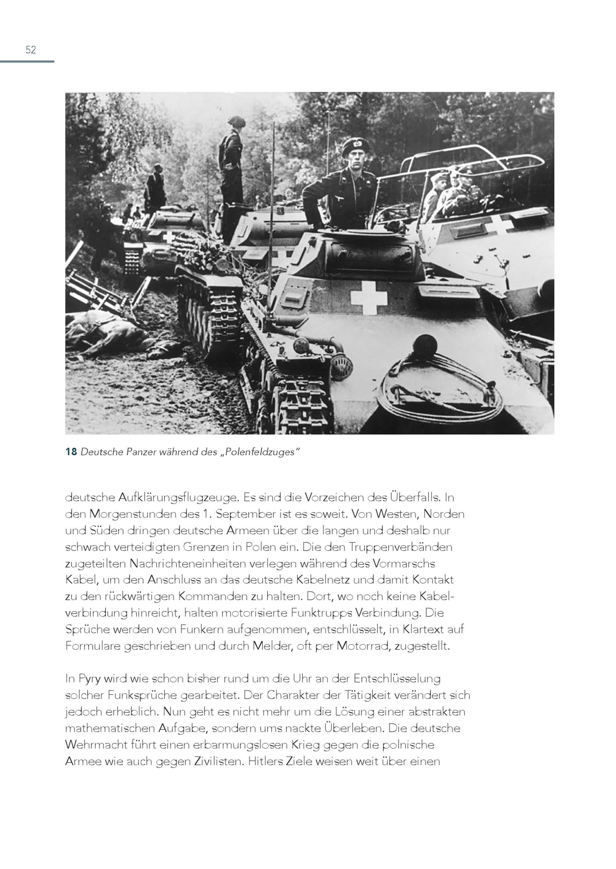 52 18 Deutsche Panzer während des„Polenfeldzuges“ deutsche Aufklärungsflugzeuge. Es sind die Vorzeichen des Überfalls. In den Morgenstunden des 1. September ist es soweit. Von Westen, Norden und Süden dringen deutsche Armeen über die langen und deshalb nur schwach verteidigten Grenzen in Polen ein. Die den Truppenverbänden zugeteilten Nachrichteneinheiten verlegen während des Vormarschs Kabel, um den Anschluss an das deutsche Kabelnetz und damit Kontakt zu den rückwärtigen Kommanden zu halten. Dort, wo noch keine Kabelverbindung hinreicht, halten motorisierte Funktrupps Verbindung. Die Sprüche werden von Funkern aufgenommen, entschlüsselt, in Klartext auf Formulare geschrieben und durch Melder, oft per Motorrad, zugestellt. In Pyry wird wie schon bisher rund um die Uhr an der Entschlüsselung solcher Funksprüche gearbeitet. Der Charakter der Tätigkeit verändert sich jedoch erheblich. Nun geht es nicht mehr um die Lösung einer abstrakten mathematischen Aufgabe, sondern ums nackte Überleben. Die deutsche Wehrmacht führt einen erbarmungslosen Krieg gegen die polnische Armee wie auch gegen Zivilisten. Hitlers Ziele weisen weit über einen