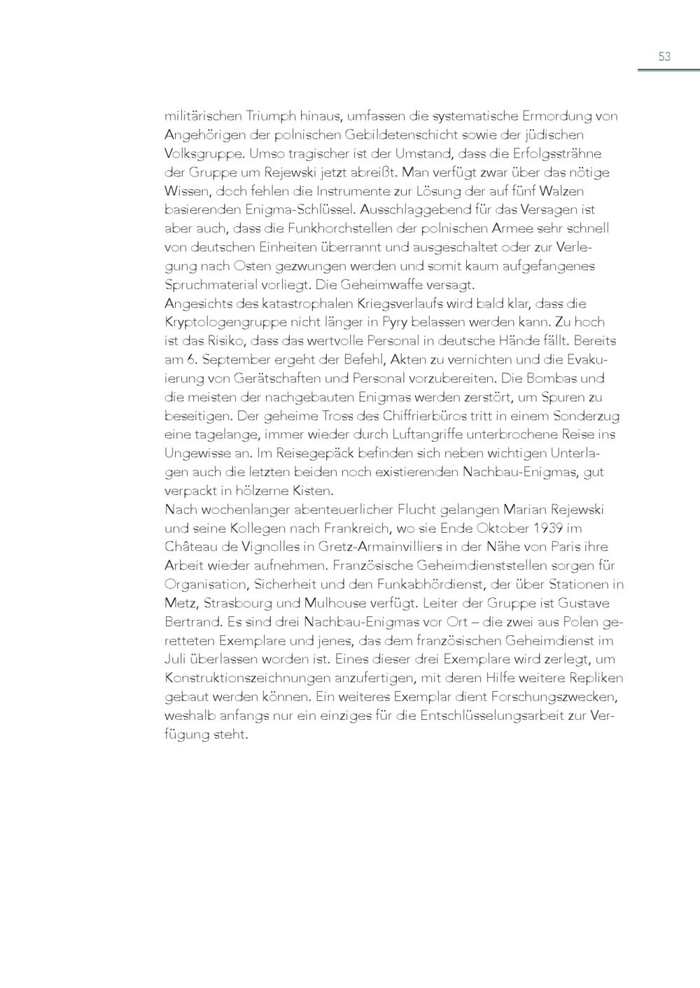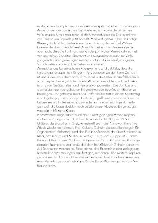 53 militärischen Triumph hinaus, umfassen die systematische Ermordung von Angehörigen der polnischen Gebildetenschicht sowie der jüdischen Volksgruppe. Umso tragischer ist der Umstand, dass die Erfolgssträhne der Gruppe um Rejewski jetzt abreißt. Man verfügt zwar über das nötige Wissen, doch fehlen die Instrumente zur Lösung der auf fünf Walzen basierenden Enigma-Schlüssel. Ausschlaggebend für das Versagen ist aber auch, dass die Funkhorchstellen der polnischen Armee sehr schnell von deutschen Einheiten überrannt und ausgeschaltet oder zur Verlegung nach Osten gezwungen werden und somit kaum aufgefangenes Spruchmaterial vorliegt. Die Geheimwaffe versagt. Angesichts des katastrophalen Kriegsverlaufs wird bald klar, dass die Kryptologengruppe nicht länger in Pyry belassen werden kann. Zu hoch ist das Risiko, dass das wertvolle Personal in deutsche Hände fällt. Bereits am 6. September ergeht der Befehl, Akten zu vernichten und die Evakuierung von Gerätschaften und Personal vorzubereiten. Die Bombas und die meisten der nachgebauten Enigmas werden zerstört, um Spuren zu beseitigen. Der geheime Tross des Chiffrierbüros tritt in einem Sonderzug eine tagelange, immer wieder durch Luftangriffe unterbrochene Reise ins Ungewisse an. Im Reisegepäck befinden sich neben wichtigen Unterla gen auch die letzten beiden noch existierenden Nachbau-Enigmas, gut verpackt in hölzerne Kisten. Nach wochenlanger abenteuerlicher Flucht gelangen Marian Rejewski und seine Kollegen nach Frankreich, wo sie Ende Oktober 1939 im Château de Vignolles in Gretz-Armainvilliers in der Nähe von Paris ihre Arbeit wieder aufnehmen. Französische Geheimdienststellen sorgen für Organisation, Sicherheit und den Funkabhördienst, der über Stationen in Metz, Strasbourg und Mulhouse verfügt. Leiter der Gruppe ist Gustave Bertrand. Es sind drei Nachbau-Enigmas vor Ort – die zwei aus Polen geretteten Exemplare und jenes, das dem französischen Geheimdienst im Juli überlassen worden ist. Eines dieser drei Exemplare wird zerlegt, um Konstruktionszeichnungen anzufertigen, mit deren Hilfe weitere Repliken gebaut werden können. Ein weiteres Exemplar dient Forschungszwecken, weshalb anfangs nur ein einziges für die Entschlüsselungsarbeit zur Verfügung steht.
