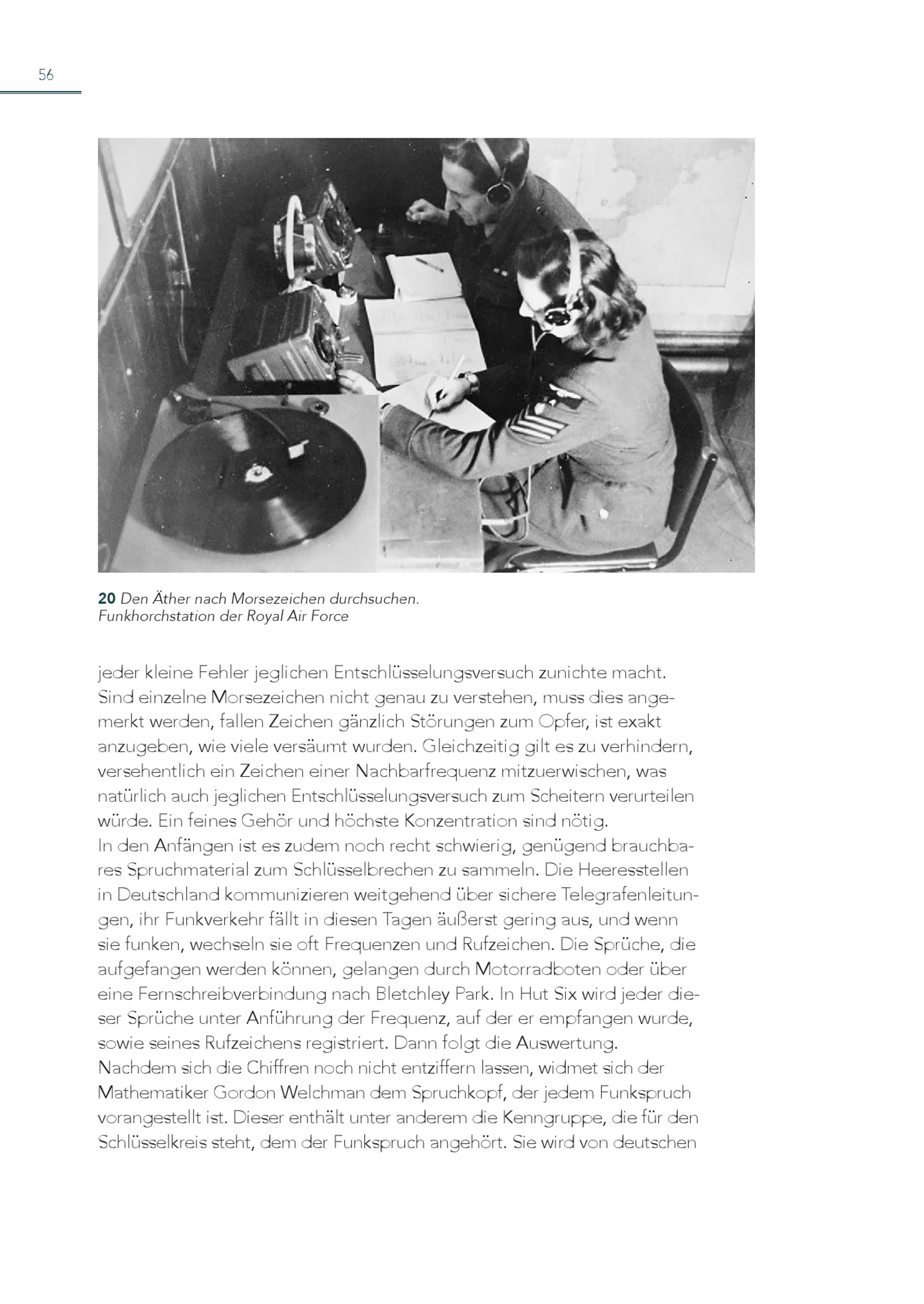 56 20 Den Äther nach Morsezeichen durchsuchen. Funkhorchstation der Royal Air Force jeder kleine Fehler jeglichen Entschlüsselungsversuch zunichte macht. Sind einzelne Morsezeichen nicht genau zu verstehen, muss dies angemerkt werden, fallen Zeichen gänzlich Störungen zum Opfer, ist exakt anzugeben, wie viele versäumt wurden. Gleichzeitig gilt es zu verhindern, versehentlich ein Zeichen einer Nachbarfrequenz mitzuerwischen, was natürlich auch jeglichen Entschlüsselungsversuch zum Scheitern verurteilen würde. Ein feines Gehör und höchste Konzentration sind nötig. In den Anfängen ist es zudem noch recht schwierig, genügend brauchbares Spruchmaterial zum Schlüsselbrechen zu sammeln. Die Heeresstellen in Deutschland kommunizieren weitgehend über sichere Telegrafenleitungen, ihr Funkverkehr fällt in diesen Tagen äußerst gering aus, und wenn sie funken, wechseln sie oft Frequenzen und Rufzeichen. Die Sprüche, die aufgefangen werden können, gelangen durch Motorradboten oder über eine Fernschreibverbindung nach Bletchley Park. In Hut Six wird jeder dieser Sprüche unter Anführung der Frequenz, auf der er empfangen wurde, sowie seines Rufzeichens registriert. Dann folgt die Auswertung. Nachdem sich die Chiffren noch nicht entziffern lassen, widmet sich der Mathematiker Gordon Welchman dem Spruchkopf, der jedem Funkspruch vorangestellt ist. Dieser enthält unter anderem die Kenngruppe, die für den Schlüsselkreis steht, dem der Funkspruch angehört. Sie wird von deutschen