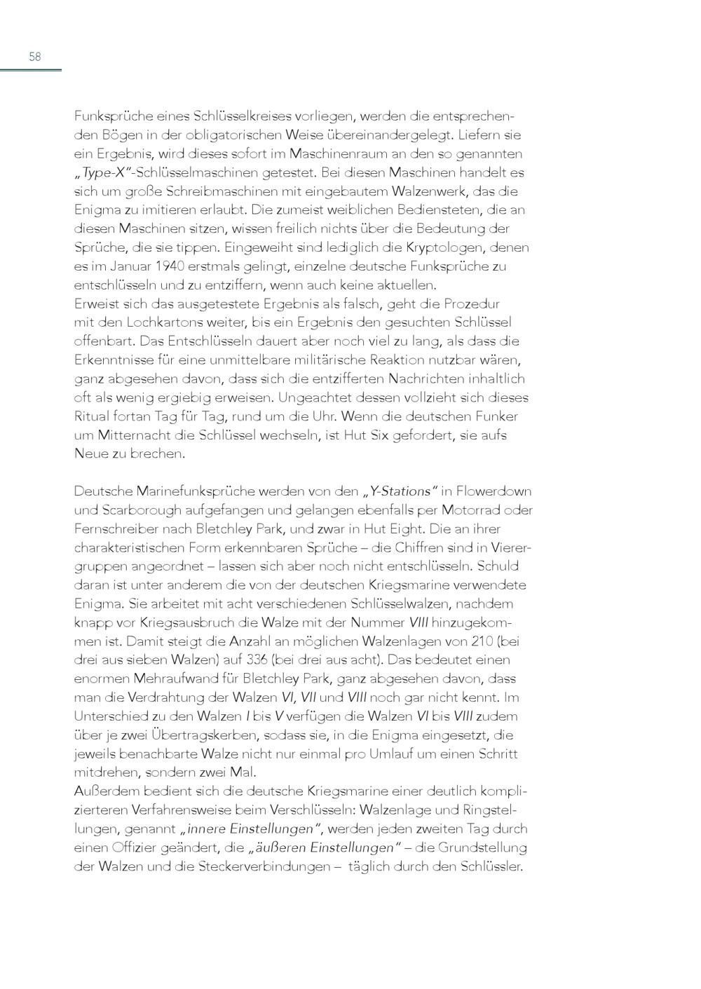 58 Funksprüche eines Schlüsselkreises vorliegen, werden die entsprechenden Bögen in der obligatorischen Weise übereinandergelegt. Liefern sie ein Ergebnis, wird dieses sofort im Maschinenraum an den so genannten „Type-X“-Schlüsselmaschinen getestet. Bei diesen Maschinen handelt es sich um große Schreibmaschinen mit eingebautem Walzenwerk, das die Enigma zu imitieren erlaubt. Die zumeist weiblichen Bediensteten, die an diesen Maschinen sitzen, wissen freilich nichts über die Bedeutung der Sprüche, die sie tippen. Eingeweiht sind lediglich die Kryptologen, denen es im Januar 1940 erstmals gelingt, einzelne deutsche Funksprüche zu entschlüsseln und zu entziffern, wenn auch keine aktuellen. Erweist sich das ausgetestete Ergebnis als falsch, geht die Prozedur mit den Lochkartons weiter, bis ein Ergebnis den gesuchten Schlüssel offenbart. Das Entschlüsseln dauert aber noch viel zu lang, als dass die Erkenntnisse für eine unmittelbare militärische Reaktion nutzbar wären, ganz abgesehen davon, dass sich die entzifferten Nachrichten inhaltlich oft als wenig ergiebig erweisen. Ungeachtet dessen vollzieht sich dieses Ritual fortan Tag für Tag, rund um die Uhr. Wenn die deutschen Funker um Mitternacht die Schlüssel wechseln, ist Hut Six gefordert, sie aufs Neue zu brechen. Deutsche Marinefunksprüche werden von den„Y-Stations“ in Flowerdown und Scarborough aufgefangen und gelangen ebenfalls per Motorrad oder Fernschreiber nach Bletchley Park, und zwar in Hut Eight. Die an ihrer charakteristischen Form erkennbaren Sprüche – die Chiffren sind in Vierergruppen angeordnet – lassen sich aber noch nicht entschlüsseln. Schuld daran ist unter anderem die von der deutschen Kriegsmarine verwendete Enigma. Sie arbeitet mit acht verschiedenen Schlüsselwalzen, nachdem knapp vor Kriegsausbruch die Walze mit der Nummer VIII hinzugekommen ist. Damit steigt die Anzahl an möglichen Walzenlagen von 210(bei drei aus sieben Walzen) auf 336(bei drei aus acht). Das bedeutet einen enormen Mehraufwand für Bletchley Park, ganz abgesehen davon, dass man die Verdrahtung der Walzen VI, VII und VIII noch gar nicht kennt. Im Unterschied zu den Walzen I bis V verfügen die Walzen VI bis VIII zudem über je zwei Übertragskerben, sodass sie, in die Enigma eingesetzt, die jeweils benachbarte Walze nicht nur einmal pro Umlauf um einen Schritt mitdrehen, sondern zwei Mal. Außerdem bedient sich die deutsche Kriegsmarine einer deutlich komplizierteren Verfahrensweise beim Verschlüsseln: Walzenlage und Ringstellungen, genannt„innere Einstellungen“, werden jeden zweiten Tag durch einen Offizier geändert, die„äußeren Einstellungen“ – die Grundstellung der Walzen und die Steckerverbindungen – täglich durch den Schlüssler.