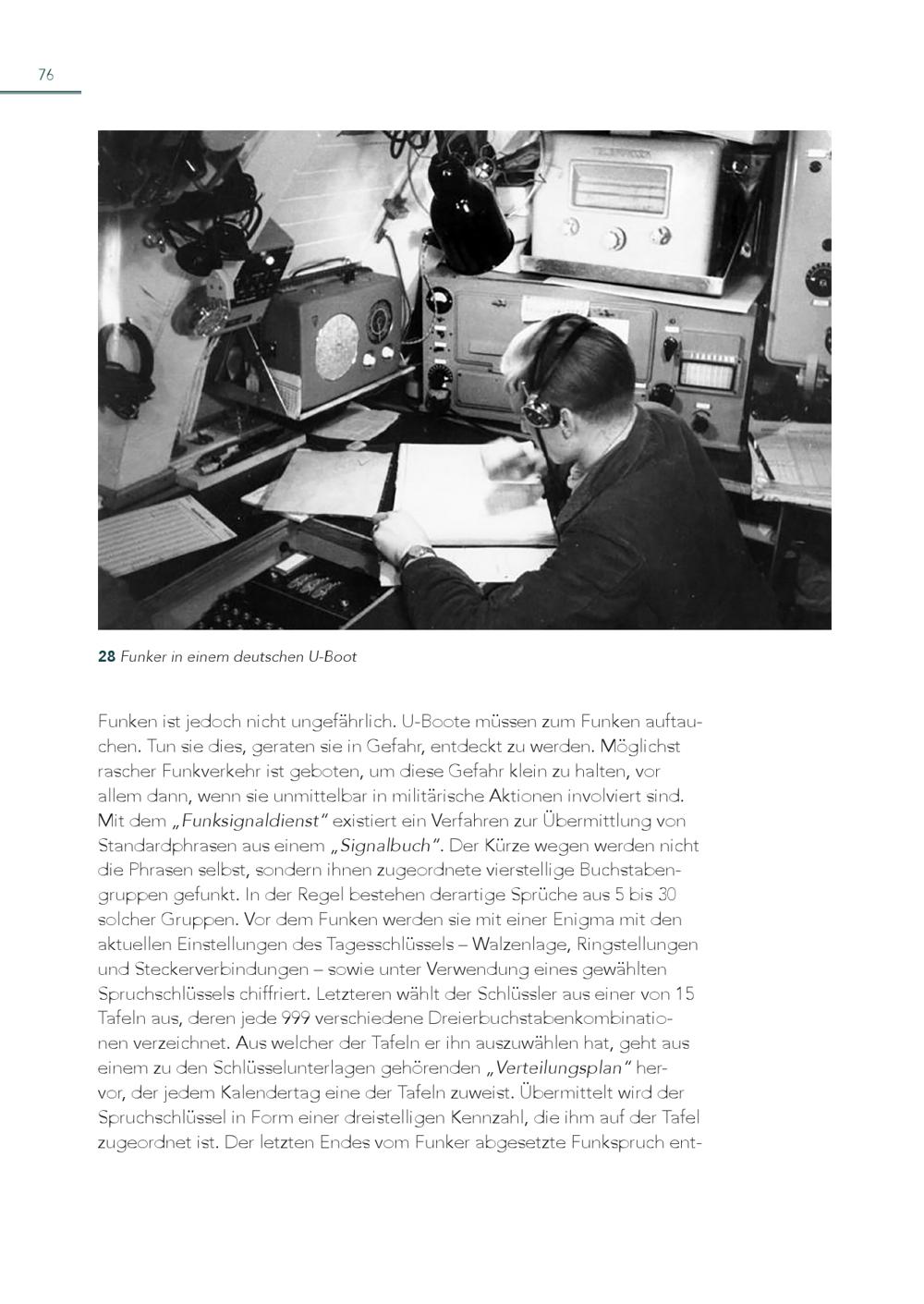 76 28 Funker in einem deutschen U-Boot Funken ist jedoch nicht ungefährlich. U-Boote müssen zum Funken auftauchen. Tun sie dies, geraten sie in Gefahr, entdeckt zu werden. Möglichst rascher Funkverkehr ist geboten, um diese Gefahr klein zu halten, vor allem dann, wenn sie unmittelbar in militärische Aktionen involviert sind. Mit dem„Funksignaldienst“ existiert ein Verfahren zur Übermittlung von Standardphrasen aus einem„Signalbuch“. Der Kürze wegen werden nicht die Phrasen selbst, sondern ihnen zugeordnete vierstellige Buchstabengruppen gefunkt. In der Regel bestehen derartige Sprüche aus 5 bis 30 solcher Gruppen. Vor dem Funken werden sie mit einer Enigma mit den aktuellen Einstellungen des Tagesschlüssels – Walzenlage, Ringstellungen und Steckerverbindungen – sowie unter Verwendung eines gewählten Spruchschlüssels chiffriert. Letzteren wählt der Schlüssler aus einer von 15 Tafeln aus, deren jede 999 verschiedene Dreierbuchstabenkombinationen verzeichnet. Aus welcher der Tafeln er ihn auszuwählen hat, geht aus einem zu den Schlüsselunterlagen gehörenden„Verteilungsplan“ hervor, der jedem Kalendertag eine der Tafeln zuweist. Übermittelt wird der Spruchschlüssel in Form einer dreistelligen Kennzahl, die ihm auf der Tafel zugeordnet ist. Der letzten Endes vom Funker abgesetzte Funkspruch ent-