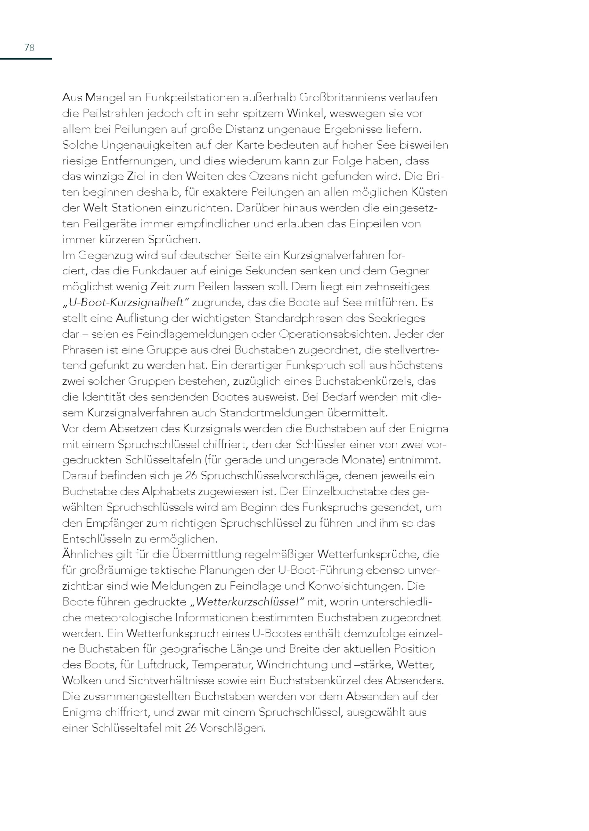 78 Aus Mangel an Funkpeilstationen außerhalb Großbritanniens verlaufen die Peilstrahlen jedoch oft in sehr spitzem Winkel, weswegen sie vor allem bei Peilungen auf große Distanz ungenaue Ergebnisse liefern. Solche Ungenauigkeiten auf der Karte bedeuten auf hoher See bisweilen riesige Entfernungen, und dies wiederum kann zur Folge haben, dass das winzige Ziel in den Weiten des Ozeans nicht gefunden wird. Die Briten beginnen deshalb, für exaktere Peilungen an allen möglichen Küsten der Welt Stationen einzurichten. Darüber hinaus werden die eingesetzten Peilgeräte immer empfindlicher und erlauben das Einpeilen von immer kürzeren Sprüchen. Im Gegenzug wird auf deutscher Seite ein Kurzsignalverfahren forciert, das die Funkdauer auf einige Sekunden senken und dem Gegner möglichst wenig Zeit zum Peilen lassen soll. Dem liegt ein zehnseitiges „U-Boot-Kurzsignalheft“ zugrunde, das die Boote auf See mitführen. Es stellt eine Auflistung der wichtigsten Standardphrasen des Seekrieges dar – seien es Feindlagemeldungen oder Operationsabsichten. Jeder der Phrasen ist eine Gruppe aus drei Buchstaben zugeordnet, die stellvertretend gefunkt zu werden hat. Ein derartiger Funkspruch soll aus höchstens zwei solcher Gruppen bestehen, zuzüglich eines Buchstabenkürzels, das die Identität des sendenden Bootes ausweist. Bei Bedarf werden mit diesem Kurzsignalverfahren auch Standortmeldungen übermittelt. Vor dem Absetzen des Kurzsignals werden die Buchstaben auf der Enigma mit einem Spruchschlüssel chiffriert, den der Schlüssler einer von zwei vorgedruckten Schlüsseltafeln(für gerade und ungerade Monate) entnimmt. Darauf befinden sich je 26 Spruchschlüsselvorschläge, denen jeweils ein Buchstabe des Alphabets zugewiesen ist. Der Einzelbuchstabe des gewählten Spruchschlüssels wird am Beginn des Funkspruchs gesendet, um den Empfänger zum richtigen Spruchschlüssel zu führen und ihm so das Entschlüsseln zu ermöglichen. Ähnliches gilt für die Übermittlung regelmäßiger Wetterfunksprüche, die für großräumige taktische Planungen der U-Boot-Führung ebenso unverzichtbar sind wie Meldungen zu Feindlage und Konvoisichtungen. Die Boote führen gedruckte„Wetterkurzschlüssel“ mit, worin unterschiedliche meteorologische Informationen bestimmten Buchstaben zugeordnet werden. Ein Wetterfunkspruch eines U-Bootes enthält demzufolge einzelne Buchstaben für geografische Länge und Breite der aktuellen Position des Boots, für Luftdruck, Temperatur, Windrichtung und –stärke, Wetter, Wolken und Sichtverhältnisse sowie ein Buchstabenkürzel des Absenders. Die zusammengestellten Buchstaben werden vor dem Absenden auf der Enigma chiffriert, und zwar mit einem Spruchschlüssel, ausgewählt aus einer Schlüsseltafel mit 26 Vorschlägen.
