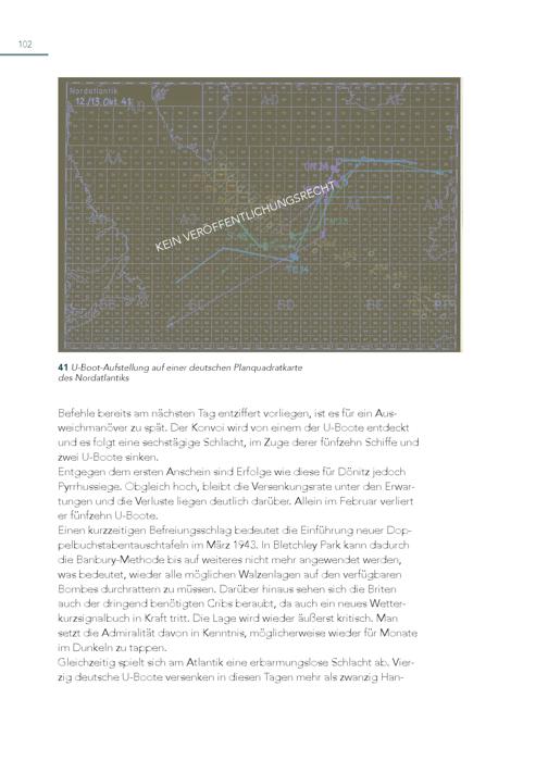 102 KEIN VERÖFFENTLICHUNGSRECHT 41 U-Boot-Aufstellung auf einer deutschen Planquadratkarte des Nordatlantiks Befehle bereits am nächsten Tag entziffert vorliegen, ist es für ein Ausweichmanöver zu spät. Der Konvoi wird von einem der U-Boote entdeckt und es folgt eine sechstägige Schlacht, im Zuge derer fünfzehn Schiffe und zwei U-Boote sinken. Entgegen dem ersten Anschein sind Erfolge wie diese für Dönitz jedoch Pyrrhussiege. Obgleich hoch, bleibt die Versenkungsrate unter den Erwartungen und die Verluste liegen deutlich darüber. Allein im Februar verliert er fünfzehn U-Boote. Einen kurzzeitigen Befreiungsschlag bedeutet die Einführung neuer Doppelbuchstabentauschtafeln im März 1943. In Bletchley Park kann dadurch die Banbury-Methode bis auf weiteres nicht mehr angewendet werden, was bedeutet, wieder alle möglichen Walzenlagen auf den verfügbaren Bombes durchrattern zu müssen. Darüber hinaus sehen sich die Briten auch der dringend benötigten Cribs beraubt, da auch ein neues Wetterkurzsignalbuch in Kraft tritt. Die Lage wird wieder äußerst kritisch. Man setzt die Admiralität davon in Kenntnis, möglicherweise wieder für Monate im Dunkeln zu tappen. Gleichzeitig spielt sich am Atlantik eine erbarmungslose Schlacht ab. Vierzig deutsche U-Boote versenken in diesen Tagen mehr als zwanzig Han-