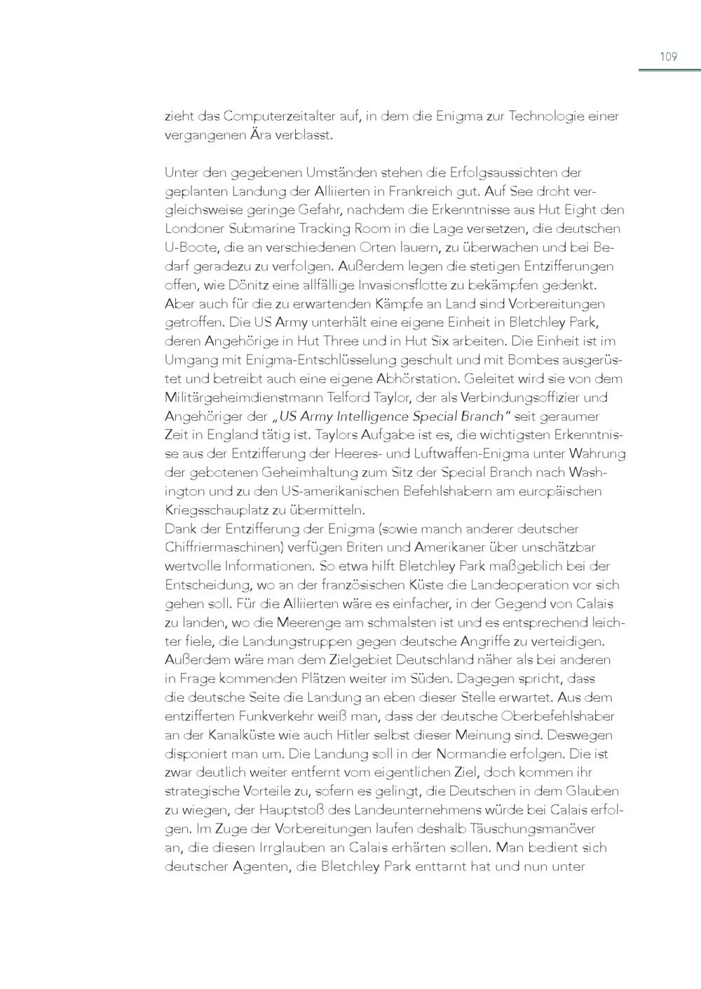 109 zieht das Computerzeitalter auf, in dem die Enigma zur Technologie einer vergangenen Ära verblasst. Unter den gegebenen Umständen stehen die Erfolgsaussichten der geplanten Landung der Alliierten in Frankreich gut. Auf See droht vergleichsweise geringe Gefahr, nachdem die Erkenntnisse aus Hut Eight den Londoner Submarine Tracking Room in die Lage versetzen, die deutschen U-Boote, die an verschiedenen Orten lauern, zu überwachen und bei Bedarf geradezu zu verfolgen. Außerdem legen die stetigen Entzifferungen offen, wie Dönitz eine allfällige Invasionsflotte zu bekämpfen gedenkt. Aber auch für die zu erwartenden Kämpfe an Land sind Vorbereitungen getroffen. Die US Army unterhält eine eigene Einheit in Bletchley Park, deren Angehörige in Hut Three und in Hut Six arbeiten. Die Einheit ist im Umgang mit Enigma-Entschlüsselung geschult und mit Bombes ausgerüstet und betreibt auch eine eigene Abhörstation. Geleitet wird sie von dem Militärgeheimdienstmann Telford Taylor, der als Verbindungsoffizier und Angehöriger der„US Army Intelligence Special Branch“ seit geraumer Zeit in England tätig ist. Taylors Aufgabe ist es, die wichtigsten Erkenntnisse aus der Entzifferung der Heeres- und Luftwaffen-Enigma unter Wahrung der gebotenen Geheimhaltung zum Sitz der Special Branch nach Washington und zu den US-amerikanischen Befehlshabern am europäischen Kriegsschauplatz zu übermitteln. Dank der Entzifferung der Enigma(sowie manch anderer deutscher Chiffriermaschinen) verfügen Briten und Amerikaner über unschätzbar wertvolle Informationen. So etwa hilft Bletchley Park maßgeblich bei der Entscheidung, wo an der französischen Küste die Landeoperation vor sich gehen soll. Für die Alliierten wäre es einfacher, in der Gegend von Calais zu landen, wo die Meerenge am schmalsten ist und es entsprechend leichter fiele, die Landungstruppen gegen deutsche Angriffe zu verteidigen. Außerdem wäre man dem Zielgebiet Deutschland näher als bei anderen in Frage kommenden Plätzen weiter im Süden. Dagegen spricht, dass die deutsche Seite die Landung an eben dieser Stelle erwartet. Aus dem entzifferten Funkverkehr weiß man, dass der deutsche Oberbefehlshaber an der Kanalküste wie auch Hitler selbst dieser Meinung sind. Deswegen disponiert man um. Die Landung soll in der Normandie erfolgen. Die ist zwar deutlich weiter entfernt vom eigentlichen Ziel, doch kommen ihr strategische Vorteile zu, sofern es gelingt, die Deutschen in dem Glauben zu wiegen, der Hauptstoß des Landeunternehmens würde bei Calais erfolgen. Im Zuge der Vorbereitungen laufen deshalb Täuschungsmanöver an, die diesen Irrglauben an Calais erhärten sollen. Man bedient sich deutscher Agenten, die Bletchley Park enttarnt hat und nun unter