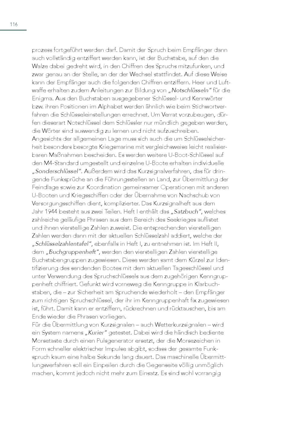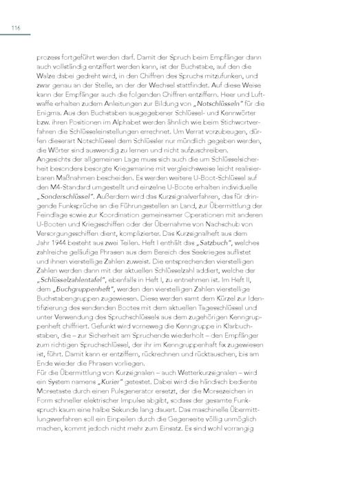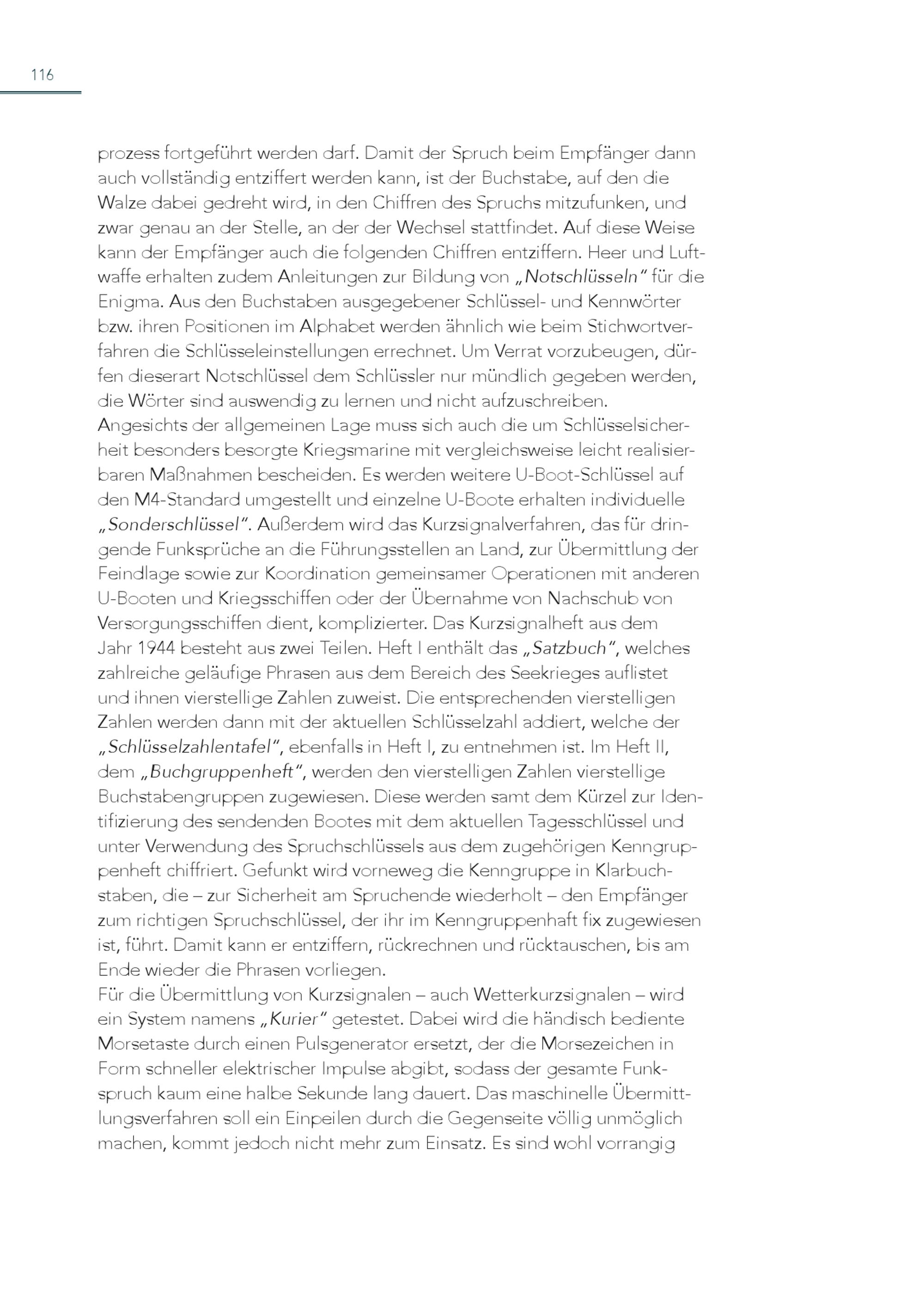 116 prozess fortgeführt werden darf. Damit der Spruch beim Empfänger dann auch vollständig entziffert werden kann, ist der Buchstabe, auf den die Walze dabei gedreht wird, in den Chiffren des Spruchs mitzufunken, und zwar genau an der Stelle, an der der Wechsel stattfindet. Auf diese Weise kann der Empfänger auch die folgenden Chiffren entziffern. Heer und Luftwaffe erhalten zudem Anleitungen zur Bildung von„Notschlüsseln“ für die Enigma. Aus den Buchstaben ausgegebener Schlüssel- und Kennwörter bzw. ihren Positionen im Alphabet werden ähnlich wie beim Stichwortverfahren die Schlüsseleinstellungen errechnet. Um Verrat vorzubeugen, dürfen dieserart Notschlüssel dem Schlüssler nur mündlich gegeben werden, die Wörter sind auswendig zu lernen und nicht aufzuschreiben. Angesichts der allgemeinen Lage muss sich auch die um Schlüsselsicherheit besonders besorgte Kriegsmarine mit vergleichsweise leicht realisierbaren Maßnahmen bescheiden. Es werden weitere U-Boot-Schlüssel auf den M4-Standard umgestellt und einzelne U-Boote erhalten individuelle „Sonderschlüssel“. Außerdem wird das Kurzsignalverfahren, das für dringende Funksprüche an die Führungsstellen an Land, zur Übermittlung der Feindlage sowie zur Koordination gemeinsamer Operationen mit anderen U-Booten und Kriegsschiffen oder der Übernahme von Nachschub von Versorgungsschiffen dient, komplizierter. Das Kurzsignalheft aus dem Jahr 1944 besteht aus zwei Teilen. Heft I enthält das„Satzbuch“, welches zahlreiche geläufige Phrasen aus dem Bereich des Seekrieges auflistet und ihnen vierstellige Zahlen zuweist. Die entsprechenden vierstelligen Zahlen werden dann mit der aktuellen Schlüsselzahl addiert, welche der „Schlüsselzahlentafel“, ebenfalls in Heft I, zu entnehmen ist. Im Heft II, dem„Buchgruppenheft“, werden den vierstelligen Zahlen vierstellige Buchstabengruppen zugewiesen. Diese werden samt dem Kürzel zur Identifizierung des sendenden Bootes mit dem aktuellen Tagesschlüssel und unter Verwendung des Spruchschlüssels aus dem zugehörigen Kenngruppenheft chiffriert. Gefunkt wird vorneweg die Kenngruppe in Klarbuchstaben, die – zur Sicherheit am Spruchende wiederholt – den Empfänger zum richtigen Spruchschlüssel, der ihr im Kenngruppenhaft fix zugewiesen ist, führt. Damit kann er entziffern, rückrechnen und rücktauschen, bis am Ende wieder die Phrasen vorliegen. Für die Übermittlung von Kurzsignalen – auch Wetterkurzsignalen – wird ein System namens„Kurier“ getestet. Dabei wird die händisch bediente Morsetaste durch einen Pulsgenerator ersetzt, der die Morsezeichen in Form schneller elektrischer Impulse abgibt, sodass der gesamte Funkspruch kaum eine halbe Sekunde lang dauert. Das maschinelle Übermittlungsverfahren soll ein Einpeilen durch die Gegenseite völlig unmöglich machen, kommt jedoch nicht mehr zum Einsatz. Es sind wohl vorrangig