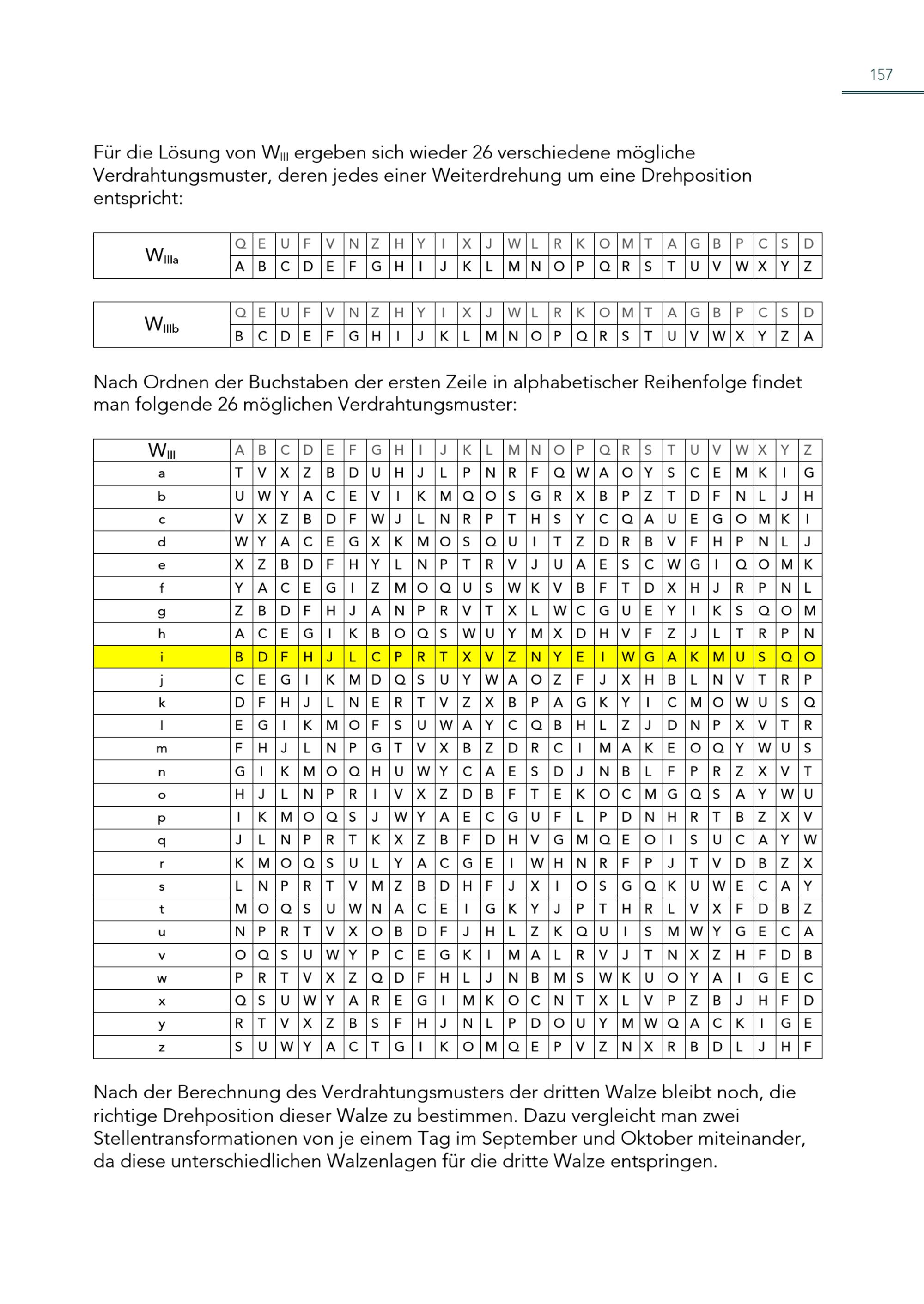 157 Für die Lösung von W III ergeben sich wieder 26 verschiedene mögliche Verdrahtungsmuster, deren jedes einer Weiterdrehung um eine Drehposition entspricht: W IIIa Q E U F V N Z H Y I X J WL R K OMT A G B P C S D A B C D E F G H I J K L MN O P Q R S T U V WX Y Z W IIIb Q E U F V N Z H Y I X J WL R K OMT A G B P C S D B C D E F G H I J K L MN O P Q R S T U V WX Y Z A Nach Ordnen der Buchstaben der ersten Zeile in alphabetischer Reihenfolge findet man folgende 26 möglichen Verdrahtungsmuster: W III a b c d e f g h i j k l m n o p q r s t u v w x y z A B C D E F G H I J K L MN O P Q R S T U V WX Y Z T V X Z B D U H J L P N R F Q WA O Y S C E MK I G U WY A C E V I K MQ O S G R X B P Z T D F N L J H V X Z B D F WJ L N R P T H S Y C QA U E G OMK I WY A C E G X K MO S Q U I T Z D R B V F H P N L J X Z B D F H Y L N P T R V J U A E S C WG I Q O MK Y A C E G I Z MO Q U S WK V B F T D X H J R P N L Z B D F H J A N P R V T X L WC G U E Y I K S Q O M A C E G I K B O Q S WU Y MX D H V F Z J L T R P N B D F H J L C P R T X V Z N Y E I WG A K MU S Q O C E G I K MD Q S U Y WA O Z F J X H B L N V T R P D F H J L N E R T V Z X B P A G K Y I C MO WU S Q E G I K MO F S U WA Y C Q B H L Z J D N P X V T R F H J L N P G T V X B Z D R C I MA K E O Q Y WU S G I K MO Q H U WY C A E S D J N B L F P R Z X V T H J L N P R I V X Z D B F T E K O C MG Q S A Y WU I K MO Q S J WY A E C G U F L P D N H R T B Z X V J L N P R T K X Z B F D H V G MQE O I S U C A Y W K MO Q S U L Y A C G E I WH N R F P J T V D B Z X L N P R T V MZ B D H F J X I O S G Q K U WE C A Y MO Q S U WN A C E I G K Y J P T H R L V X F D B Z N P R T V X O B D F J H L Z K Q U I S MWY G E C A O Q S U WY P C E G K I MA L R V J T N X Z H F D B P R T V X Z Q D F H L J N B MS WK U O Y A I G E C Q S U WY A R E G I MK O C N T X L V P Z B J H F D R T V X Z B S F H J N L P D O U Y MWQ A C K I G E S U WY A C T G I K O MQ E P V Z N X R B D L J H F Nach der Berechnung des Verdrahtungsmusters der dritten Walze bleibt noch, die richtige Drehposition dieser Walze zu bestimmen. Dazu vergleicht man zwei Stellentransformationen von je einem Tag im September und Oktober miteinander, da diese unterschiedlichen Walzenlagen für die dritte Walze entspringen.