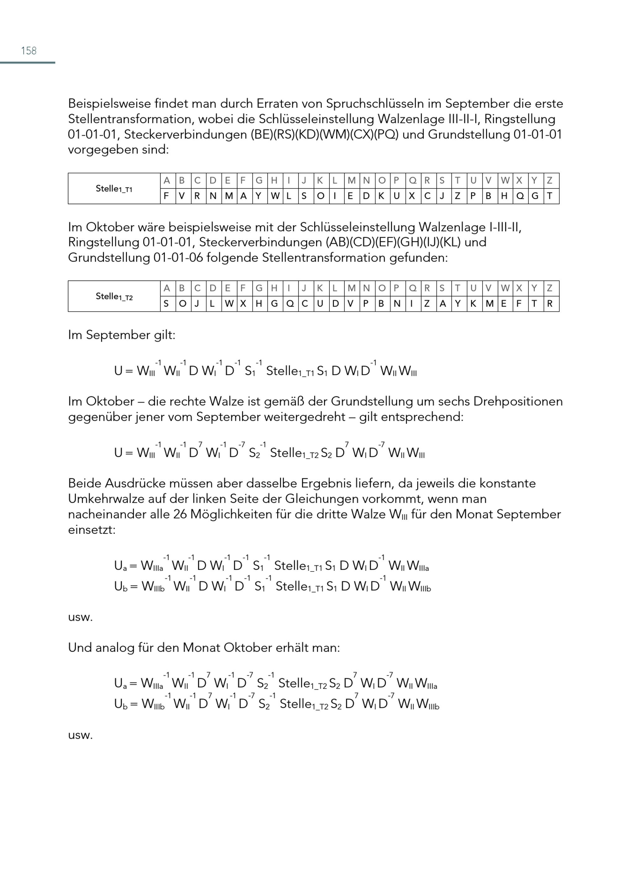 158 Beispielsweise findet man durch Erraten von Spruchschlüsseln im September die erste Stellentransformation, wobei die Schlüsseleinstellung Walzenlage III-II-I, Ringstellung 01-01-01, Steckerverbindungen(BE)(RS)(KD)(WM)(CX)(PQ) und Grundstellung 01-01-01 vorgegeben sind: Stelle 1_T1 A B C D E F G H I J K L MN O P Q R S T U V WX Y Z F V R N MA Y WL S O I E D K U X C J Z P B H Q G T Im Oktober wäre beispielsweise mit der Schlüsseleinstellung Walzenlage I-III-II, Ringstellung 01-01-01, Steckerverbindungen(AB)(CD)(EF)(GH)(IJ)(KL) und Grundstellung 01-01-06 folgende Stellentransformation gefunden: Stelle 1_T2 A B C D E F G H I J K L MN O P Q R S T U V WX Y Z S O J L WX H G Q C U D V P B N I Z A Y K ME F T R Im September gilt: U = W III-1 W II-1 D W I-1 D -1 S 1-1 Stelle 1_T1 S 1 D W I D -1 W II W III Im Oktober – die rechte Walze ist gemäß der Grundstellung um sechs Drehpositionen gegenüber jener vom September weitergedreht – gilt entsprechend: U = W III-1 W II-1 D 7 W I-1 D -7 S 2-1 Stelle 1_T2 S 2 D 7 W I D -7 W II W III Beide Ausdrücke müssen aber dasselbe Ergebnis liefern, da jeweils die konstante Umkehrwalze auf der linken Seite der Gleichungen vorkommt, wenn man nacheinander alle 26 Möglichkeiten für die dritte Walze W III für den Monat September einsetzt: usw. U a = W -1 IIIa W II-1 D W I-1 D -1 S 1-1 Stelle 1_T1 S 1 D W I D -1 W II W IIIa U b = W -1 IIIb W II-1 D W I-1 D -1 S 1-1 Stelle 1_T1 S 1 D W I D -1 W II W IIIb Und analog für den Monat Oktober erhält man: usw. U a = W -1 IIIa W II-1 D 7 W I-1 D -7 S 2-1 Stelle 1_T2 S 2 D 7 W I D -7 W II W IIIa U b = W -1 IIIb W II-1 D 7 W I-1 D -7 S 2-1 Stelle 1_T2 S 2 D 7 W I D -7 W II W IIIb