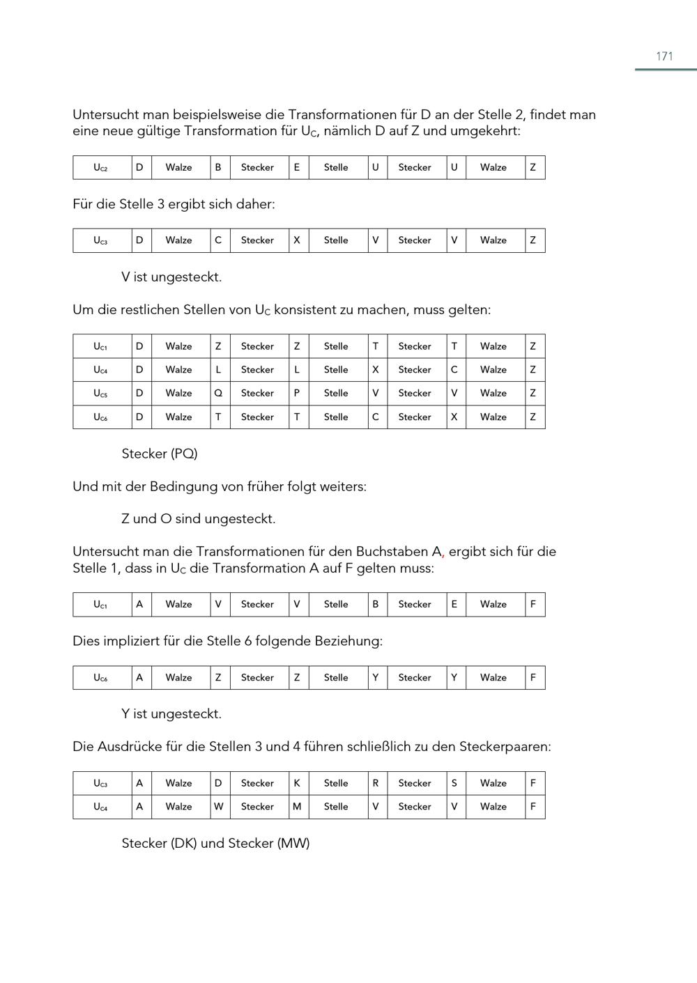 Untersucht man beispielsweise die Transformationen für D an der Stelle 2, findet man eine neue gültige Transformation für U C , nämlich D auf Z und umgekehrt: U C2 D Walze B Stecker E Stelle U Stecker U Walze Z Für die Stelle 3 ergibt sich daher: U C3 D Walze C Stecker X Stelle V Stecker V Walze Z V ist ungesteckt. Um die restlichen Stellen von U C konsistent zu machen, muss gelten: U C1 D Walze Z Stecker Z Stelle T Stecker T Walze Z U C4 D Walze L Stecker L Stelle X Stecker C Walze Z U C5 D Walze Q Stecker P Stelle V Stecker V Walze Z U C6 D Walze T Stecker T Stelle C Stecker X Walze Z Stecker(PQ) Und mit der Bedingung von früher folgt weiters: Z und O sind ungesteckt. Untersucht man die Transformationen für den Buchstaben A, ergibt sich für die Stelle 1, dass in U C die Transformation A auf F gelten muss: U C1 A Walze V Stecker V Stelle B Stecker E Walze F Dies impliziert für die Stelle 6 folgende Beziehung: U C6 A Walze Z Stecker Z Stelle Y Stecker Y Walze F Y ist ungesteckt. Die Ausdrücke für die Stellen 3 und 4 führen schließlich zu den Steckerpaaren: U C3 A Walze D Stecker K Stelle R Stecker S Walze F U C4 A Walze W Stecker M Stelle V Stecker V Walze F Stecker(DK) und Stecker(MW) 171