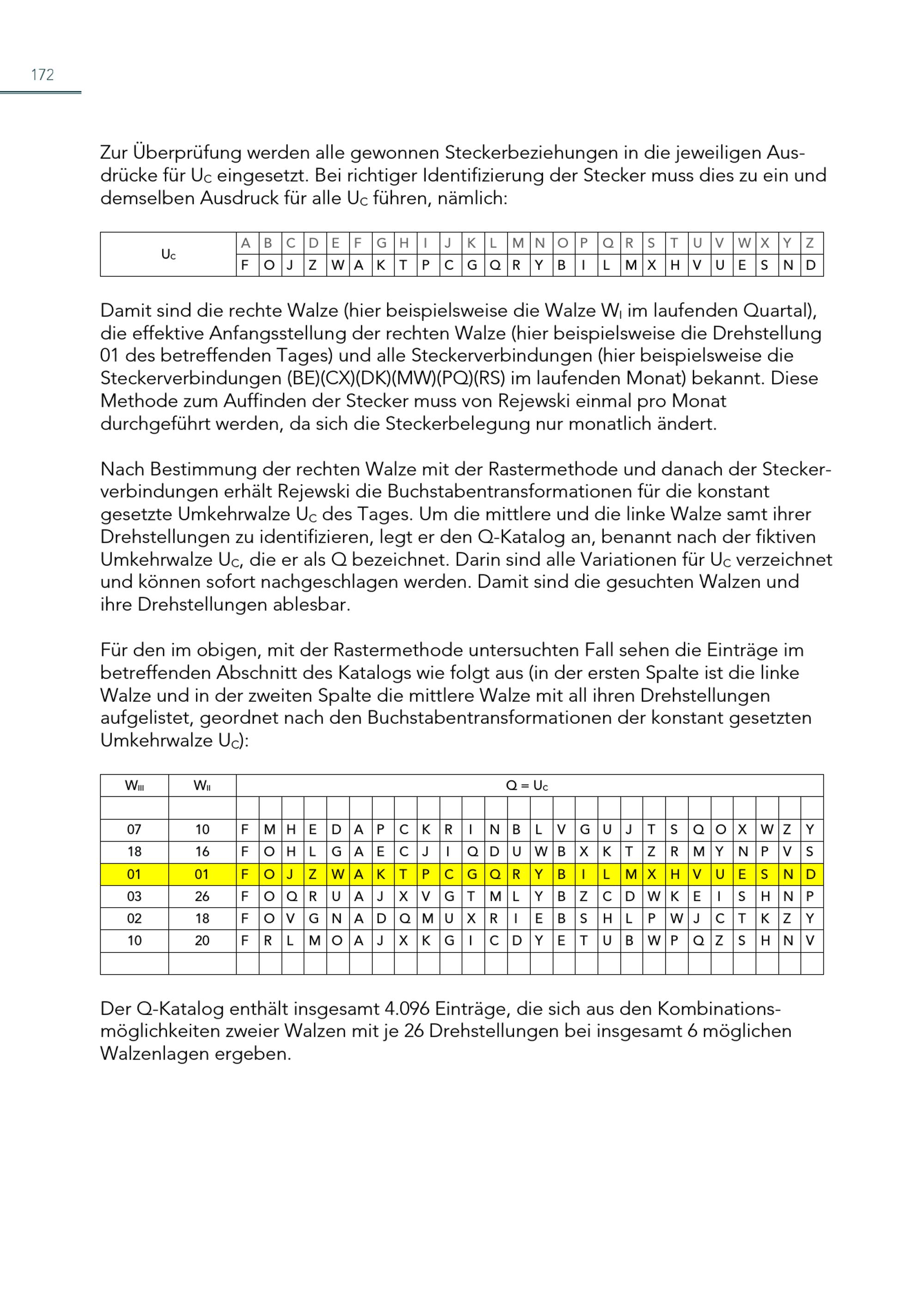 172 Zur Überprüfung werden alle gewonnen Steckerbeziehungen in die jeweiligen Ausdrücke für U C eingesetzt. Bei richtiger Identifizierung der Stecker muss dies zu ein und demselben Ausdruck für alle U C führen, nämlich: A B C D E F G H I J K L MN O P Q R S T U V WX Y Z U C F O J Z W A K T P C G Q R Y B I L M X H V U E S N D Damit sind die rechte Walze(hier beispielsweise die Walze W I im laufenden Quartal), die effektive Anfangsstellung der rechten Walze(hier beispielsweise die Drehstellung 01 des betreffenden Tages) und alle Steckerverbindungen(hier beispielsweise die Steckerverbindungen(BE)(CX)(DK)(MW)(PQ)(RS) im laufenden Monat) bekannt. Diese Methode zum Auffinden der Stecker muss von Rejewski einmal pro Monat durchgeführt werden, da sich die Steckerbelegung nur monatlich ändert. Nach Bestimmung der rechten Walze mit der Rastermethode und danach der Steckerverbindungen erhält Rejewski die Buchstabentransformationen für die konstant gesetzte Umkehrwalze U C des Tages. Um die mittlere und die linke Walze samt ihrer Drehstellungen zu identifizieren, legt er den Q-Katalog an, benannt nach der fiktiven Umkehrwalze U C , die er als Q bezeichnet. Darin sind alle Variationen für U C verzeichnet und können sofort nachgeschlagen werden. Damit sind die gesuchten Walzen und ihre Drehstellungen ablesbar. Für den im obigen, mit der Rastermethode untersuchten Fall sehen die Einträge im betreffenden Abschnitt des Katalogs wie folgt aus(in der ersten Spalte ist die linke Walze und in der zweiten Spalte die mittlere Walze mit all ihren Drehstellungen aufgelistet, geordnet nach den Buchstabentransformationen der konstant gesetzten Umkehrwalze U C ): W III W II Q= U C 07 10 F M H E D A P C K R I N B L V G U J T S Q O X W Z Y 18 16 F O H L G A E C J I Q D U W B X K T Z R M Y N P V S 01 01 F O J Z W A K T P C G Q R Y B I L M X H V U E S N D 03 26 F O Q R U A J X V G T M L Y B Z C D W K E I S H N P 02 18 F O V G N A D Q M U X R I E B S H L P W J C T K Z Y 10 20 F R L M O A J X K G I C D Y E T U B W P Q Z S H N V Der Q-Katalog enthält insgesamt 4.096 Einträge, die sich aus den Kombinationsmöglichkeiten zweier Walzen mit je 26 Drehstellungen bei insgesamt 6 möglichen Walzenlagen ergeben.