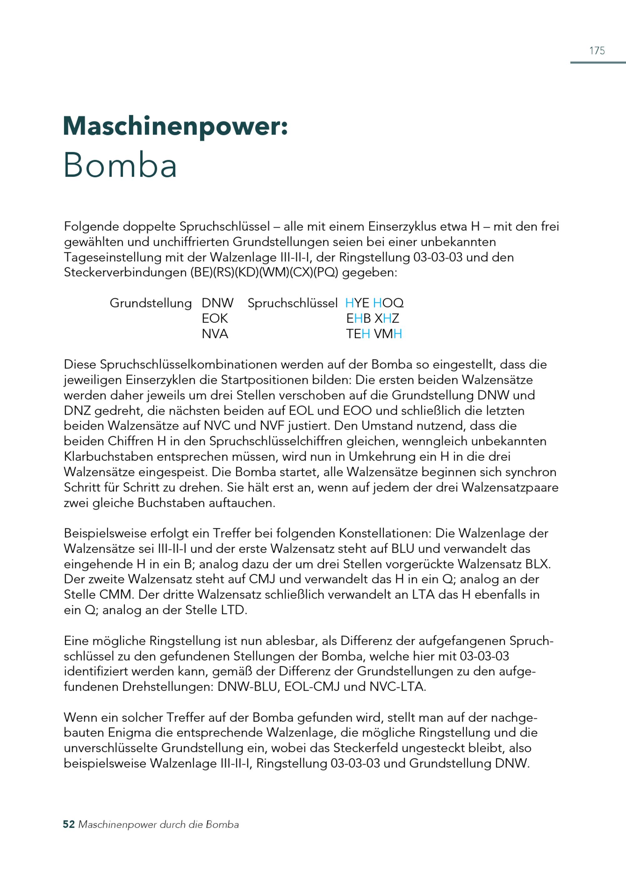 175 M Mas a ch s i c ne h np in ow e e n r: B p o o mb w a er: Bomba Folgende doppelte Spruchschlüssel – alle mit einem Einserzyklus etwa H – mit den frei gewählten und unchiffrierten Grundstellungen seien bei einer unbekannten Tageseinstellung mit der Walzenlage III-II-I, der Ringstellung 03-03-03 und den Steckerverbindungen(BE)(RS)(KD)(WM)(CX)(PQ) gegeben: Grundstellung DNW Spruchschlüssel HYE HOQ EOK EHB XHZ NVA TEH VMH Diese Spruchschlüsselkombinationen werden auf der Bomba so eingestellt, dass die jeweiligen Einserzyklen die Startpositionen bilden: Die ersten beiden Walzensätze werden daher jeweils um drei Stellen verschoben auf die Grundstellung DNW und DNZ gedreht, die nächsten beiden auf EOL und EOO und schließlich die letzten beiden Walzensätze auf NVC und NVF justiert. Den Umstand nutzend, dass die beiden Chiffren H in den Spruchschlüsselchiffren gleichen, wenngleich unbekannten Klarbuchstaben entsprechen müssen, wird nun in Umkehrung ein H in die drei Walzensätze eingespeist. Die Bomba startet, alle Walzensätze beginnen sich synchron Schritt für Schritt zu drehen. Sie hält erst an, wenn auf jedem der drei Walzensatzpaare zwei gleiche Buchstaben auftauchen. Beispielsweise erfolgt ein Treffer bei folgenden Konstellationen: Die Walzenlage der Walzensätze sei III-II-I und der erste Walzensatz steht auf BLU und verwandelt das eingehende H in ein B; analog dazu der um drei Stellen vorgerückte Walzensatz BLX. Der zweite Walzensatz steht auf CMJ und verwandelt das H in ein Q; analog an der Stelle CMM. Der dritte Walzensatz schließlich verwandelt an LTA das H ebenfalls in ein Q; analog an der Stelle LTD. Eine mögliche Ringstellung ist nun ablesbar, als Differenz der aufgefangenen Spruchschlüssel zu den gefundenen Stellungen der Bomba, welche hier mit 03-03-03 identifiziert werden kann, gemäß der Differenz der Grundstellungen zu den aufgefundenen Drehstellungen: DNW-BLU, EOL-CMJ und NVC-LTA. Wenn ein solcher Treffer auf der Bomba gefunden wird, stellt man auf der nachgebauten Enigma die entsprechende Walzenlage, die mögliche Ringstellung und die unverschlüsselte Grundstellung ein, wobei das Steckerfeld ungesteckt bleibt, also beispielsweise Walzenlage III-II-I, Ringstellung 03-03-03 und Grundstellung DNW. 52 Maschinenpower durch die Bomba