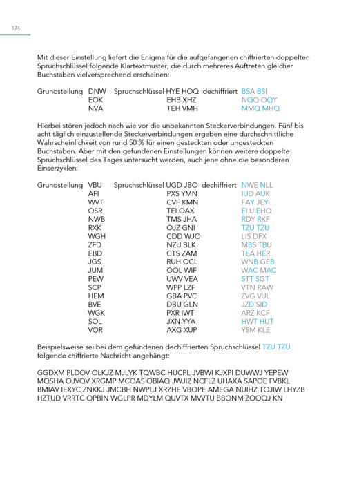 176 Mit dieser Einstellung liefert die Enigma für die aufgefangenen chiffrierten doppelten Spruchschlüssel folgende Klartextmuster, die durch mehreres Auftreten gleicher Buchstaben vielversprechend erscheinen: Grundstellung DNW Spruchschlüssel HYE HOQ dechiffriert BSA BSI EOK EHB XHZ NQQ OQY NVA TEH VMH MMQ MHQ Hierbei stören jedoch nach wie vor die unbekannten Steckerverbindungen. Fünf bis acht täglich einzustellende Steckerverbindungen ergeben eine durchschnittliche Wahrscheinlichkeit von rund 50% für einen gesteckten oder ungesteckten Buchstaben. Aber mit den gefundenen Einstellungen können weitere doppelte Spruchschlüssel des Tages untersucht werden, auch jene ohne die besonderen Einserzyklen: Grundstellung VBU AFI WVT OSR NWB RXK WGH ZFD EBD JGS JUM PEW SCP HEM BVE WGK SOL VOR Spruchschlüssel UGD JBO dechiffriert NWE NLL PXS YMN IUD AUK CVF KMN FAY JEY TEI OAX ELU EHQ TMS JHA RDY RKF OJZ GNI TZU TZU CDD WJO LIS DFX NZU BLK MBS TBU CTS ZAM TEA HER RUH QCL WNB GEB OOL WIF WAC MAC UWV VEA STT SGT WPP LZF VTN RAW GBA PVC ZVG VUL DBU GLN JZD SID PXR IWT ARZ KCF JXN YYA HWT HUT AXG XUP YSM KLE Beispielsweise sei bei dem gefundenen dechiffrierten Spruchschlüssel TZU TZU folgende chiffrierte Nachricht angehängt: GGDXM PLDOV OLKJZ MJLYK TQWBC HUCPL JVBWI KJXPI DUWWJ YEPEW MQSHA OJVQV XRGMP MCOAS OBIAQ JWJIZ NCFLZ UHAXA SAPOE FVBKL BMIAV IEXYC ZNKKJ JMCBH NWPLJ XRZHE VBQPE AMEGA NUIHZ TOJIW LHYZB HZTUD VRRTC OPBIN WGLPR MDYLM QUVTX MVVTU BBONM ZOOQJ KN