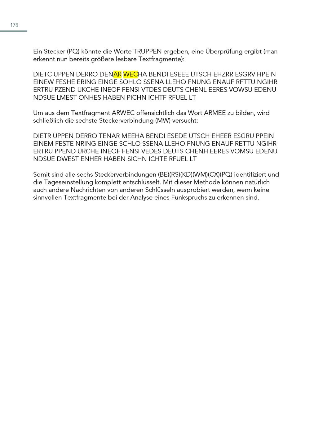 178 Ein Stecker(PQ) könnte die Worte TRUPPEN ergeben, eine Überprüfung ergibt(man erkennt nun bereits größere lesbare Textfragmente): DIETC UPPEN DERRO DENAR WECHA BENDI ESEEE UTSCH EHZRR ESGRV HPEIN EINEW FESHE ERING EINGE SOHLO SSENA LLEHO FNUNG ENAUF RFTTU NGIHR ERTRU PZEND UKCHE INEOF FENSI VTDES DEUTS CHENL EERES VOWSU EDENU NDSUE LMEST ONHES HABEN PICHN ICHTF RFUEL LT Um aus dem Textfragment ARWEC offensichtlich das Wort ARMEE zu bilden, wird schließlich die sechste Steckerverbindung(MW) versucht: DIETR UPPEN DERRO TENAR MEEHA BENDI ESEDE UTSCH EHEER ESGRU PPEIN EINEM FESTE NRING EINGE SCHLO SSENA LLEHO FNUNG ENAUF RETTU NGIHR ERTRU PPEND URCHE INEOF FENSI VEDES DEUTS CHENH EERES VOMSU EDENU NDSUE DWEST ENHER HABEN SICHN ICHTE RFUEL LT Somit sind alle sechs Steckerverbindungen(BE)(RS)(KD)(WM)(CX)(PQ) identifiziert und die Tageseinstellung komplett entschlüsselt. Mit dieser Methode können natürlich auch andere Nachrichten von anderen Schlüsseln ausprobiert werden, wenn keine sinnvollen Textfragmente bei der Analyse eines Funkspruchs zu erkennen sind.