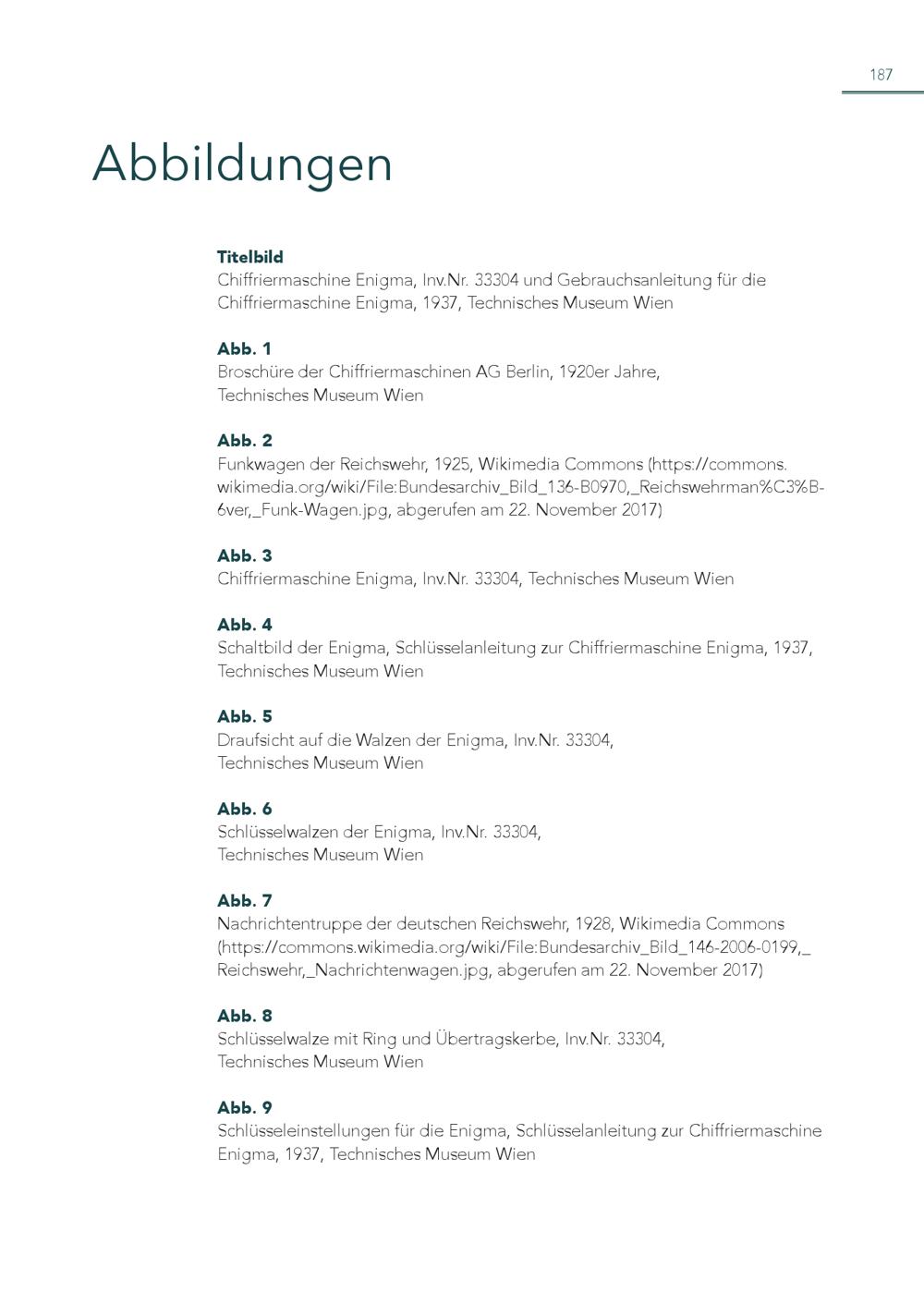 Abbildungen 187 Titelbild Chiffriermaschine Enigma, Inv.Nr. 33304 und Gebrauchsanleitung für die Chiffriermaschine Enigma, 1937, Technisches Museum Wien Abb. 1 Broschüre der Chiffriermaschinen AG Berlin, 1920er Jahre, Technisches Museum Wien Abb. 2 Funkwagen der Reichswehr, 1925, Wikimedia Commons(https://commons. wikimedia.org/wiki/File:Bundesarchiv_Bild_136-B0970,_Reichswehrman%C3%B6ver,_Funk-Wagen.jpg, abgerufen am 22. November 2017) Abb. 3 Chiffriermaschine Enigma, Inv.Nr. 33304, Technisches Museum Wien Abb. 4 Schaltbild der Enigma, Schlüsselanleitung zur Chiffriermaschine Enigma, 1937, Technisches Museum Wien Abb. 5 Draufsicht auf die Walzen der Enigma, Inv.Nr. 33304, Technisches Museum Wien Abb. 6 Schlüsselwalzen der Enigma, Inv.Nr. 33304, Technisches Museum Wien Abb. 7 Nachrichtentruppe der deutschen Reichswehr, 1928, Wikimedia Commons (https://commons.wikimedia.org/wiki/File:Bundesarchiv_Bild_146-2006-0199,_ Reichswehr,_Nachrichtenwagen.jpg, abgerufen am 22. November 2017) Abb. 8 Schlüsselwalze mit Ring und Übertragskerbe, Inv.Nr. 33304, Technisches Museum Wien Abb. 9 Schlüsseleinstellungen für die Enigma, Schlüsselanleitung zur Chiffriermaschine Enigma, 1937, Technisches Museum Wien