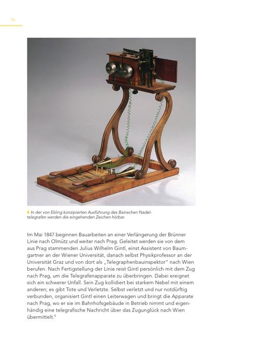 16 4 In der von Ekling konzipierten Ausführung des Bainschen Nadeltelegrafen werden die eingehenden Zeichen hörbar. Im Mai 1847 beginnen Bauarbeiten an einer Verlängerung der Brünner Linie nach Olmütz und weiter nach Prag. Geleitet werden sie von dem aus Prag stammenden Julius Wilhelm Gintl, einst Assistent von Baumgartner an der Wiener Universität, danach selbst Physikprofessor an der Universität Graz und von dort als„Telegraphenbauinspektor“ nach Wien berufen. Nach Fertigstellung der Linie reist Gintl persönlich mit dem Zug nach Prag, um die Telegrafenapparate zu überbringen. Dabei ereignet sich ein schwerer Unfall. Sein Zug kollidiert bei starkem Nebel mit einem anderen; es gibt Tote und Verletzte. Selbst verletzt und nur notdürftig verbunden, organisiert Gintl einen Leiterwagen und bringt die Apparate nach Prag, wo er sie im Bahnhofsgebäude in Betrieb nimmt und eigenhändig eine telegrafische Nachricht über das Zugunglück nach Wien übermittelt. 9