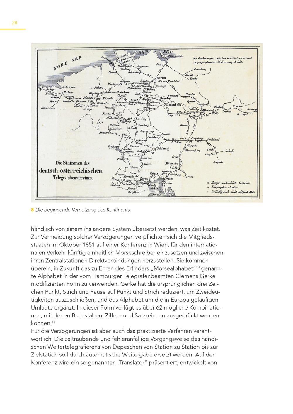 28 8 Die beginnende Vernetzung des Kontinents. händisch von einem ins andere System übersetzt werden, was Zeit kostet. Zur Vermeidung solcher Verzögerungen verpflichten sich die Mitgliedsstaaten im Oktober 1851 auf einer Konferenz in Wien, für den internationalen Verkehr künftig einheitlich Morseschreiber einzusetzen und zwischen ihren Zentralstationen Direktverbindungen herzustellen. Sie kommen überein, in Zukunft das zu Ehren des Erfinders„Morsealphabet“ 10 genannte Alphabet in der vom Hamburger Telegrafenbeamten Clemens Gerke modifizierten Form zu verwenden. Gerke hat die ursprünglichen drei Zeichen Punkt, Strich und Pause auf Punkt und Strich reduziert, um Zweideutigkeiten auszuschließen, und das Alphabet um die in Europa geläufigen Umlaute ergänzt. In dieser Form verfügt es über 62 mögliche Kombinationen, mit denen Buchstaben, Ziffern und Satzzeichen ausgedrückt werden können. 11 Für die Verzögerungen ist aber auch das praktizierte Verfahren verantwortlich. Die zeitraubende und fehleranfällige Vorgangsweise des händischen Weitertelegrafierens von Depeschen von Station zu Station bis zur Zielstation soll durch automatische Weitergabe ersetzt werden. Auf der Konferenz wird ein so genannter„Translator“ präsentiert, entwickelt von