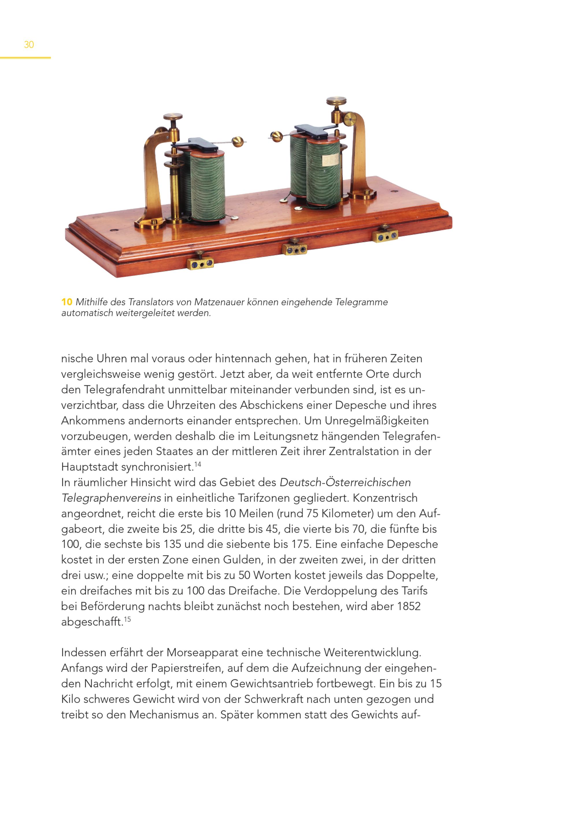 30 10 Mithilfe des Translators von Matzenauer können eingehende Telegramme automatisch weitergeleitet werden. nische Uhren mal voraus oder hintennach gehen, hat in früheren Zeiten vergleichsweise wenig gestört. Jetzt aber, da weit entfernte Orte durch den Telegrafendraht unmittelbar miteinander verbunden sind, ist es unverzichtbar, dass die Uhrzeiten des Abschickens einer Depesche und ihres Ankommens andernorts einander entsprechen. Um Unregelmäßigkeiten vorzubeugen, werden deshalb die im Leitungsnetz hängenden Telegrafenämter eines jeden Staates an der mittleren Zeit ihrer Zentralstation in der Hauptstadt synchronisiert. 14 In räumlicher Hinsicht wird das Gebiet des Deutsch-Österreichischen Telegraphenvereins in einheitliche Tarifzonen gegliedert. Konzentrisch angeordnet, reicht die erste bis 10 Meilen(rund 75 Kilometer) um den Aufgabeort, die zweite bis 25, die dritte bis 45, die vierte bis 70, die fünfte bis 100, die sechste bis 135 und die siebente bis 175. Eine einfache Depesche kostet in der ersten Zone einen Gulden, in der zweiten zwei, in der dritten drei usw.; eine doppelte mit bis zu 50 Worten kostet jeweils das Doppelte, ein dreifaches mit bis zu 100 das Dreifache. Die Verdoppelung des Tarifs bei Beförderung nachts bleibt zunächst noch bestehen, wird aber 1852 abgeschafft. 15 Indessen erfährt der Morseapparat eine technische Weiterentwicklung. Anfangs wird der Papierstreifen, auf dem die Aufzeichnung der eingehenden Nachricht erfolgt, mit einem Gewichtsantrieb fortbewegt. Ein bis zu 15 Kilo schweres Gewicht wird von der Schwerkraft nach unten gezogen und treibt so den Mechanismus an. Später kommen statt des Gewichts auf-