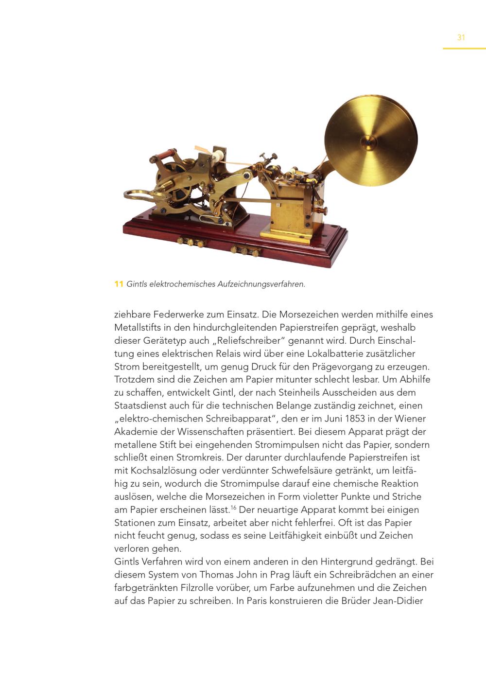 31 11 Gintls elektrochemisches Aufzeichnungsverfahren. ziehbare Federwerke zum Einsatz. Die Morsezeichen werden mithilfe eines Metallstifts in den hindurchgleitenden Papierstreifen geprägt, weshalb dieser Gerätetyp auch„Reliefschreiber“ genannt wird. Durch Einschaltung eines elektrischen Relais wird über eine Lokalbatterie zusätzlicher Strom bereitgestellt, um genug Druck für den Prägevorgang zu erzeugen. Trotzdem sind die Zeichen am Papier mitunter schlecht lesbar. Um Abhilfe zu schaffen, entwickelt Gintl, der nach Steinheils Ausscheiden aus dem Staatsdienst auch für die technischen Belange zuständig zeichnet, einen „elektro-chemischen Schreibapparat“, den er im Juni 1853 in der Wiener Akademie der Wissenschaften präsentiert. Bei diesem Apparat prägt der metallene Stift bei eingehenden Stromimpulsen nicht das Papier, sondern schließt einen Stromkreis. Der darunter durchlaufende Papierstreifen ist mit Kochsalzlösung oder verdünnter Schwefelsäure getränkt, um leitfähig zu sein, wodurch die Stromimpulse darauf eine chemische Reaktion auslösen, welche die Morsezeichen in Form violetter Punkte und Striche am Papier erscheinen lässt. 16 Der neuartige Apparat kommt bei einigen Stationen zum Einsatz, arbeitet aber nicht fehlerfrei. Oft ist das Papier nicht feucht genug, sodass es seine Leitfähigkeit einbüßt und Zeichen verloren gehen. Gintls Verfahren wird von einem anderen in den Hintergrund gedrängt. Bei diesem System von Thomas John in Prag läuft ein Schreibrädchen an einer farbgetränkten Filzrolle vorüber, um Farbe aufzunehmen und die Zeichen auf das Papier zu schreiben. In Paris konstruieren die Brüder Jean-Didier