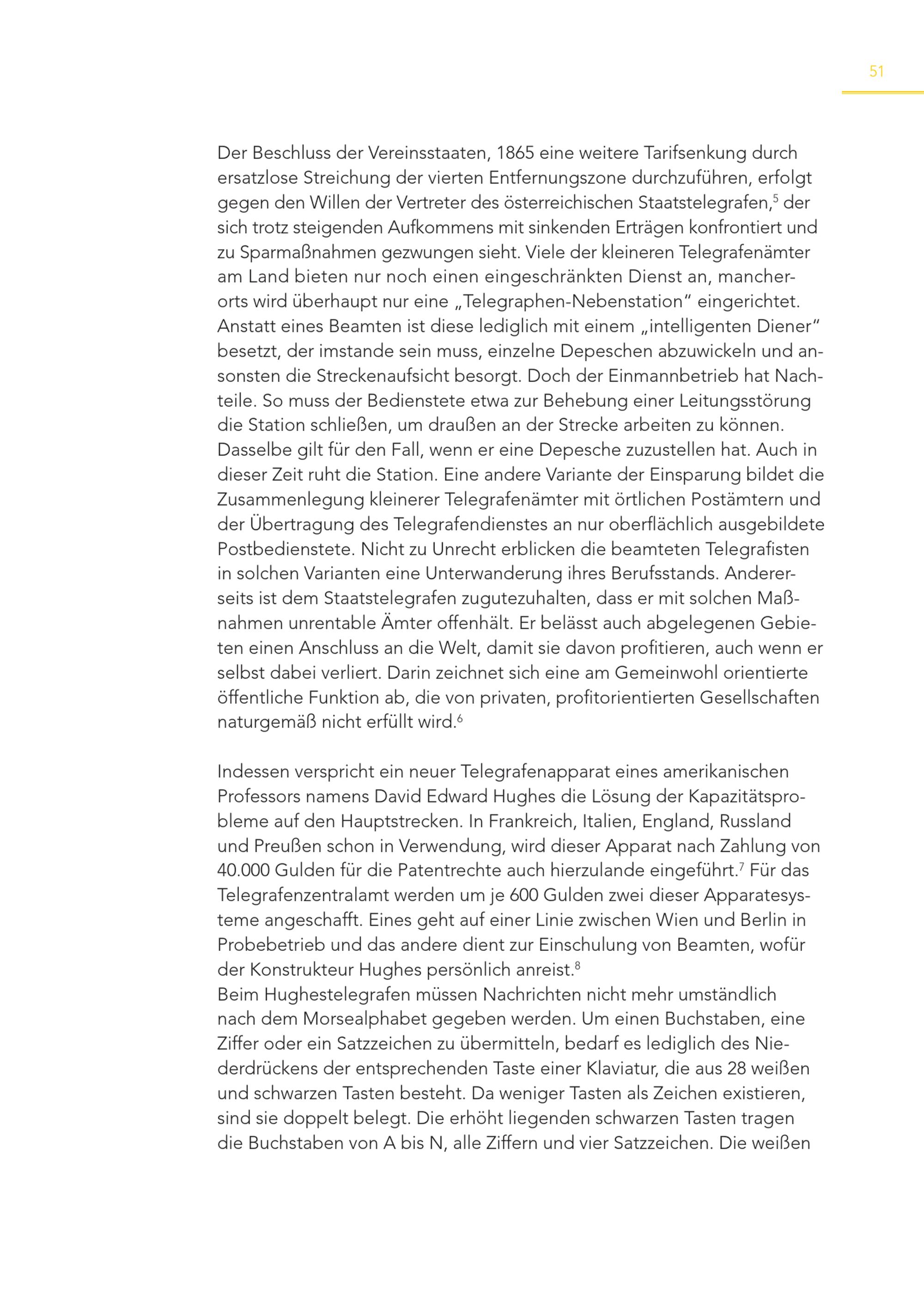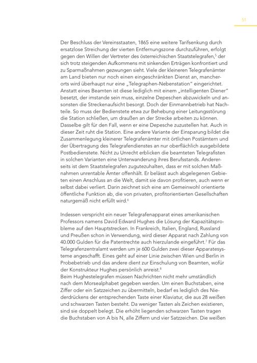 51 Der Beschluss der Vereinsstaaten, 1865 eine weitere Tarifsenkung durch ersatzlose Streichung der vierten Entfernungszone durchzuführen, erfolgt gegen den Willen der Vertreter des österreichischen Staatstelegrafen, 5 der sich trotz steigenden Aufkommens mit sinkenden Erträgen konfrontiert und zu Sparmaßnahmen gezwungen sieht. Viele der kleineren Telegrafenämter am Land bieten nur noch einen eingeschränkten Dienst an, mancherorts wird überhaupt nur eine„Telegraphen-Nebenstation“ eingerichtet. Anstatt eines Beamten ist diese lediglich mit einem„intelligenten Diener“ besetzt, der imstande sein muss, einzelne Depeschen abzuwickeln und ansonsten die Streckenaufsicht besorgt. Doch der Einmannbetrieb hat Nachteile. So muss der Bedienstete etwa zur Behebung einer Leitungsstörung die Station schließen, um draußen an der Strecke arbeiten zu können. Dasselbe gilt für den Fall, wenn er eine Depesche zuzustellen hat. Auch in dieser Zeit ruht die Station. Eine andere Variante der Einsparung bildet die Zusammenlegung kleinerer Telegrafenämter mit örtlichen Postämtern und der Übertragung des Telegrafendienstes an nur oberflächlich ausgebildete Postbedienstete. Nicht zu Unrecht erblicken die beamteten Telegrafisten in solchen Varianten eine Unterwanderung ihres Berufsstands. Andererseits ist dem Staatstelegrafen zugutezuhalten, dass er mit solchen Maßnahmen unrentable Ämter offenhält. Er belässt auch abgelegenen Gebieten einen Anschluss an die Welt, damit sie davon profitieren, auch wenn er selbst dabei verliert. Darin zeichnet sich eine am Gemeinwohl orientierte öffentliche Funktion ab, die von privaten, profitorientierten Gesellschaften naturgemäß nicht erfüllt wird. 6 Indessen verspricht ein neuer Telegrafenapparat eines amerikanischen Professors namens David Edward Hughes die Lösung der Kapazitätsprobleme auf den Hauptstrecken. In Frankreich, Italien, England, Russland und Preußen schon in Verwendung, wird dieser Apparat nach Zahlung von 40.000 Gulden für die Patentrechte auch hierzulande eingeführt. 7 Für das Telegrafenzentralamt werden um je 600 Gulden zwei dieser Apparatesysteme angeschafft. Eines geht auf einer Linie zwischen Wien und Berlin in Probebetrieb und das andere dient zur Einschulung von Beamten, wofür der Konstrukteur Hughes persönlich anreist. 8 Beim Hughestelegrafen müssen Nachrichten nicht mehr umständlich nach dem Morsealphabet gegeben werden. Um einen Buchstaben, eine Ziffer oder ein Satzzeichen zu übermitteln, bedarf es lediglich des Niederdrückens der entsprechenden Taste einer Klaviatur, die aus 28 weißen und schwarzen Tasten besteht. Da weniger Tasten als Zeichen existieren, sind sie doppelt belegt. Die erhöht liegenden schwarzen Tasten tragen die Buchstaben von A bis N, alle Ziffern und vier Satzzeichen. Die weißen