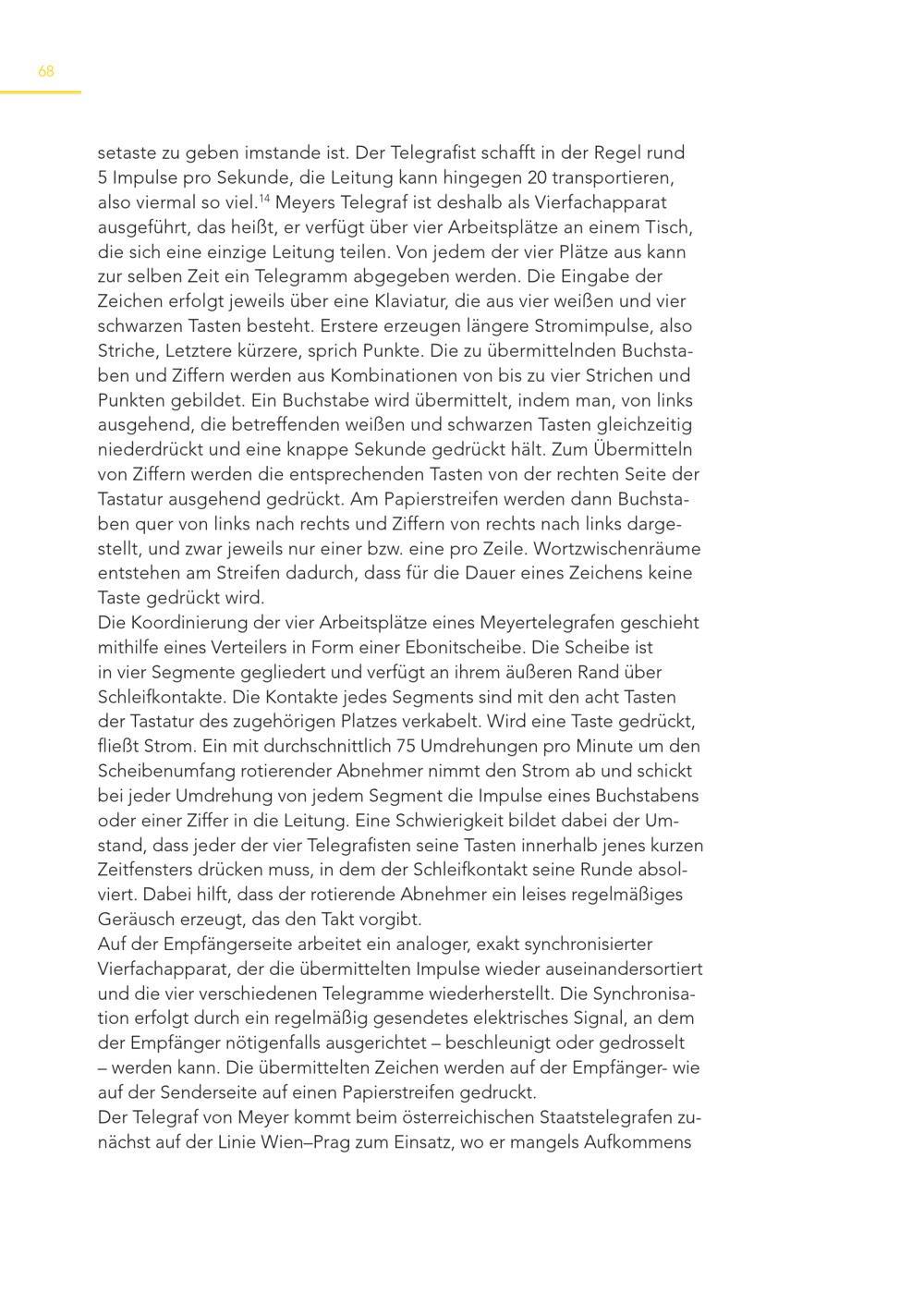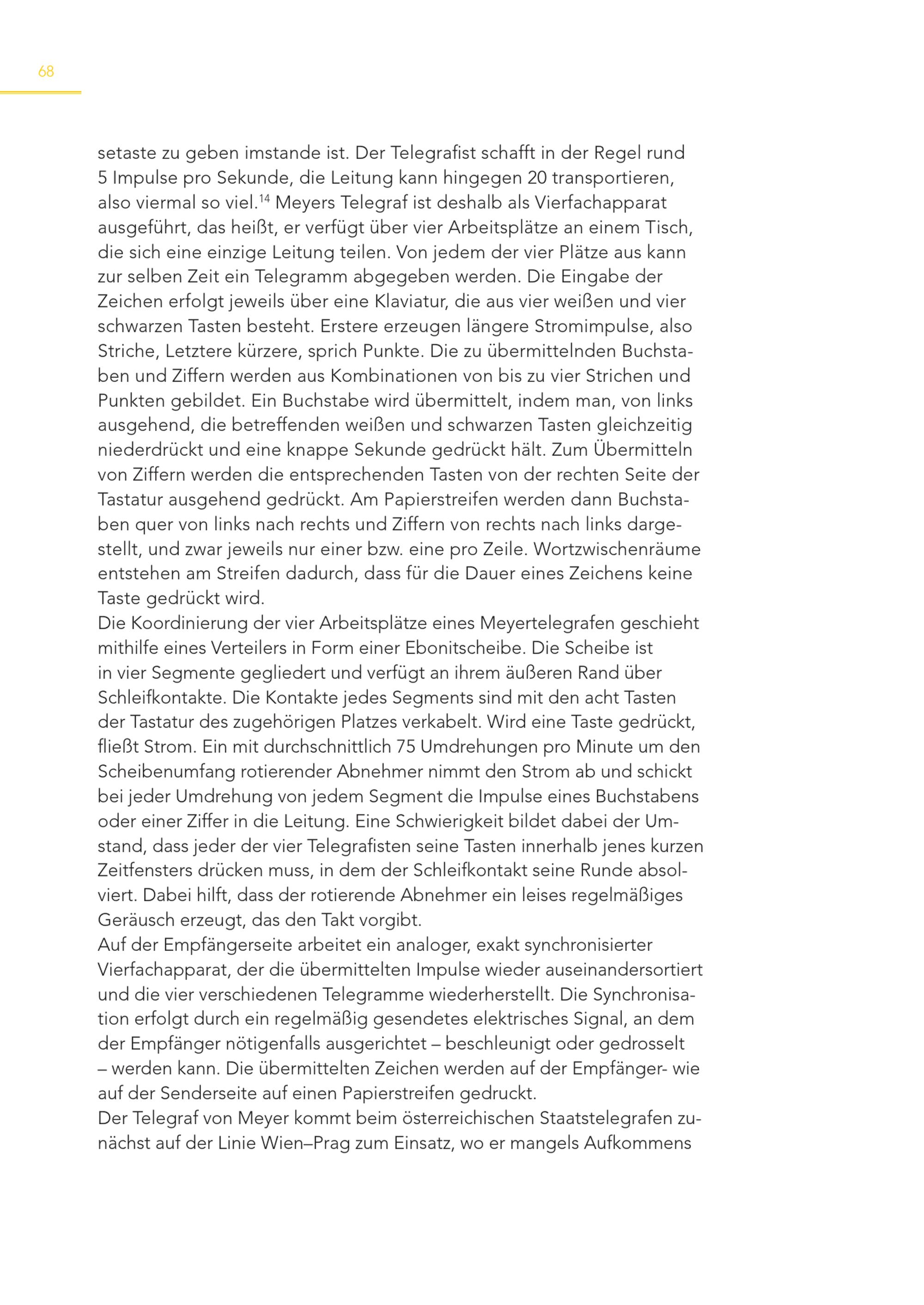 68 setaste zu geben imstande ist. Der Telegrafist schafft in der Regel rund 5 Impulse pro Sekunde, die Leitung kann hingegen 20 transportieren, also viermal so viel. 14 Meyers Telegraf ist deshalb als Vierfachapparat ausgeführt, das heißt, er verfügt über vier Arbeitsplätze an einem Tisch, die sich eine einzige Leitung teilen. Von jedem der vier Plätze aus kann zur selben Zeit ein Telegramm abgegeben werden. Die Eingabe der Zeichen erfolgt jeweils über eine Klaviatur, die aus vier weißen und vier schwarzen Tasten besteht. Erstere erzeugen längere Stromimpulse, also Striche, Letztere kürzere, sprich Punkte. Die zu übermittelnden Buchstaben und Ziffern werden aus Kombinationen von bis zu vier Strichen und Punkten gebildet. Ein Buchstabe wird übermittelt, indem man, von links ausgehend, die betreffenden weißen und schwarzen Tasten gleichzeitig niederdrückt und eine knappe Sekunde gedrückt hält. Zum Übermitteln von Ziffern werden die entsprechenden Tasten von der rechten Seite der Tastatur ausgehend gedrückt. Am Papierstreifen werden dann Buchstaben quer von links nach rechts und Ziffern von rechts nach links dargestellt, und zwar jeweils nur einer bzw. eine pro Zeile. Wortzwischenräume entstehen am Streifen dadurch, dass für die Dauer eines Zeichens keine Taste gedrückt wird. Die Koordinierung der vier Arbeitsplätze eines Meyertelegrafen geschieht mithilfe eines Verteilers in Form einer Ebonitscheibe. Die Scheibe ist in vier Segmente gegliedert und verfügt an ihrem äußeren Rand über Schleifkontakte. Die Kontakte jedes Segments sind mit den acht Tasten der Tastatur des zugehörigen Platzes verkabelt. Wird eine Taste gedrückt, fließt Strom. Ein mit durchschnittlich 75 Umdrehungen pro Minute um den Scheibenumfang rotierender Abnehmer nimmt den Strom ab und schickt bei jeder Umdrehung von jedem Segment die Impulse eines Buchstabens oder einer Ziffer in die Leitung. Eine Schwierigkeit bildet dabei der Umstand, dass jeder der vier Telegrafisten seine Tasten innerhalb jenes kurzen Zeitfensters drücken muss, in dem der Schleifkontakt seine Runde absolviert. Dabei hilft, dass der rotierende Abnehmer ein leises regelmäßiges Geräusch erzeugt, das den Takt vorgibt. Auf der Empfängerseite arbeitet ein analoger, exakt synchronisierter Vierfachapparat, der die übermittelten Impulse wieder auseinandersortiert und die vier verschiedenen Telegramme wiederherstellt. Die Synchronisation erfolgt durch ein regelmäßig gesendetes elektrisches Signal, an dem der Empfänger nötigenfalls ausgerichtet – beschleunigt oder gedrosselt – werden kann. Die übermittelten Zeichen werden auf der Empfänger- wie auf der Senderseite auf einen Papierstreifen gedruckt. Der Telegraf von Meyer kommt beim österreichischen Staatstelegrafen zunächst auf der Linie Wien–Prag zum Einsatz, wo er mangels Aufkommens