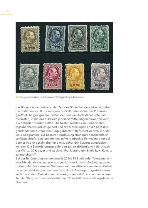 70 26 Telegrafenmarken verschiedener Wertigkeit zum Aufkleben. der Börse, die nur während der Zeit des Börsenhandels arbeitet, haben die Stationen von 8 Uhr morgens bis 9 Uhr abends für das Publikum geöffnet. An geeigneten Plätzen der inneren Stadt stehen rote Sammelkästen, in die das Publikum jederzeit Mitteilungen einwerfen kann, die befördert werden sollen. Die Kästen werden von Bediensteten tagsüber halbstündlich geleert und die Mitteilungen an die nächstliegende Station zur Weiterleitung gebracht. 22 Befördert werden in erster Linie Telegramme, zur besseren Auslastung aber auch handschriftlich verfasste Briefe. Letztere können auf vorgedruckte Formulare oder auf dünnes Papier geschrieben und in zugehörigen Kuverts aufgegeben werden. Die Beförderungsgebühr beträgt, unabhängig von der Anzahl der Worte, 20 Kreuzer und ist durch Frankierung der Briefe bzw. Kuverts zu entrichten. 23 Bei der Beförderung werden jeweils 20 bis 25 Briefe oder Telegramme in eine Metallpatrone gesteckt und per Luftdruck durch die Leitung transportiert. An den einzelnen Stationen werden Mitteilungen, deren Zieladressen erreicht sind, entnommen und durch Austräger zugestellt – wenn auch nur in dem Gebiet innerhalb des„Linienwalls“, also nur im inneren Teil der Stadt, nicht in den Vorstädten. 24 Dies hält die Zustellungsdauer in Grenzen.